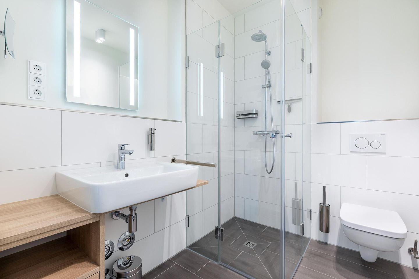 Das Apartment besticht nicht nur durch viel Platz, sondern auch durch den Luxus von zwei exklusiven Badezimmern: Eines mit ebenerdiger Dusche, das andere mit einer entspannenden Badewanne – ideal für erholsame Momente nach einem Tag am Strand oder beim Erkunden der Umgebung. Beide Bäder sind modern und stilvoll gestaltet, ausgestattet mit WC, Waschtisch, Kosmetikspiegel, Handtuchheizkörper, Fußbodenheizung und Föhn – Komfort, der begeistert.