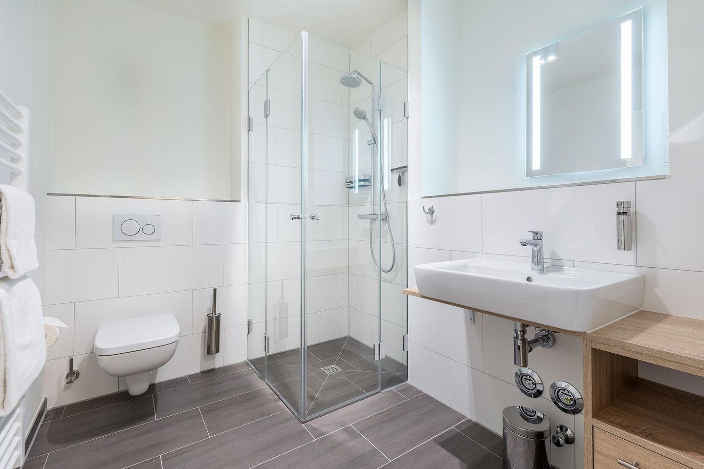 Ein besonderes Highlight ist die großzügige Wellnesslandschaft: Finnische Sauna, Biosauna, Dampfbad, Fußbäder, Erlebnisduschen, Eisbrunnen sowie Ruhezonen mit Kamin laden zum Entspannen ein. Während der Öffnungszeiten steht Ihnen der Spa-Bereich kostenfrei zur Verfügung. Wer keinen Bademantel dabei hat, kann sich diesen ebenso wie Saunatücher bequem gegen eine geringe Gebühr leihen. Ein Aufzug verbindet den Wellnessbereich mit allen Etagen, sodass Sie bequem zu Ihrer Wohnung gelangen können.