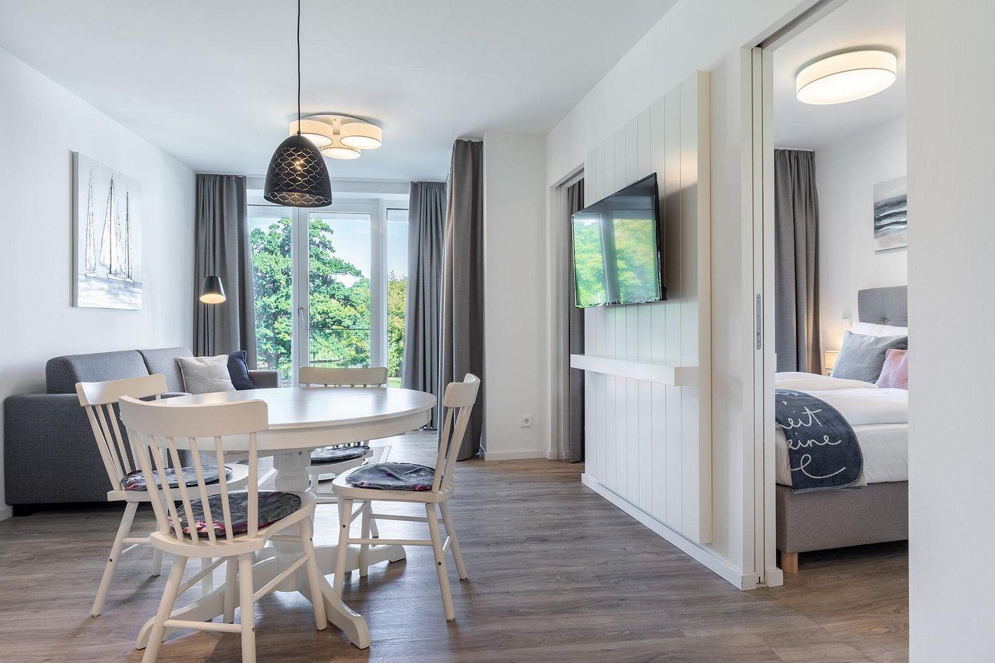 Das moderne Apartment 1.10 bietet auf 40 m² Platz für bis zu vier Personen und befindet sich nur 300 Meter vom Sandstrand entfernt. Zur Ausstattung zählen ein überdachter Balkon, eine offene Wohnküche, WLAN, zwei Fernseher, Sauna, Dampfbad und ein Privatparkplatz. Haustiere sind willkommen.