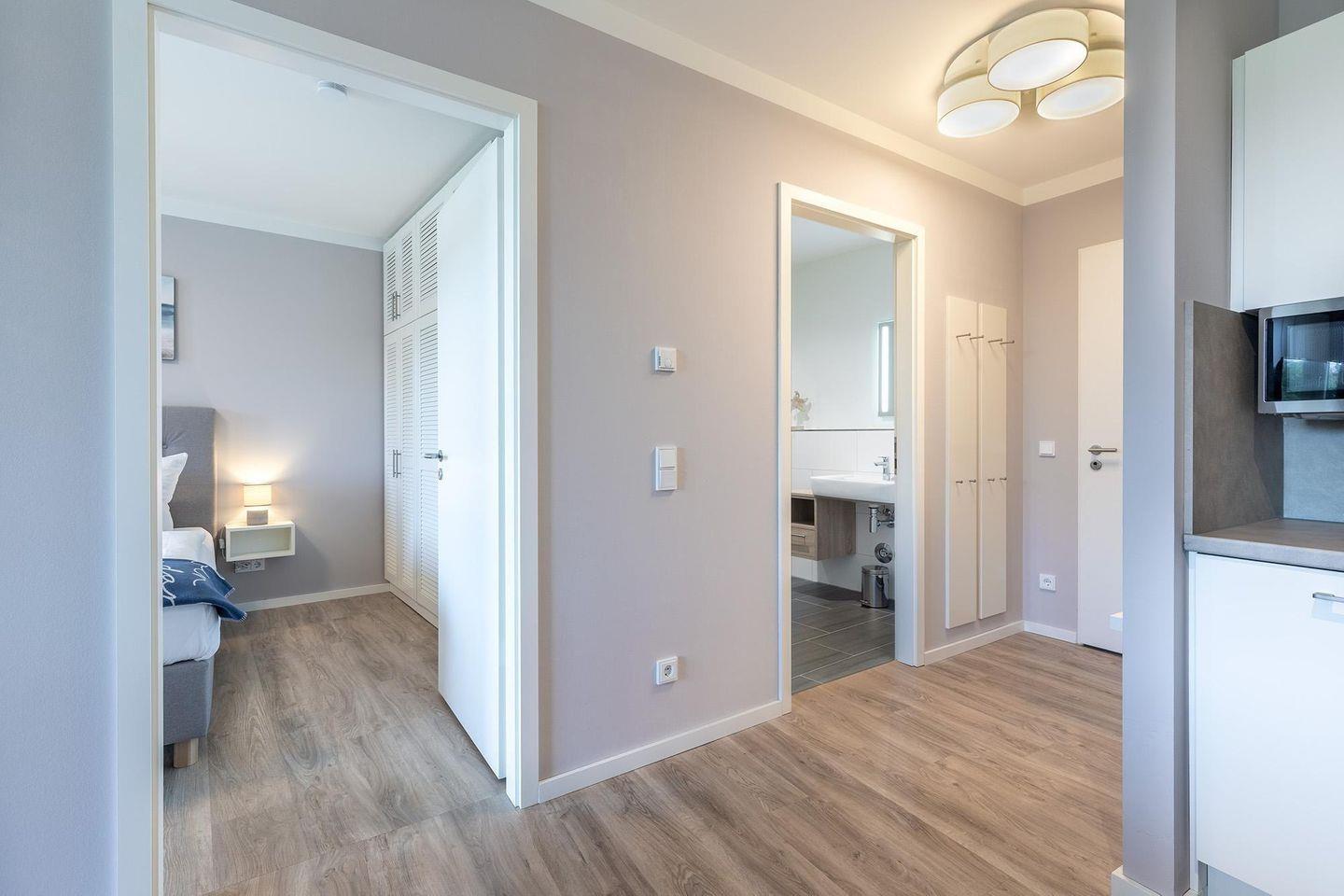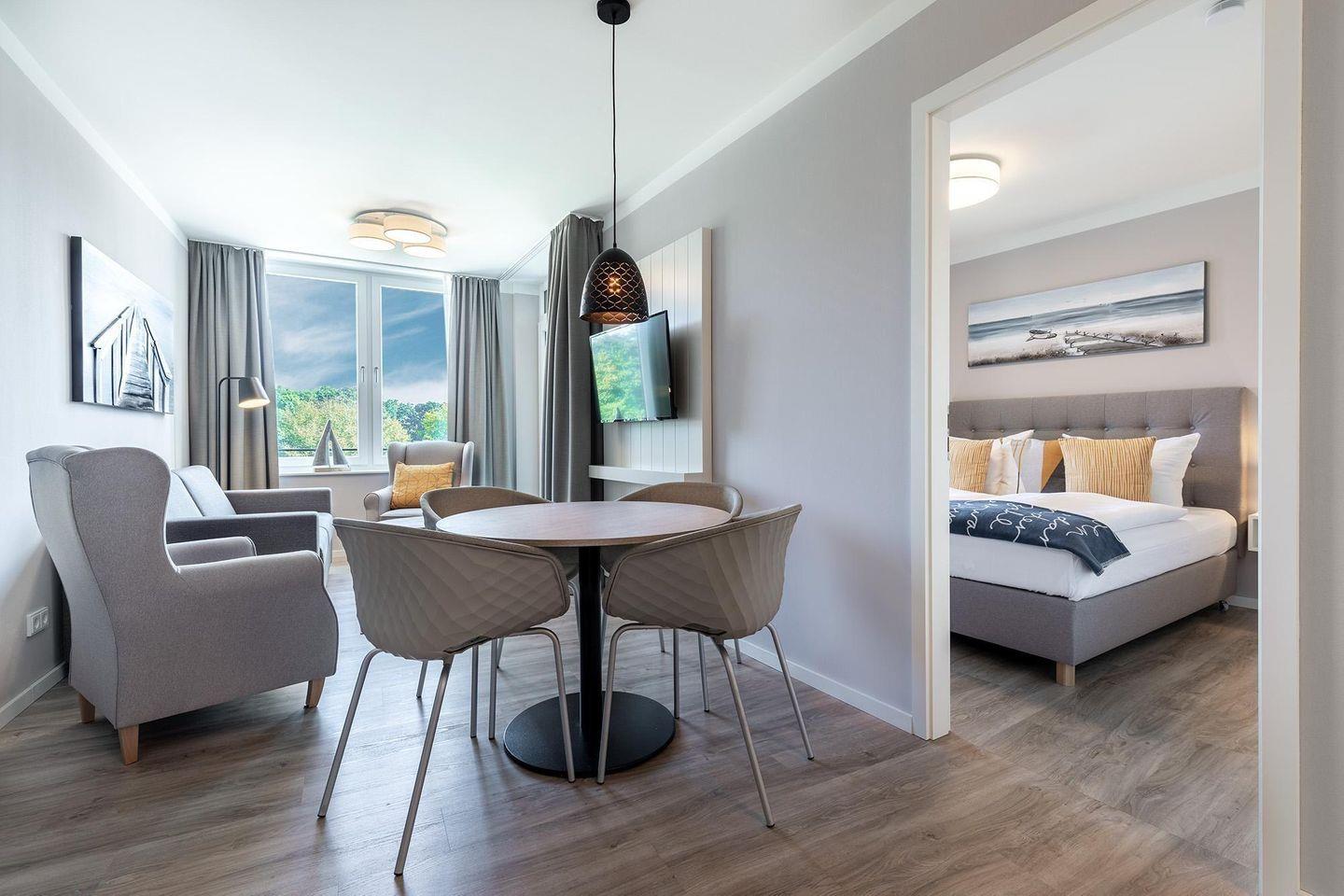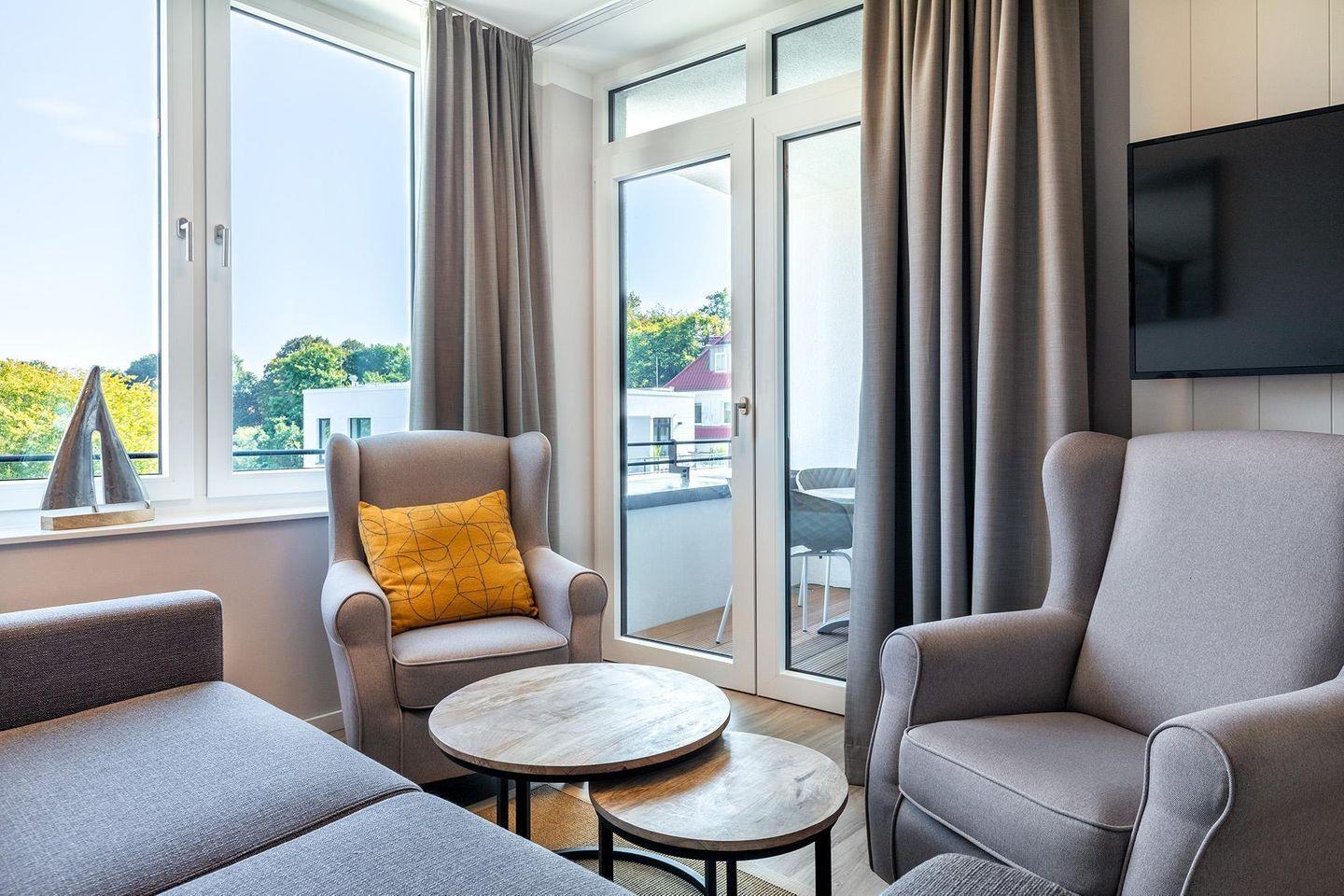 Modernes 2-Zimmer-Apartment in Travemünde mit Wellness, überdachtem Balkon und Strandnähe.