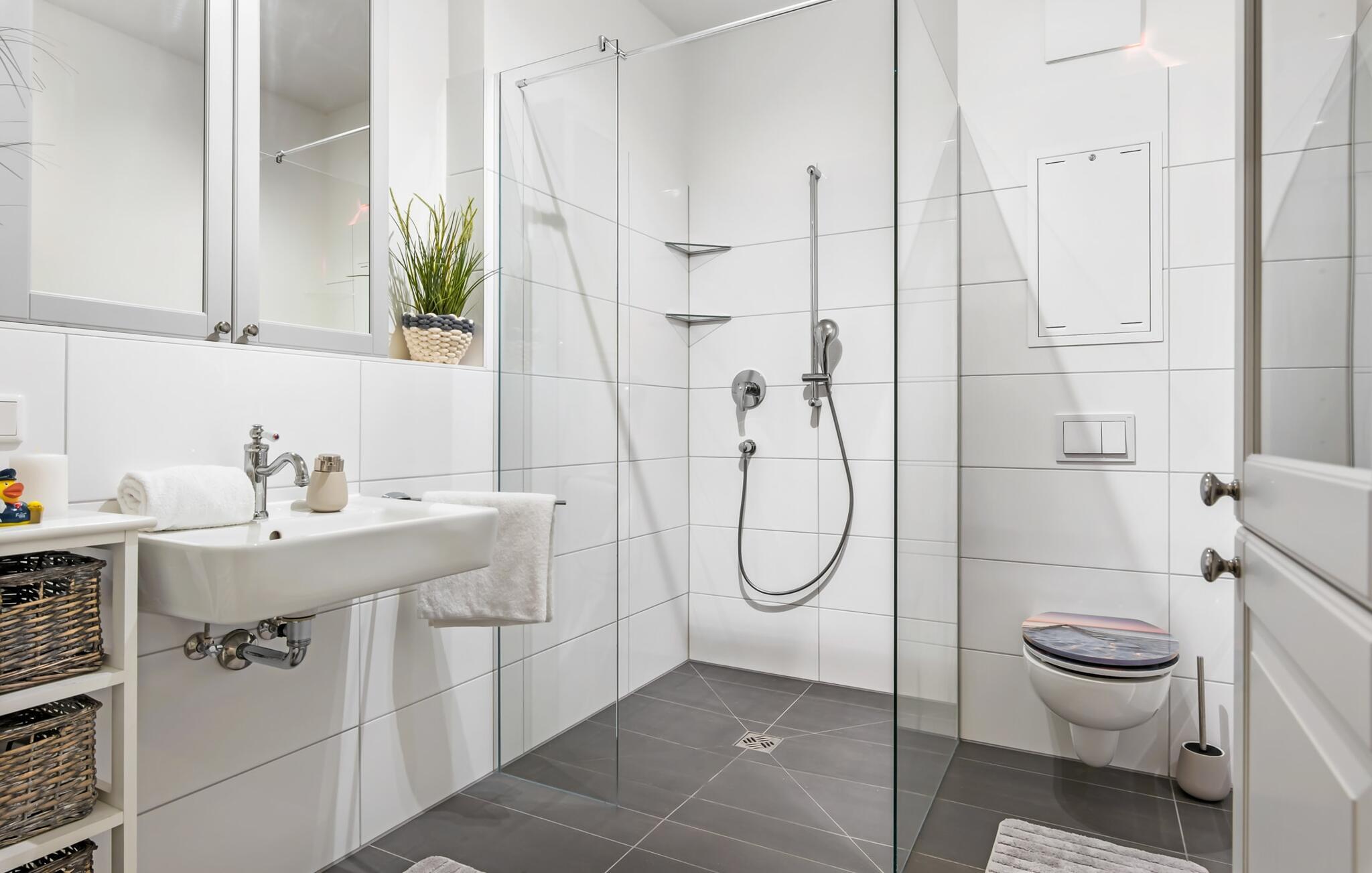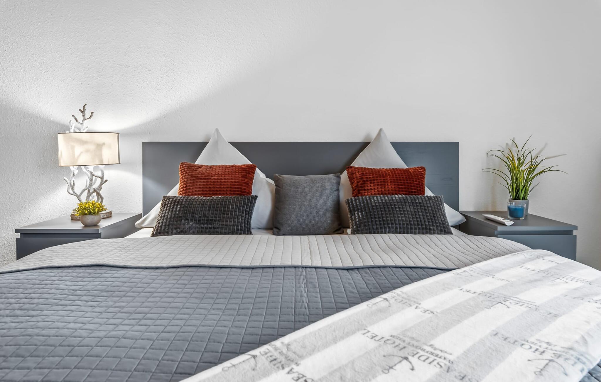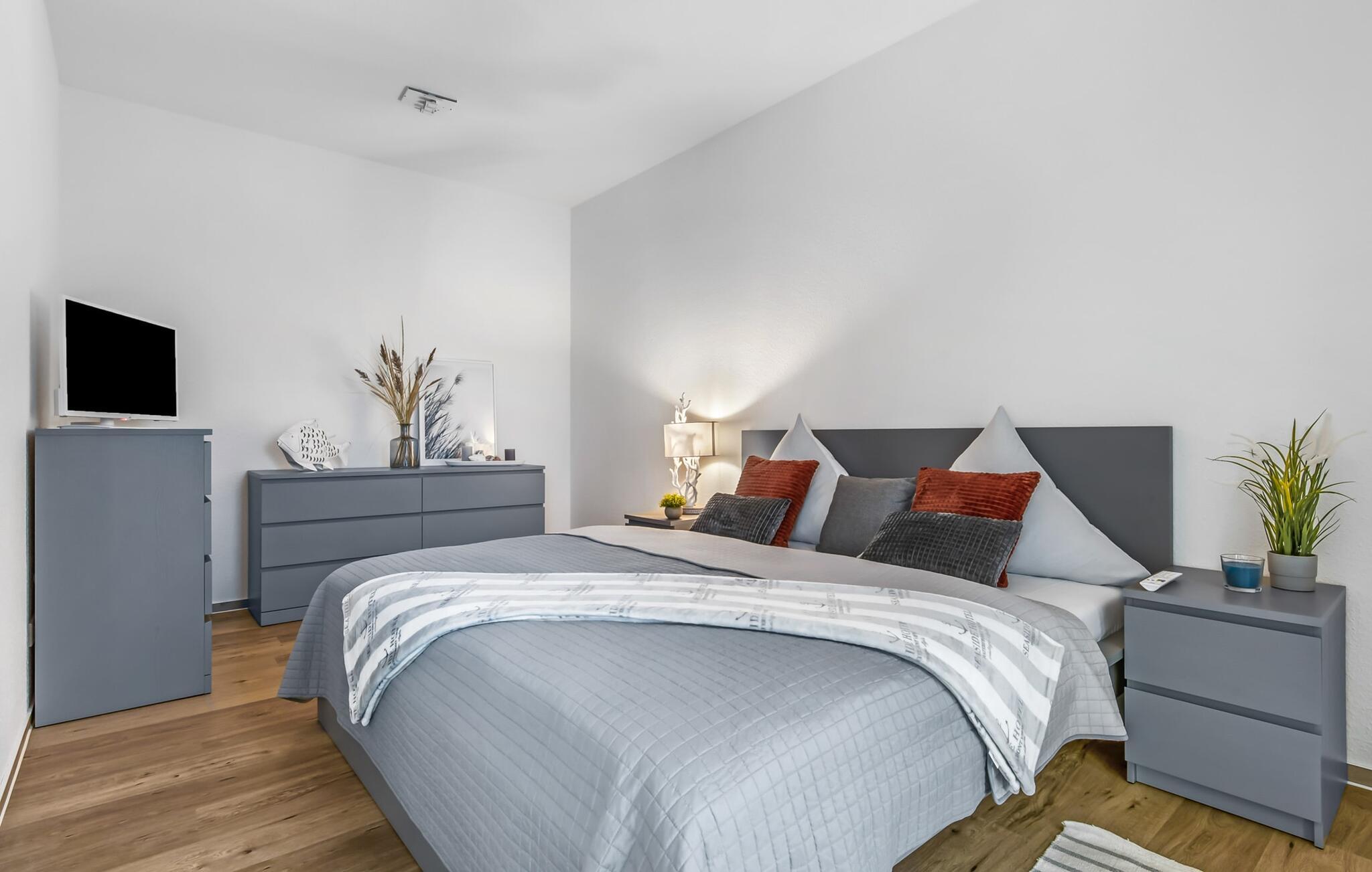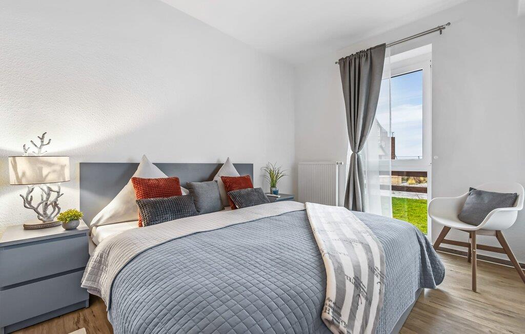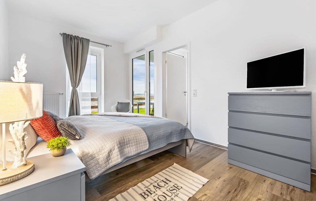 Die beiden Schlafzimmer sind mit hochwertigen Doppelbetten und Fernsehern ausgestattet und bieten direkten Zugang zur Terrasse. Das geräumige Badezimmer verwöhnt Sie mit einer bodengleichen Dusche und perfekter Ausstattung.