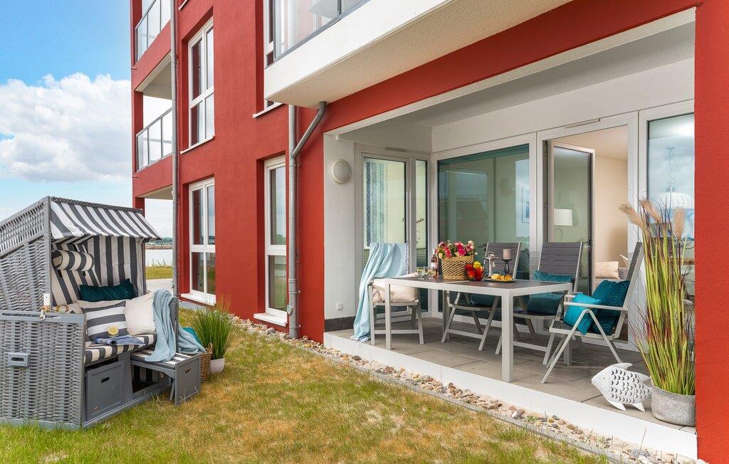 Genießen Sie die maritime Eleganz der Treibholz-Koje mit direktem Meerblick und privater Terrasse im OstseeResort Olpenitz.