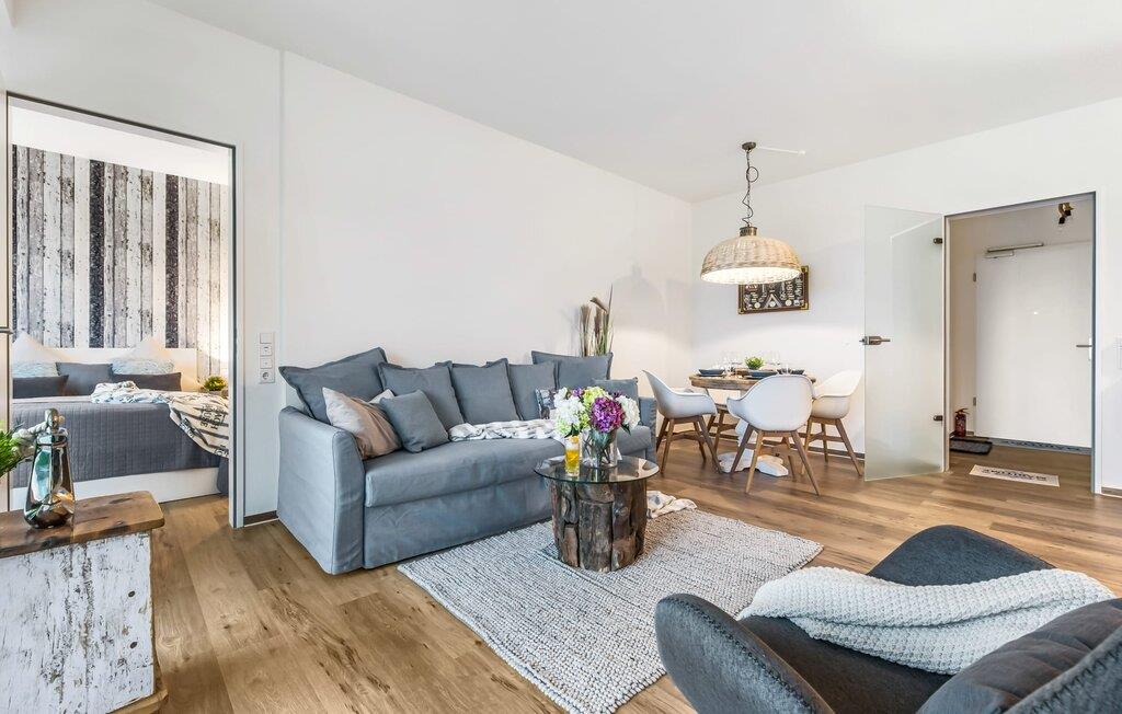 Die TREIBHOLZ-KOJE ist im maritimen Landhausstil eingerichtet und vereint Gemütlichkeit und Eleganz. Das bequeme Sofa im Wohnbereich verwandelt sich mühelos in ein Doppelbett und SKY TV sorgt für Unterhaltung. In der modernen Einbauküche mit Dunstabzugshaube können Sie gemeinsam kochen und gesellige Stunden verbringen.