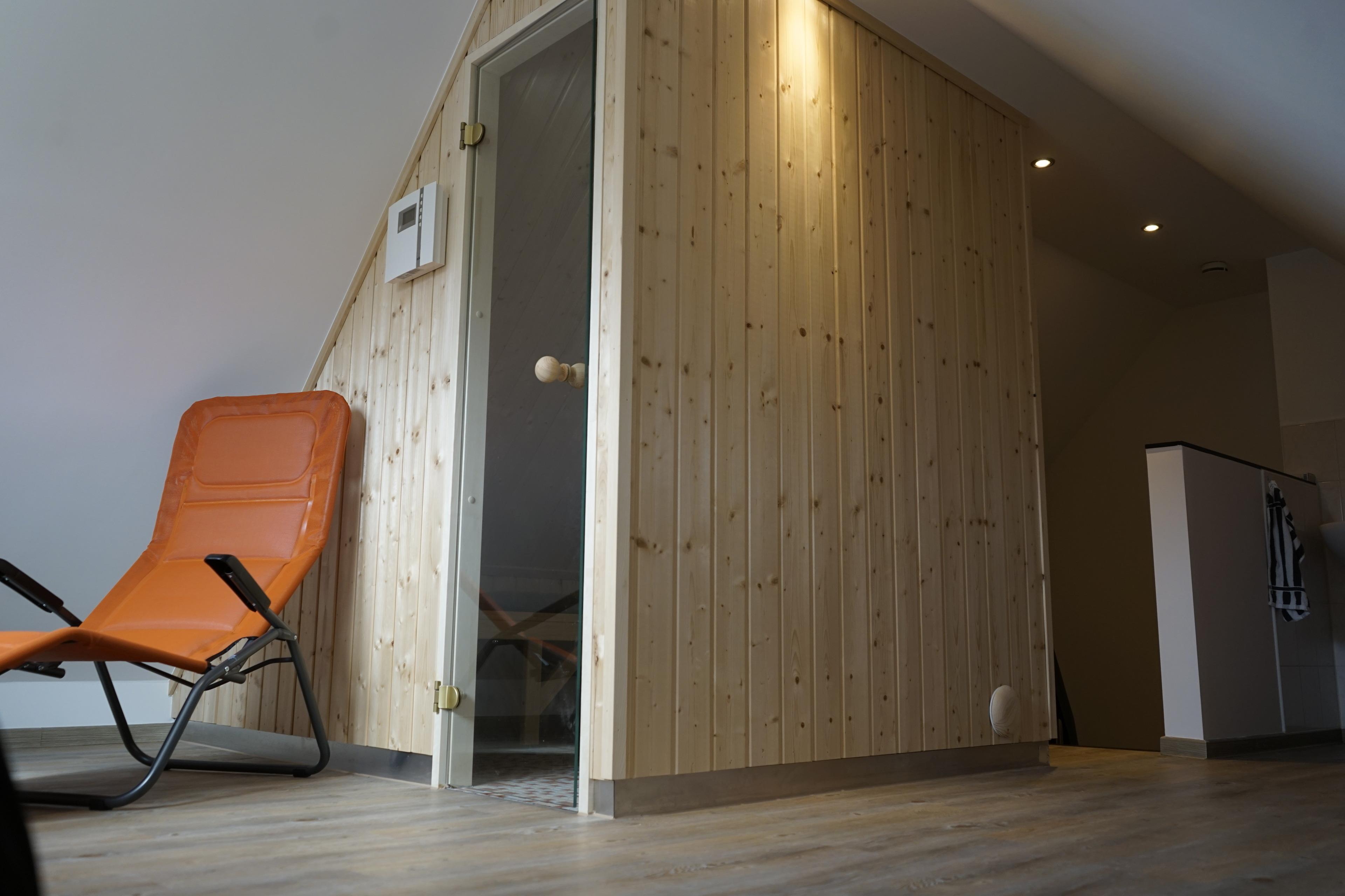 Im Dachgeschoss befinden sich eine Sauna für 4 Personen und Ruheliegen.