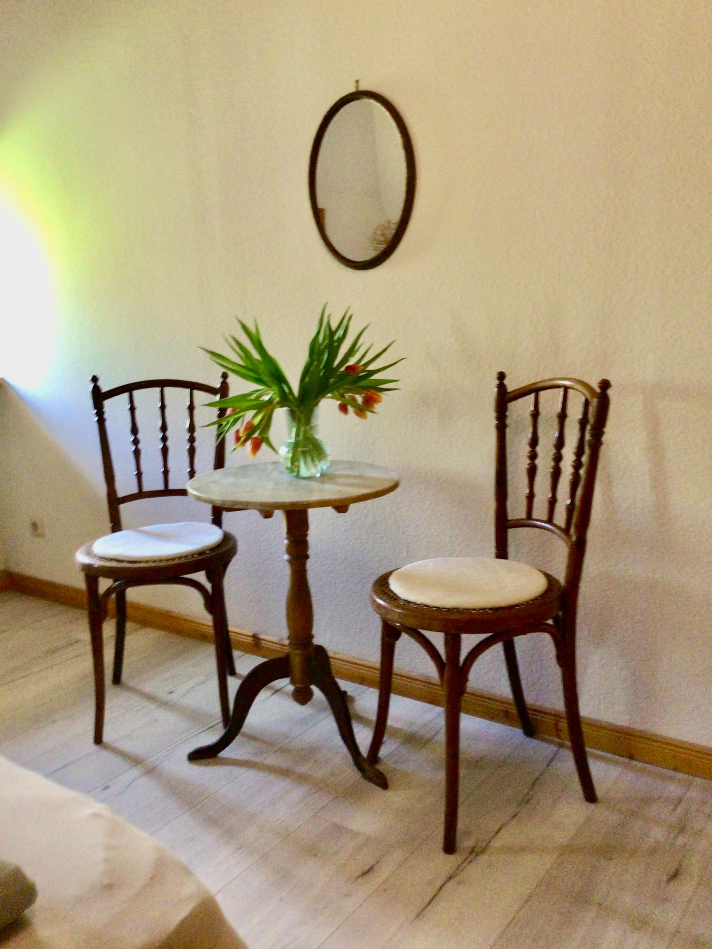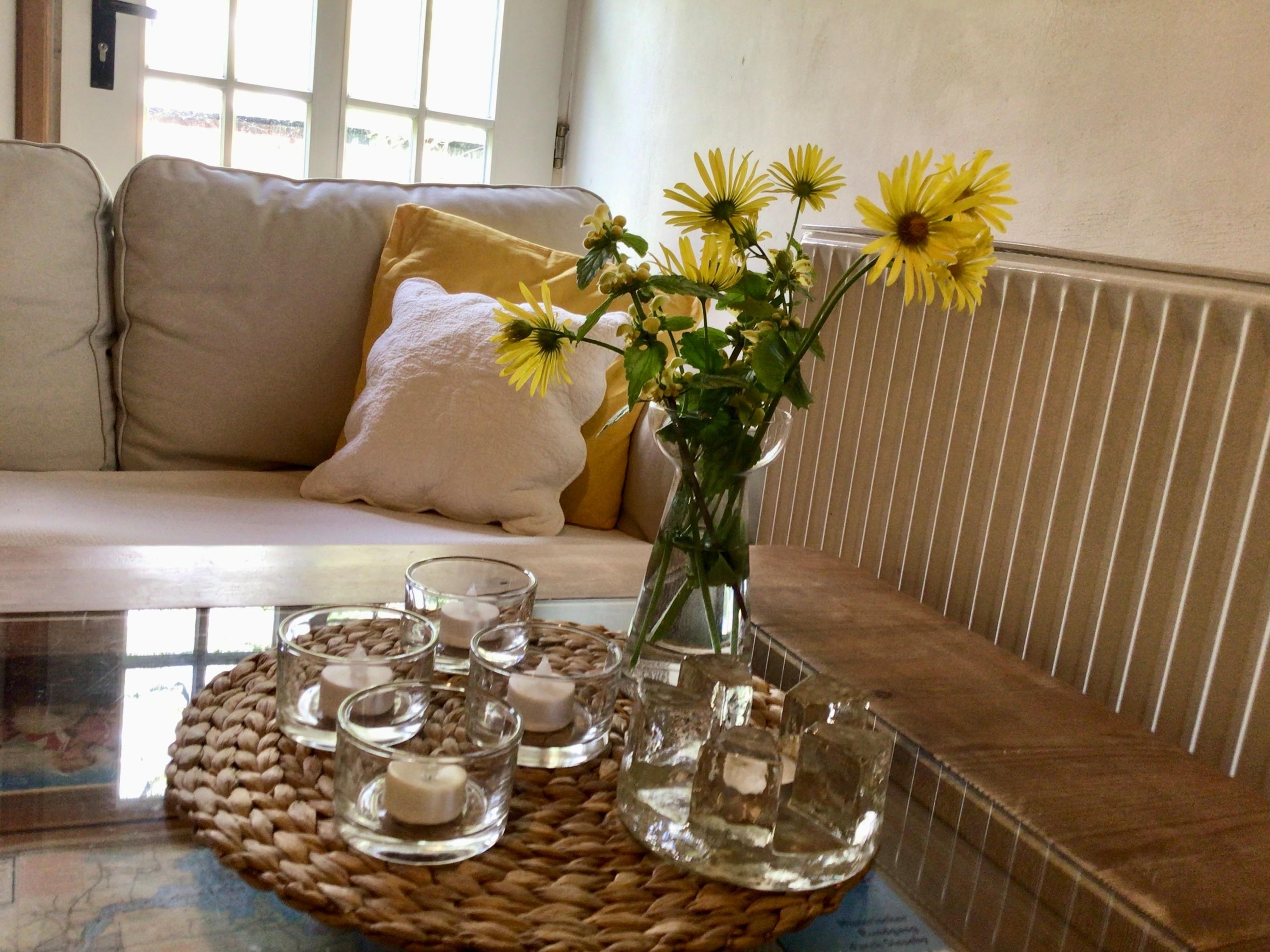 Ferienwohnung "Natur": Großer freundlicher Wohnraum mit Küchenzeile, 2 gemütlichen Sofas, einem Canape und einem Esstisch, auch mit Kinderstuhl. Ein Schlafzimmer für eine Person und ein Duschbad befinden sich ebenerdig. Im Obergeschoss liegen 2 Schlafräume für jeweils 2 Personen mit einem extra Kinderbett und das Vollbad. Die Wohnung ist nach ökologischen Gesichtspunkten erstellt und eingerichtet.