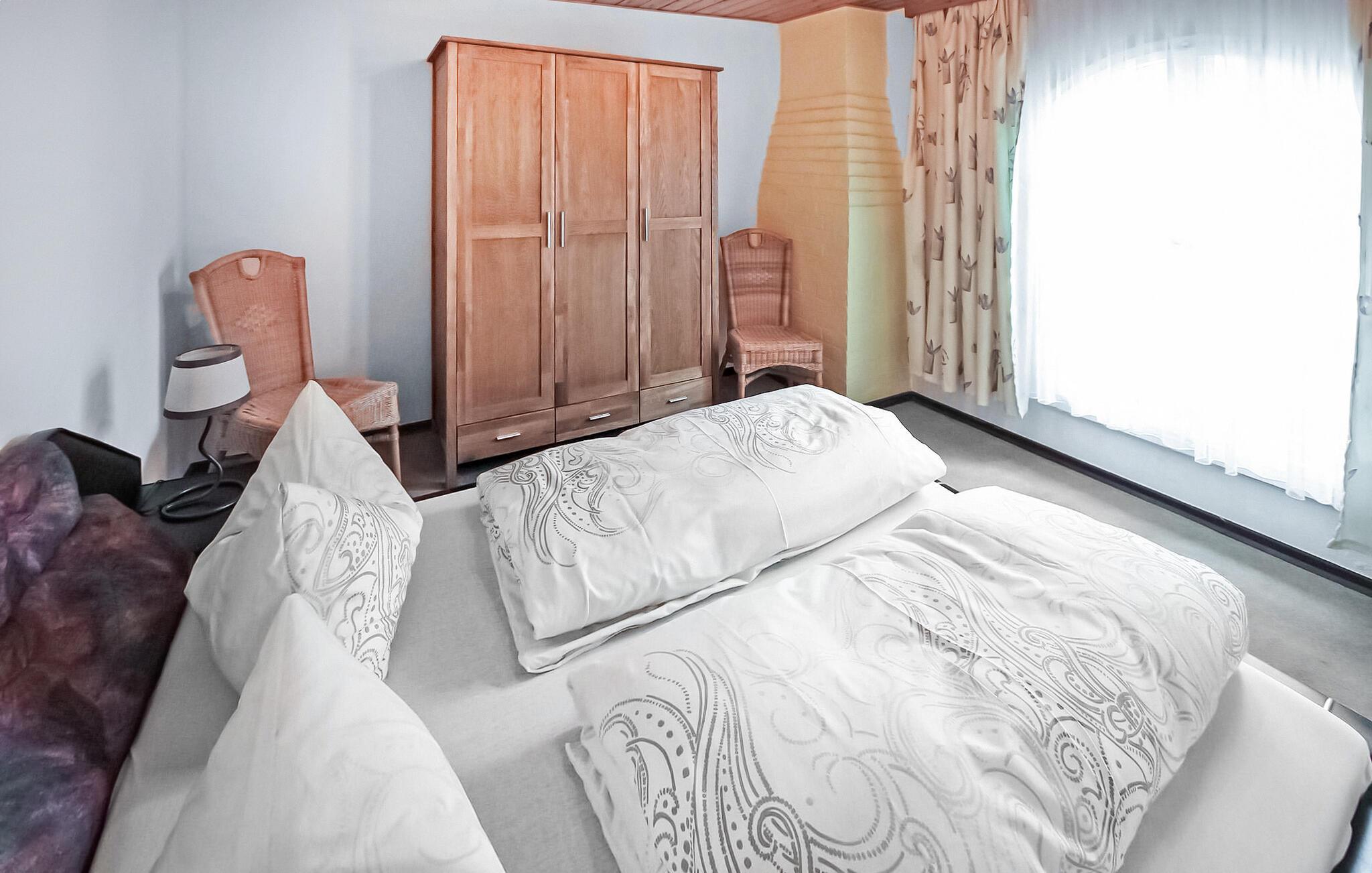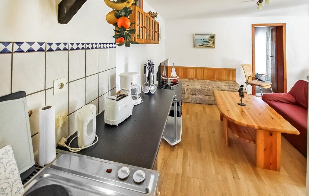 Dieses Ferienhaus ist ausgestattet mit Wohnzimmer (Eckcouch, Esstisch und Kaminofen), daran anschließend 1 Schlafzimmer mit Doppelbett, einem weiteren Schlafzimmer mit kleinem Doppelbett, Pantryküche, DU/WC, E-Heizung.