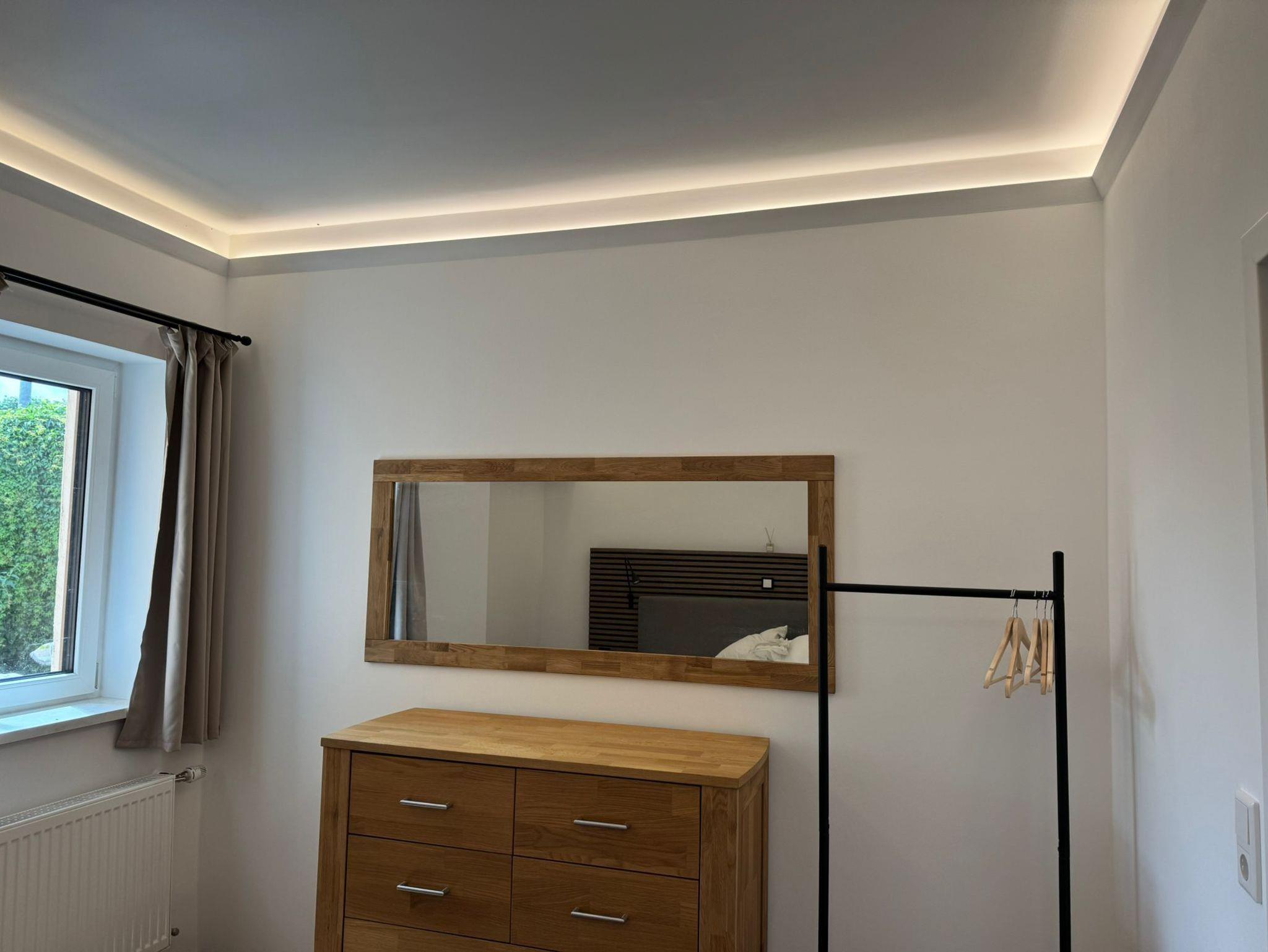 Schlafzimmer - Ruhe & Erholung: bequemes Boxspringbett mit Ambiente-Licht & Hintergrundbeleuchtung, Leselampen, Kommode & Kleiderständer, Verdunkelungsvorhänge & Thermo-Plissees für erholsamen Schlaf, Schallschutzfenster für angenehme Ruhe. Kinderbett auf Anfrage.