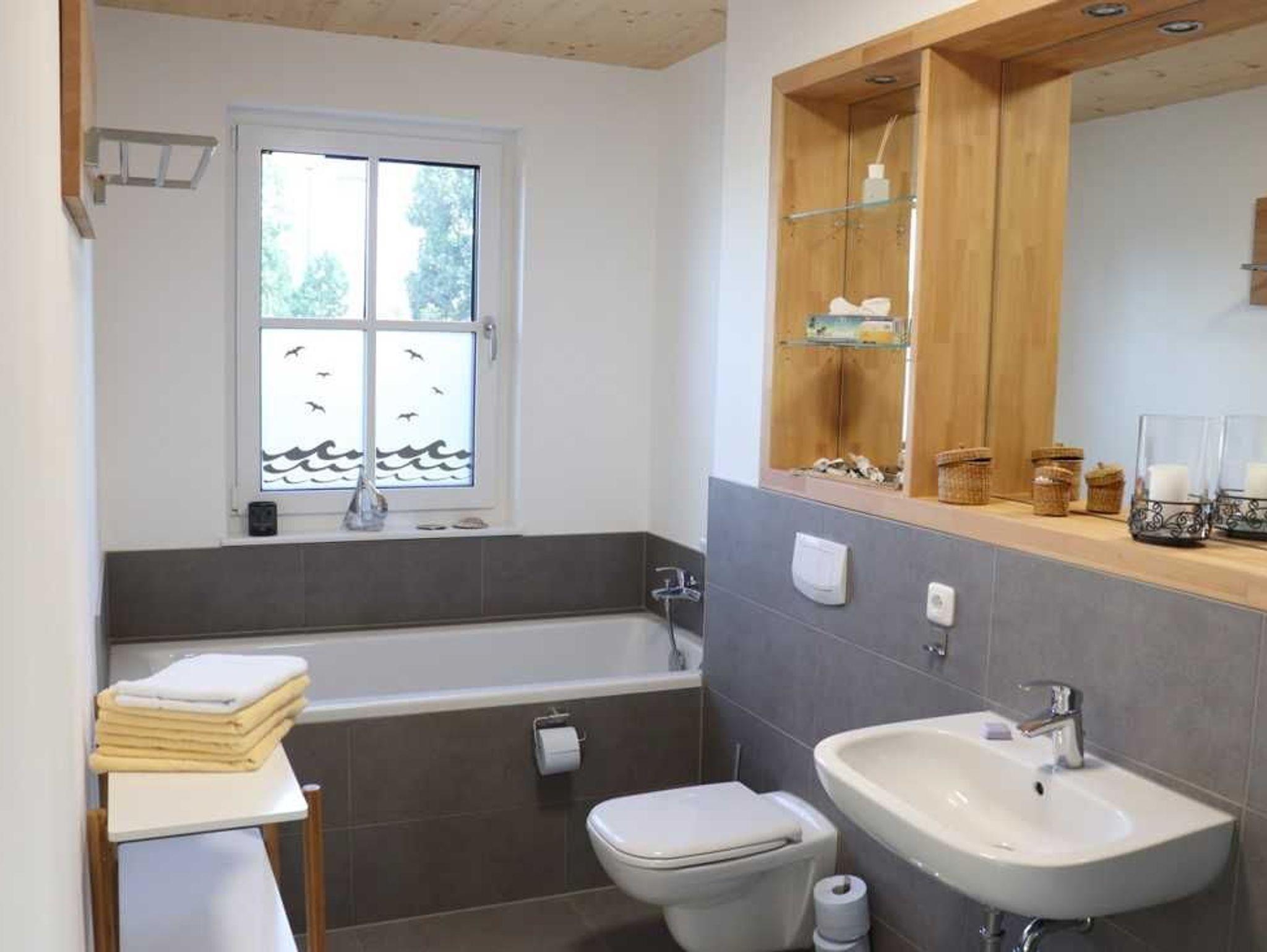 Für die Gäste, die sich etwas zurückziehen möchten, ist im 1. OG ein gemütliches Wohnzimmer, welches zum Lesen, Chatten oder auch Fernsehen einlädt, Sie durch die offene Treppe jedoch an der Gemeinsamkeit teilhaben lässt. Weiterhin befinden sich auch das Schlafzimmer mit zwei Einzelbetten sowie das Badezimmer mit Dusche und Badewanne hier.