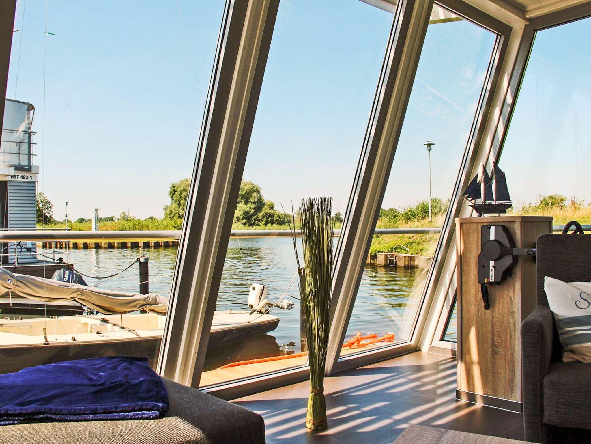 Erleben Sie maritimen Komfort im Floating House Xenia direkt am Wasser mit Terrasse und Panoramablick in Ueckermünde.