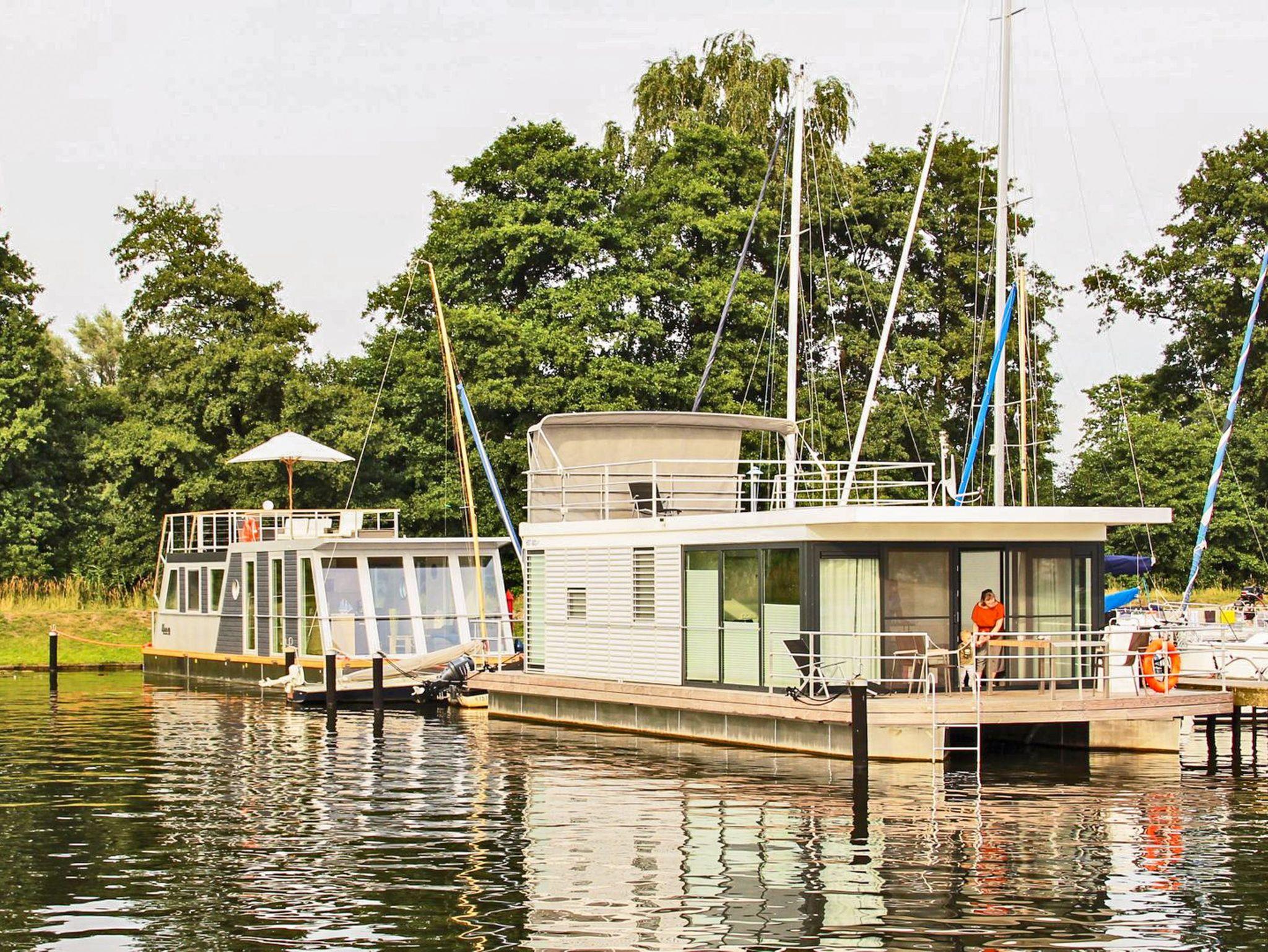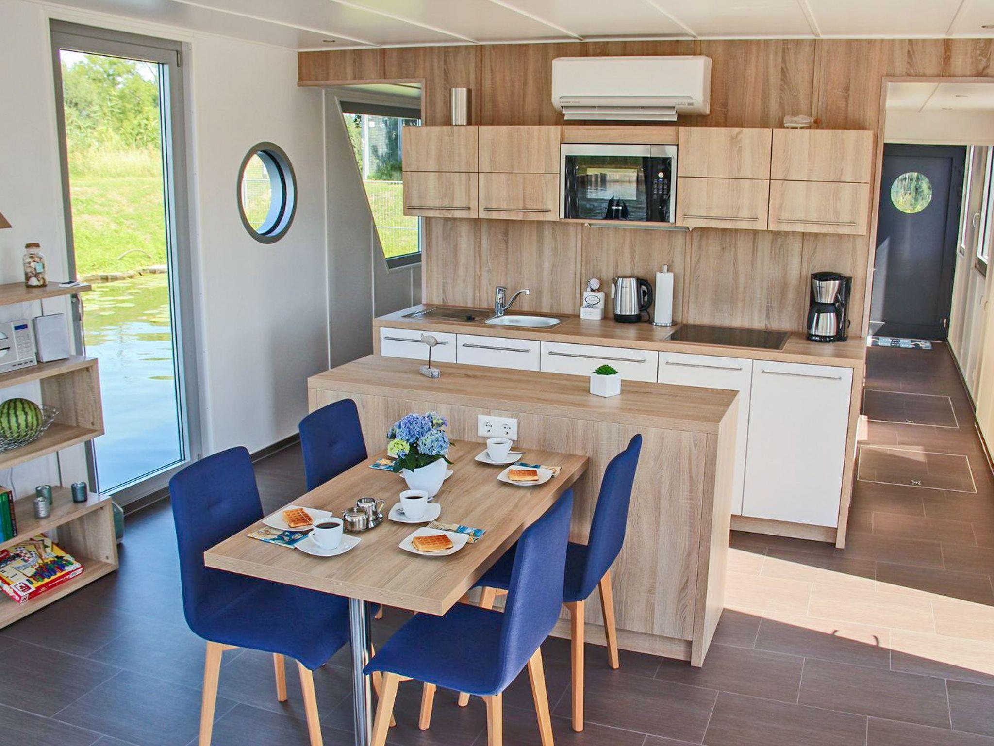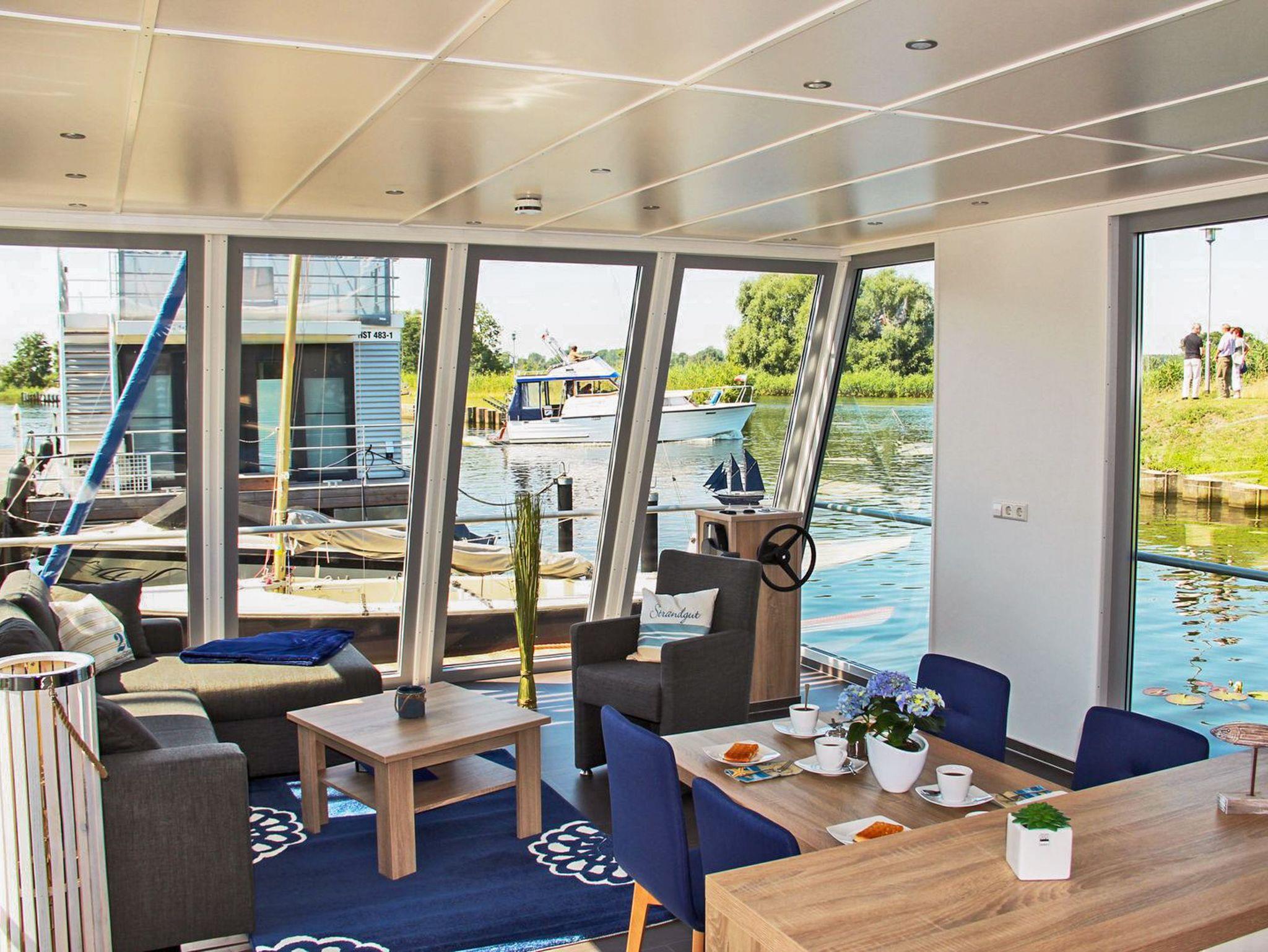 Genießen Sie maritimen Komfort und Wasserblick in unserem modernen Floating House Xenia in Ueckermünde.