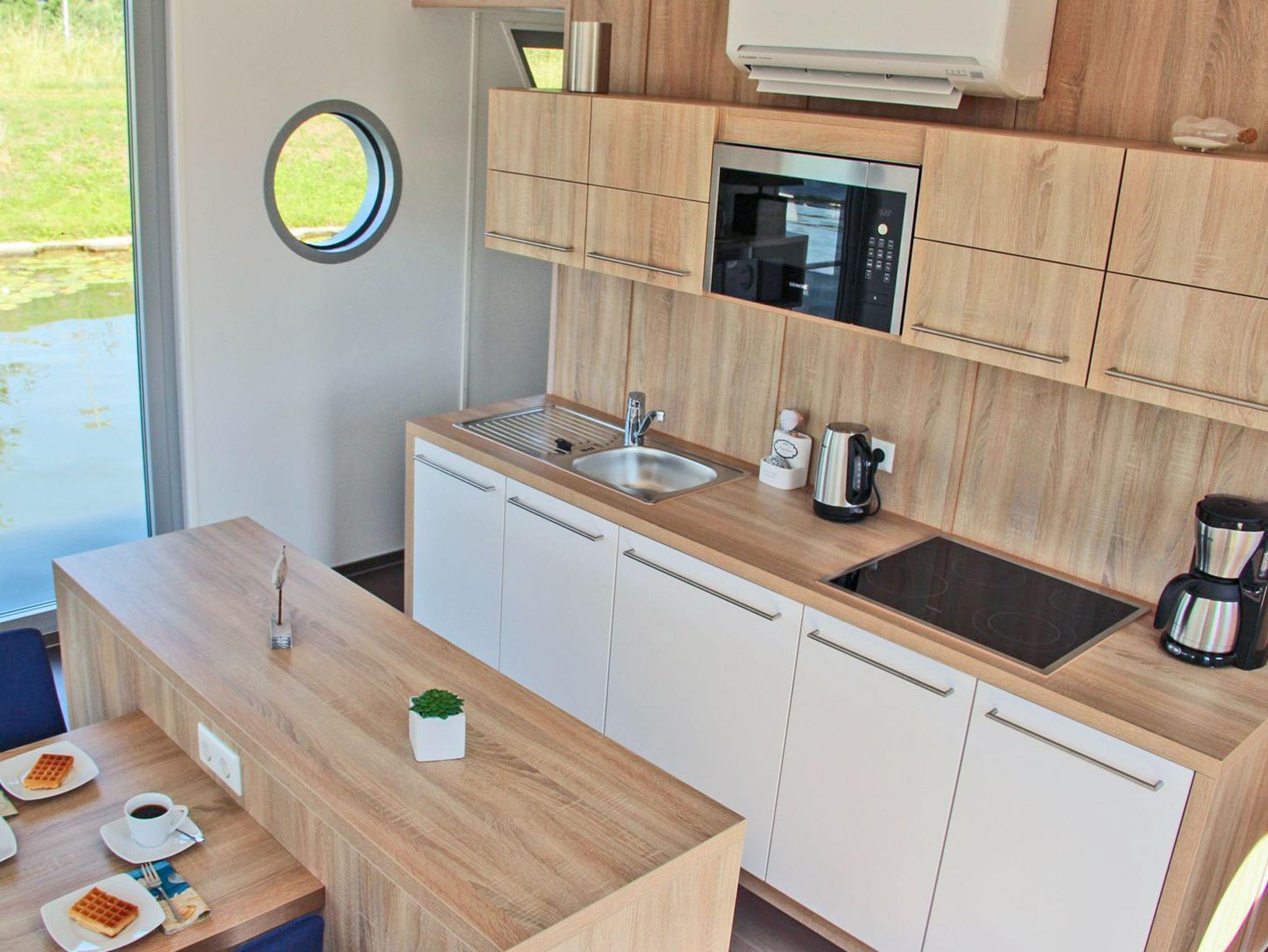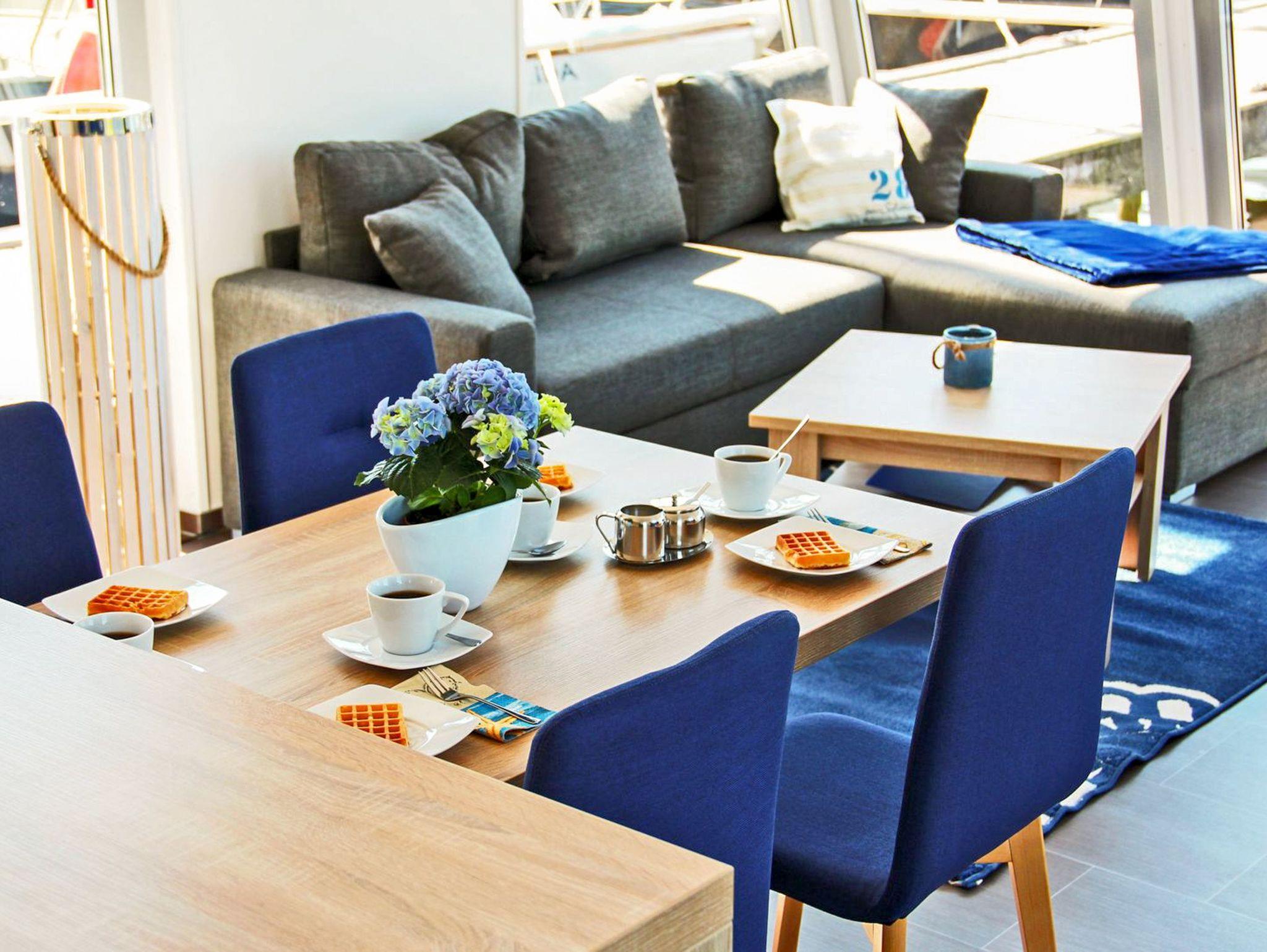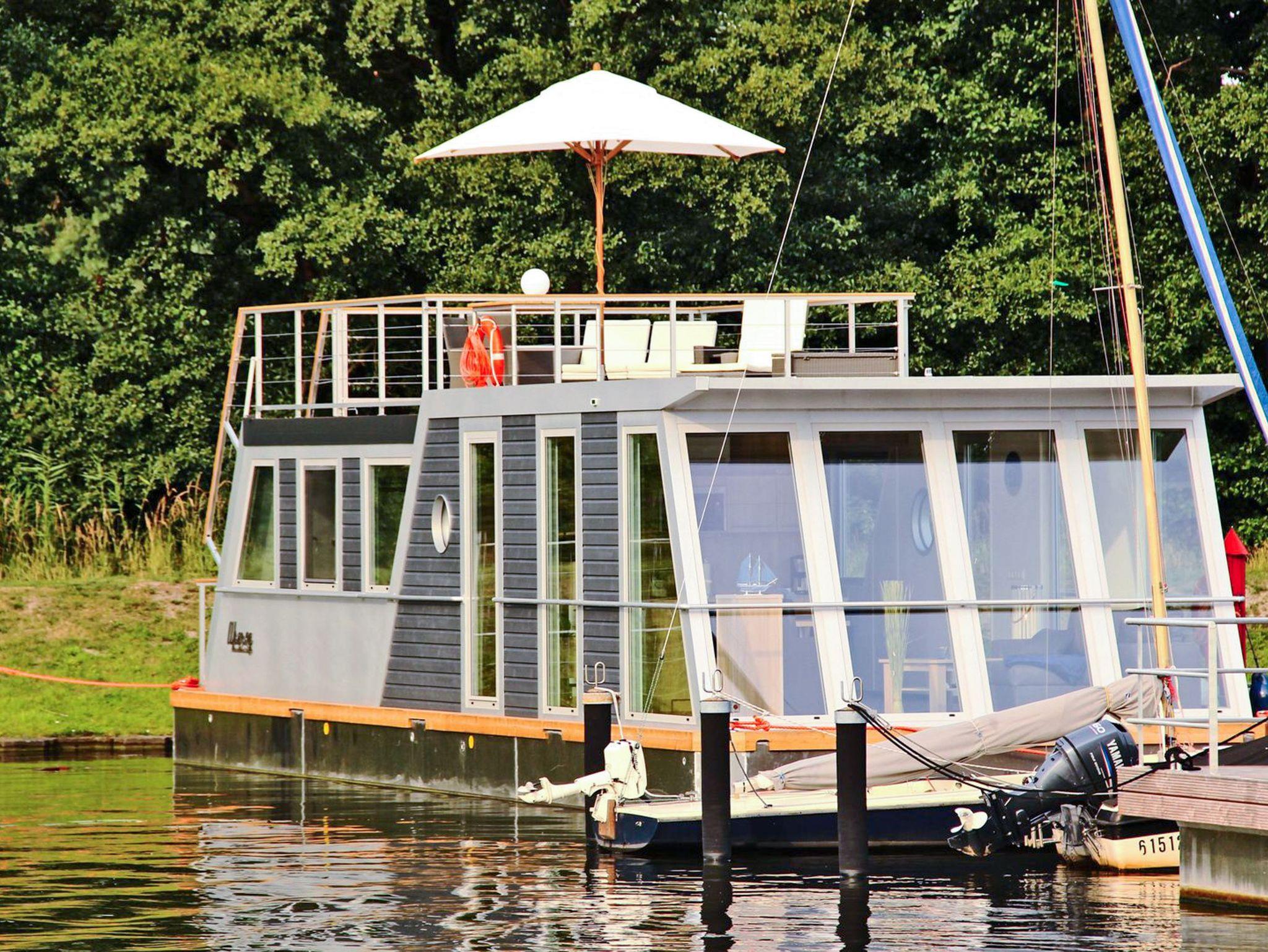 Genießen Sie maritimen Komfort und Wasserblick in unserem modernen Floating House Xenia in Ueckermünde.