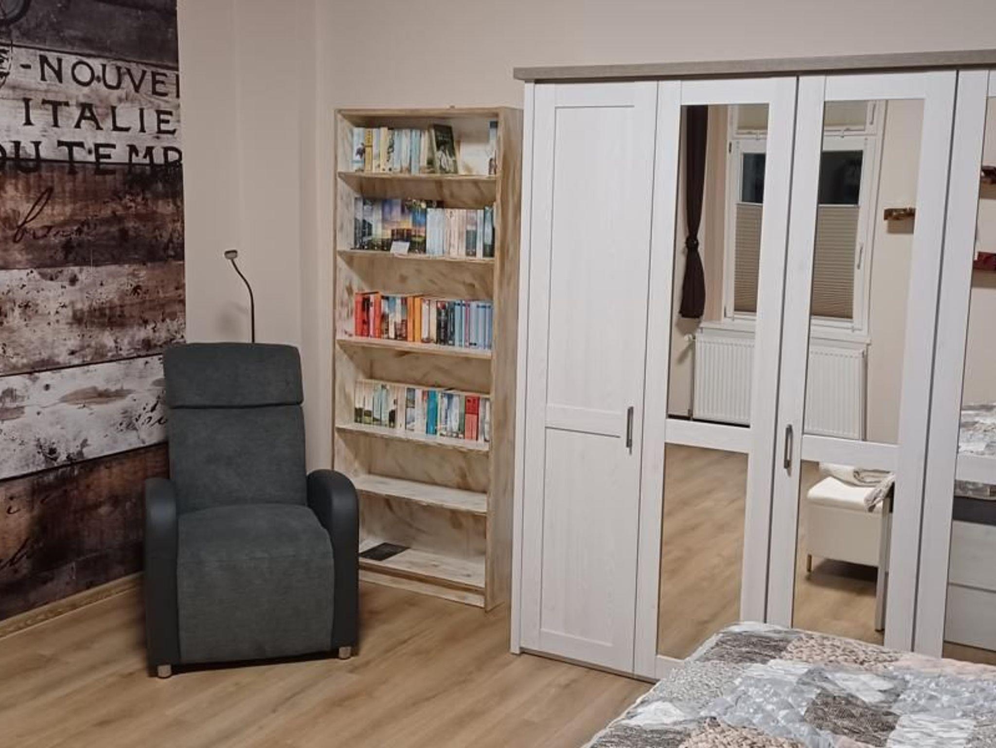 Im Schlafzimmer erwartet die Gäste ein großes Doppelbett (1,80 x 2,00 m) mit verstellbaren Kopfteilen an den Lattenrosten und hochwertigen Matratzen. Ein großer Kleiderschrank, Nachttische mit Beleuchtung, ein gefülltes Bücherregal mit Relax-Lesesessel inkl. Beleuchtung sowie ein Fernseher vervollständigen die Einrichtung.