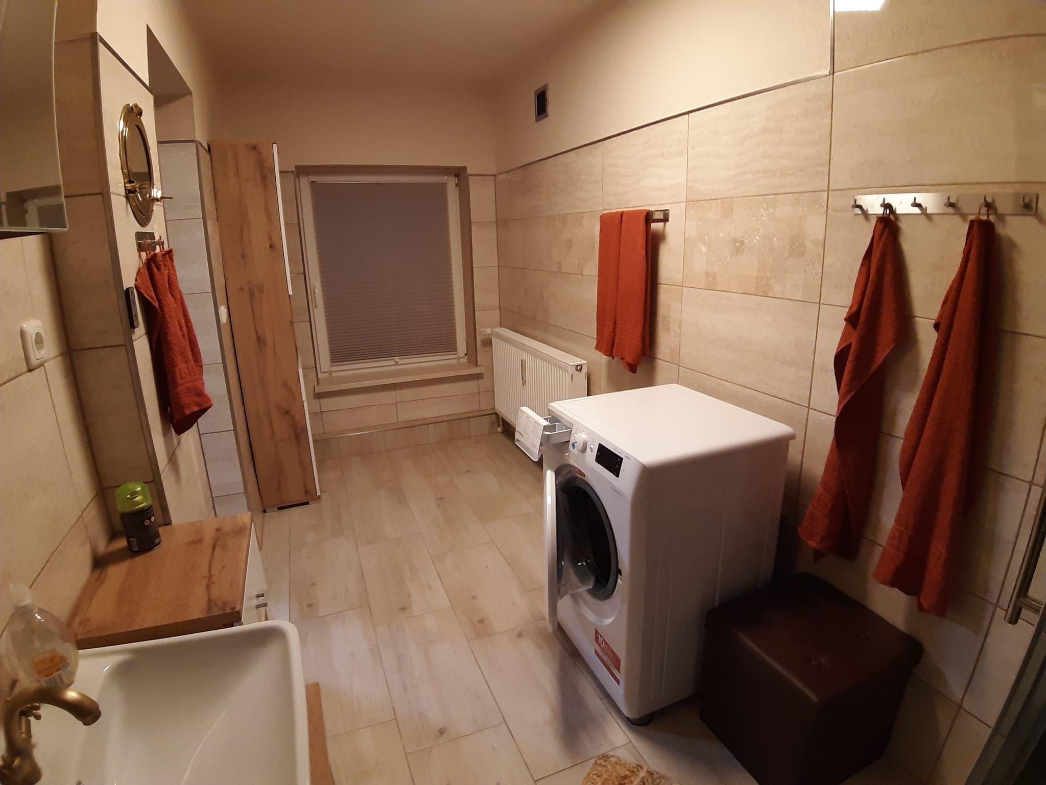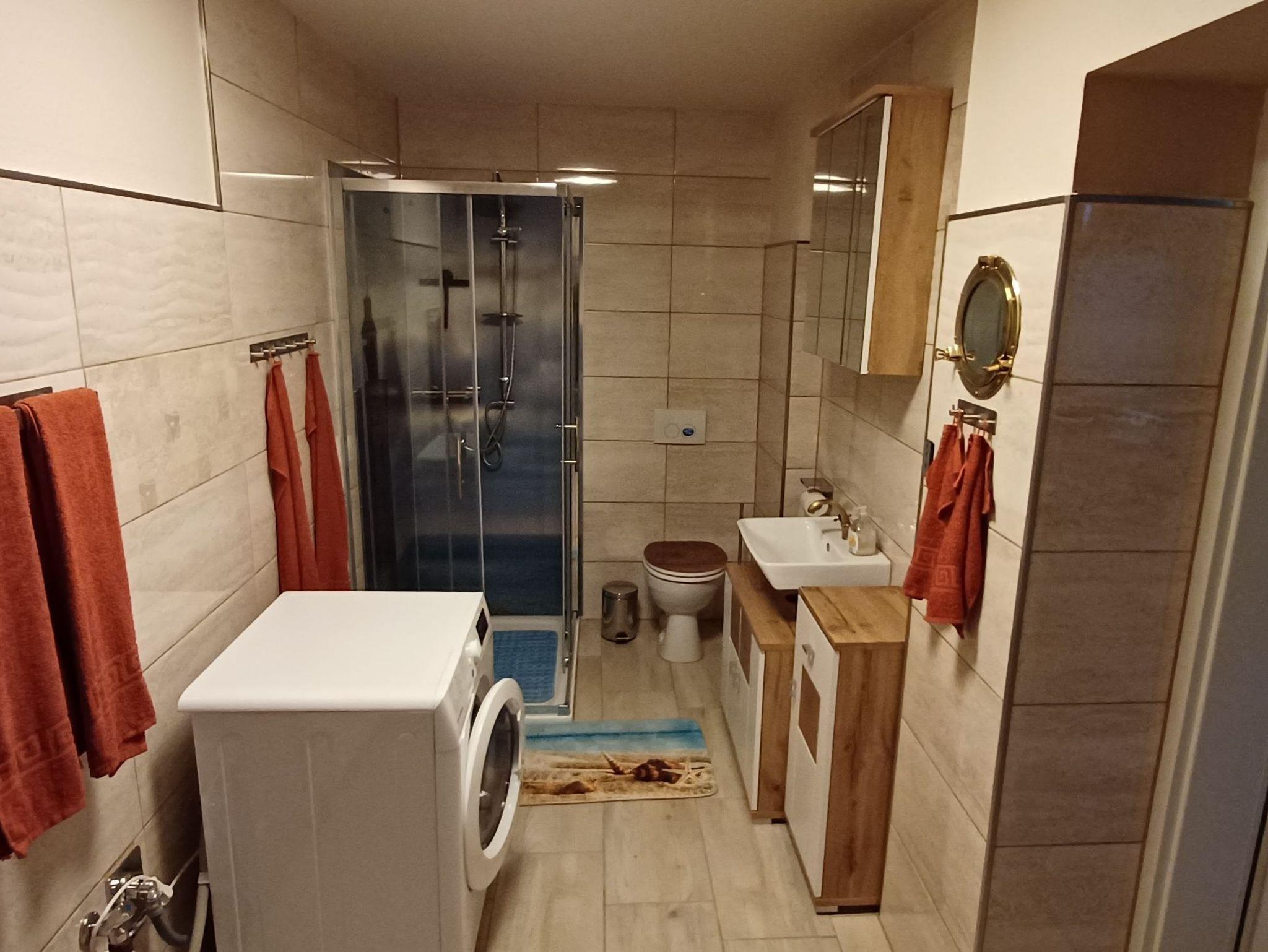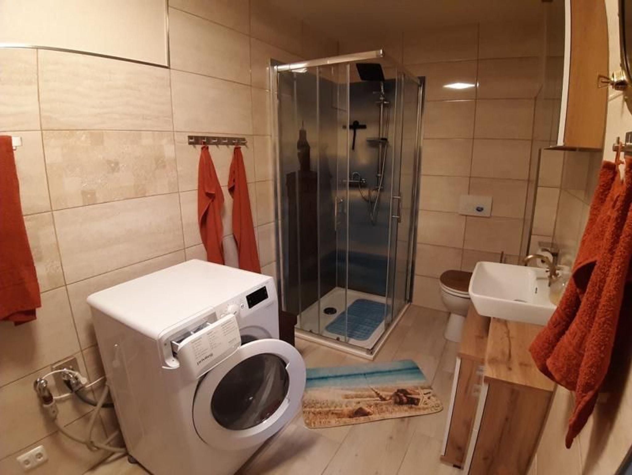 Im Badezimmer stehen den Gästen eine ebenerdige Dusche und eine Waschmaschine zur Verfügung. Das Bad verfügt über ein Fenster.