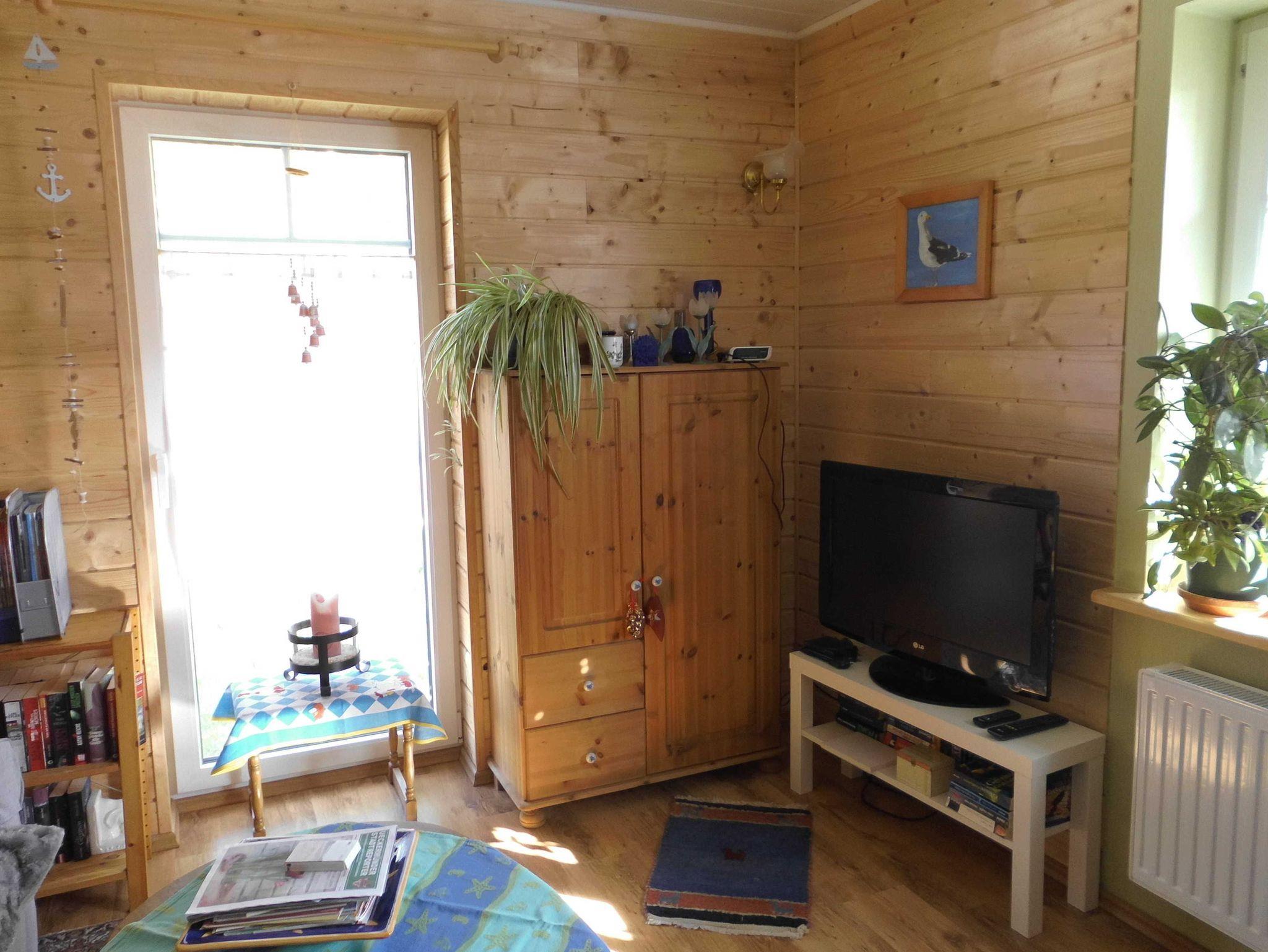 Die Ferienwohnung im Schwedenhaus mit überdachter Terrasse im Garten hat eine Größe von 40 m². Schlafzimmer, Bad mit ebenerdiger Dusche, Küche mit Geschirrspüler mit angrenzendem Ess- und Wohnbereich.