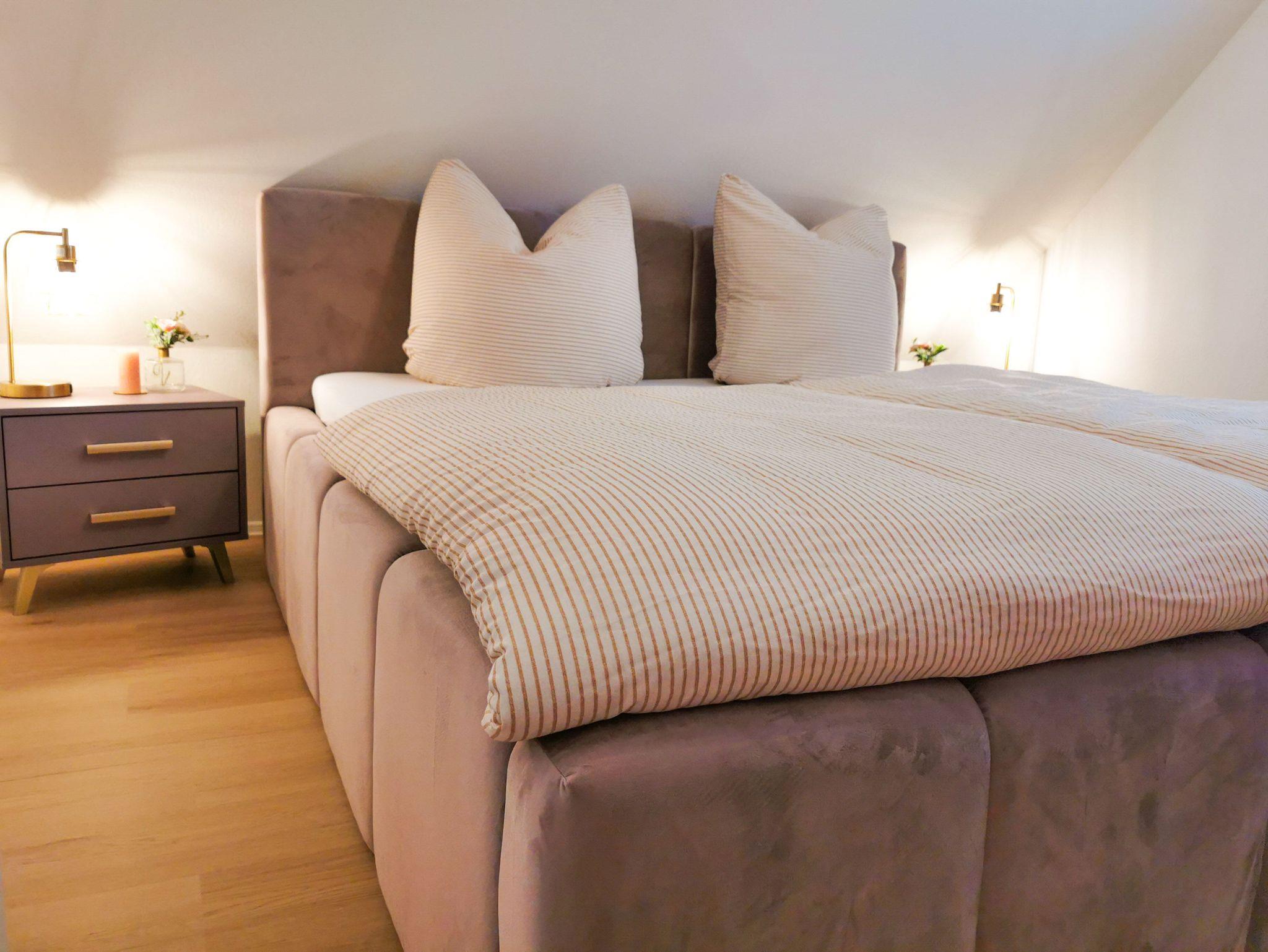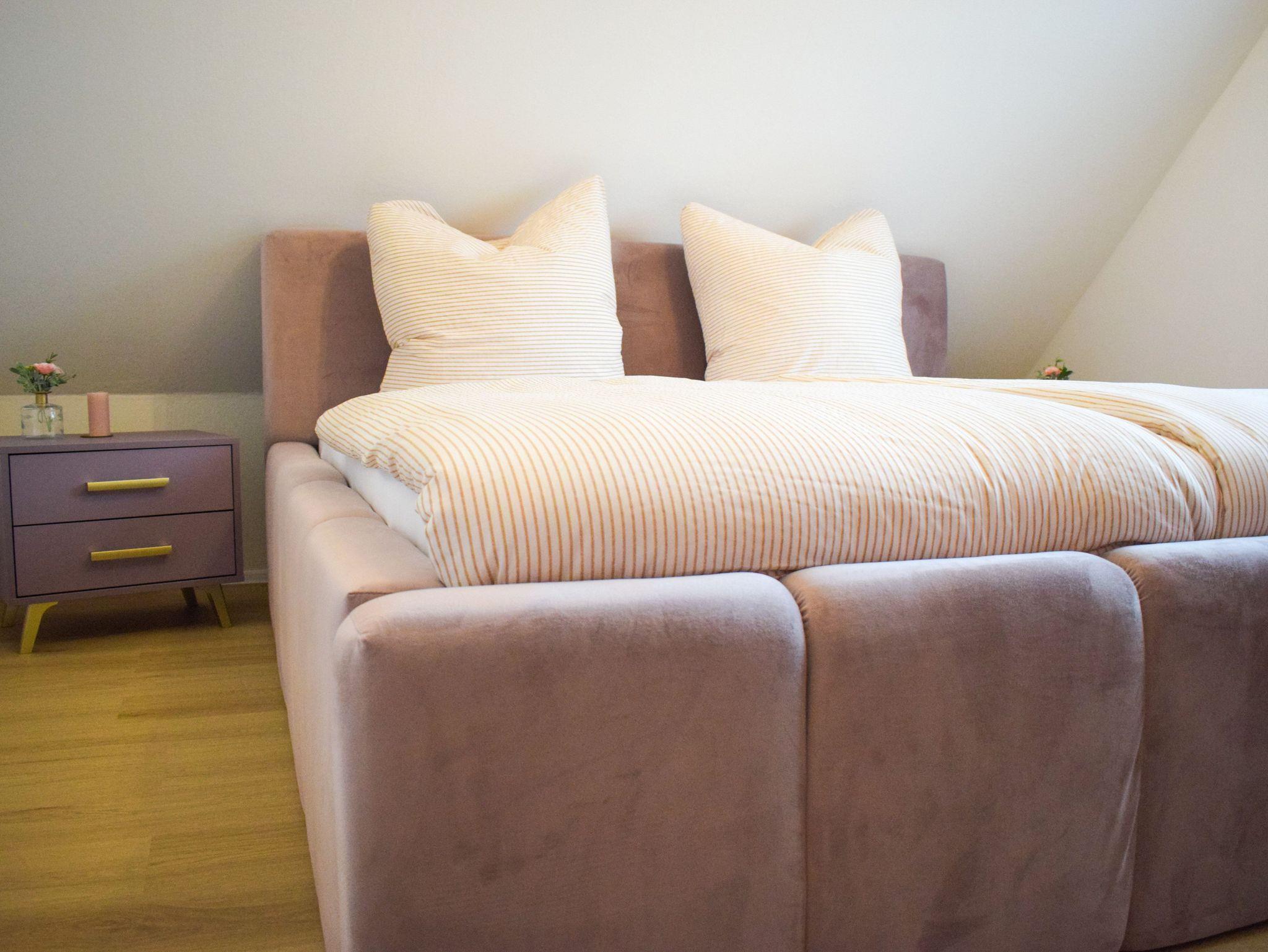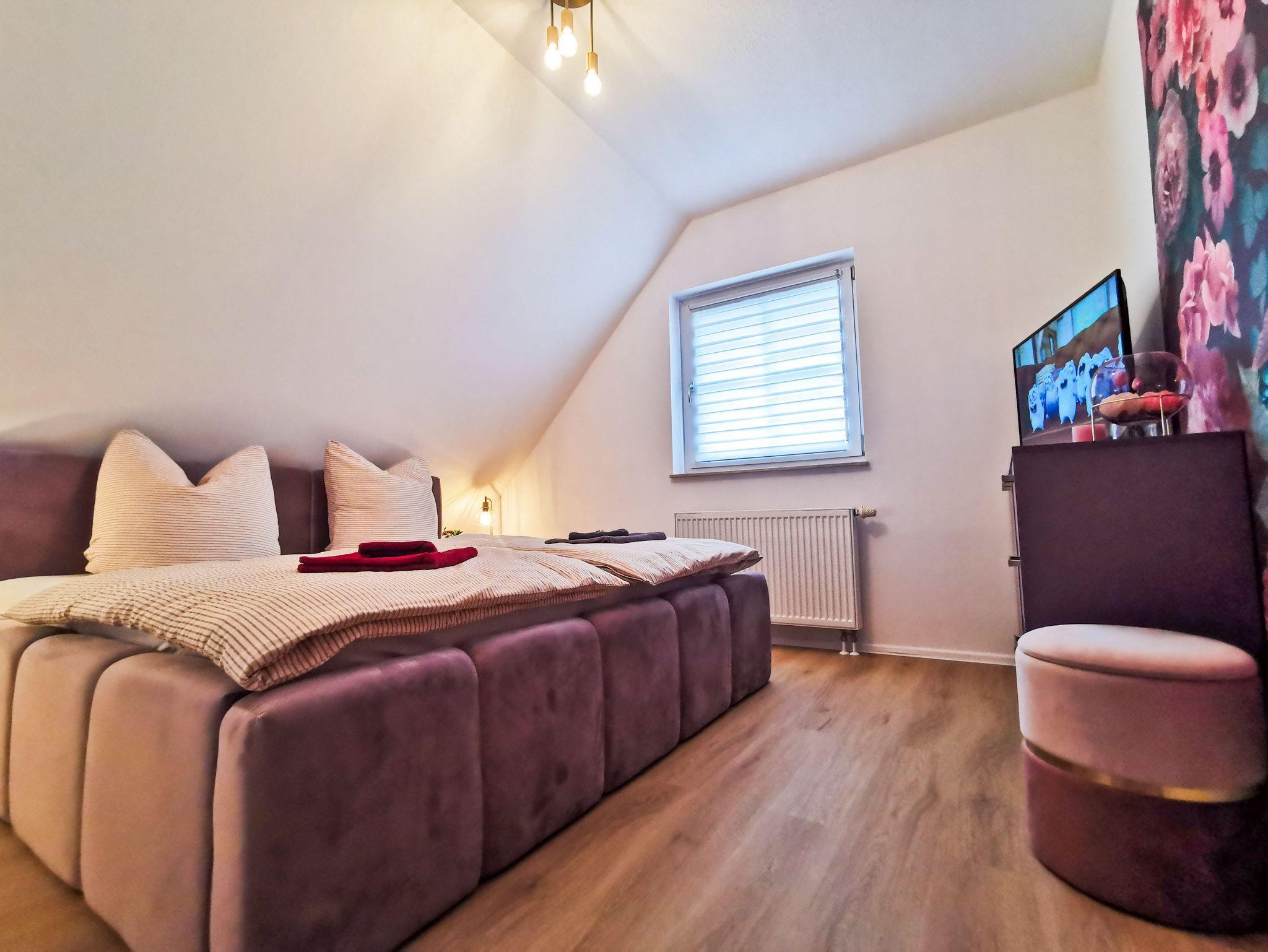 Schlafbereich 1: Das Schlafzimmer ist mit einem großen Polsterbett von 180 x 200 cm aus fliederfarbenen Samt mit passenden Möbel und Deko in flieder/gold liebevoll ausgestattet.
