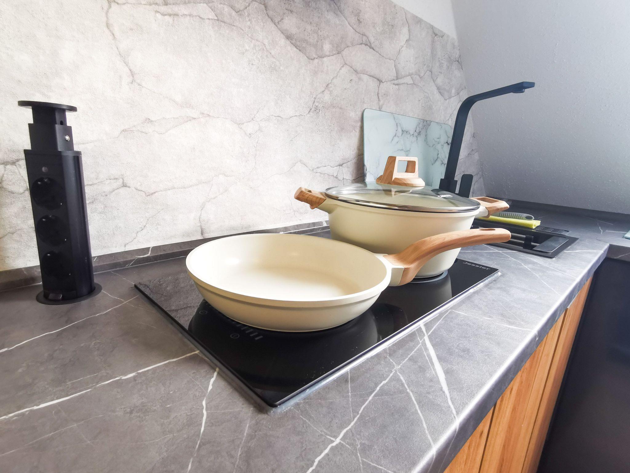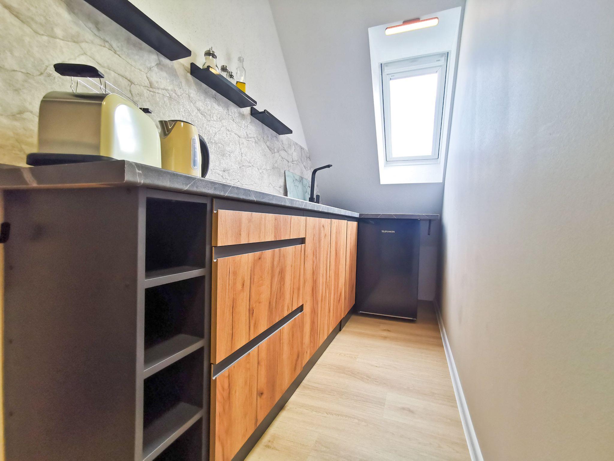 Küche: Unsere Küche ist klein, aber fein (Herd, Wasserkocher, Toaster, Mikrowelle, Kaffeemaschine, Kühlschrank mit Minibar).