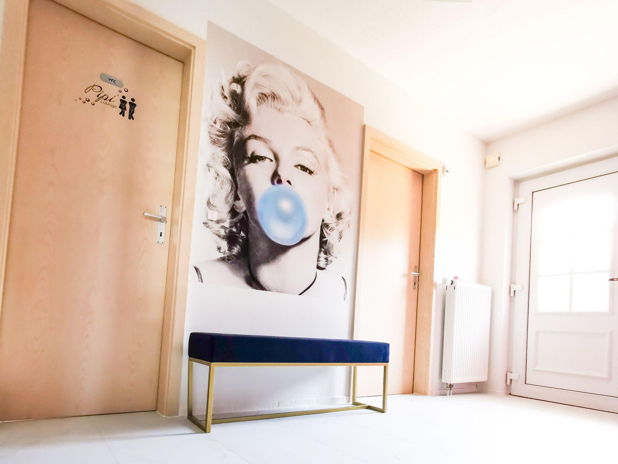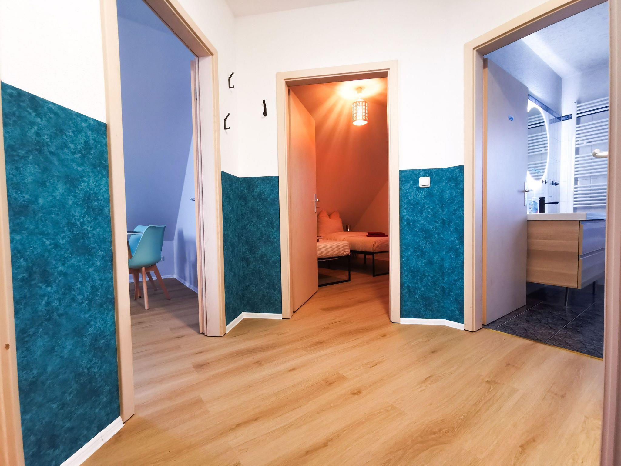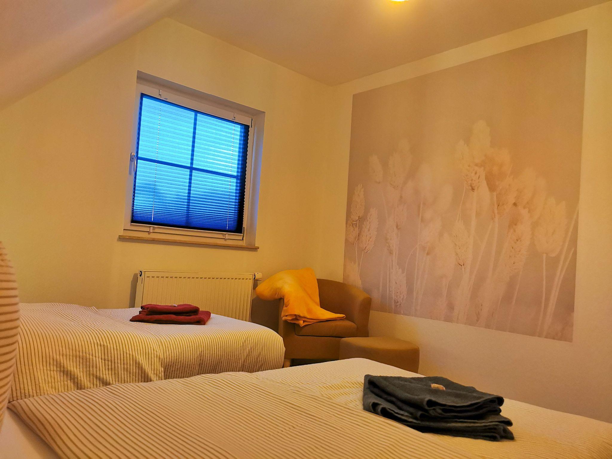 Unsere moderne und neu ausgestattete Wohnung bietet im 1. Obergeschoss auf 60 qm für bis zu sechs Personen Platz an, also ideal für Ihren Familienurlaub. Schlafbereich 1: Das Schlafzimmer ist mit einem großen Polsterbett von 180 x 200 cm aus fliederfarbenen Samt mit passenden Möbel und Deko in flieder/gold liebevoll ausgestattet. Schlafbereich 2: Unser zweiter Schlafbereich in gelb/orange gehalen hat zwei Betten von jeweils 90 x 200 cm, die man wahlweise zusammen als Ehebett oder einzeln nutzen kann sowie reichlich Stauraum in der Kommode. Wohnbereich: In unserem grünfarbenen Wohnbereich befindet sich eine gemütliche Eckchouch aus Cord mit Schlaffunktion und passenden Möbeln dazu. Essecke: Die Essecke lädt zum Frühstück am Morgen, mittags oder Dinner am Abend für bis zu 6 Personen ein. Bad: Das Bad ist mit einer Badewanne und einem Duschvorhang ausgestattet, das ebenso mit Liebe eingerichtet wurde. Küche: Unsere Küche ist klein, aber fein (Herd, Wasserkocher, Toaster, Kühlschrank mit Minibar).