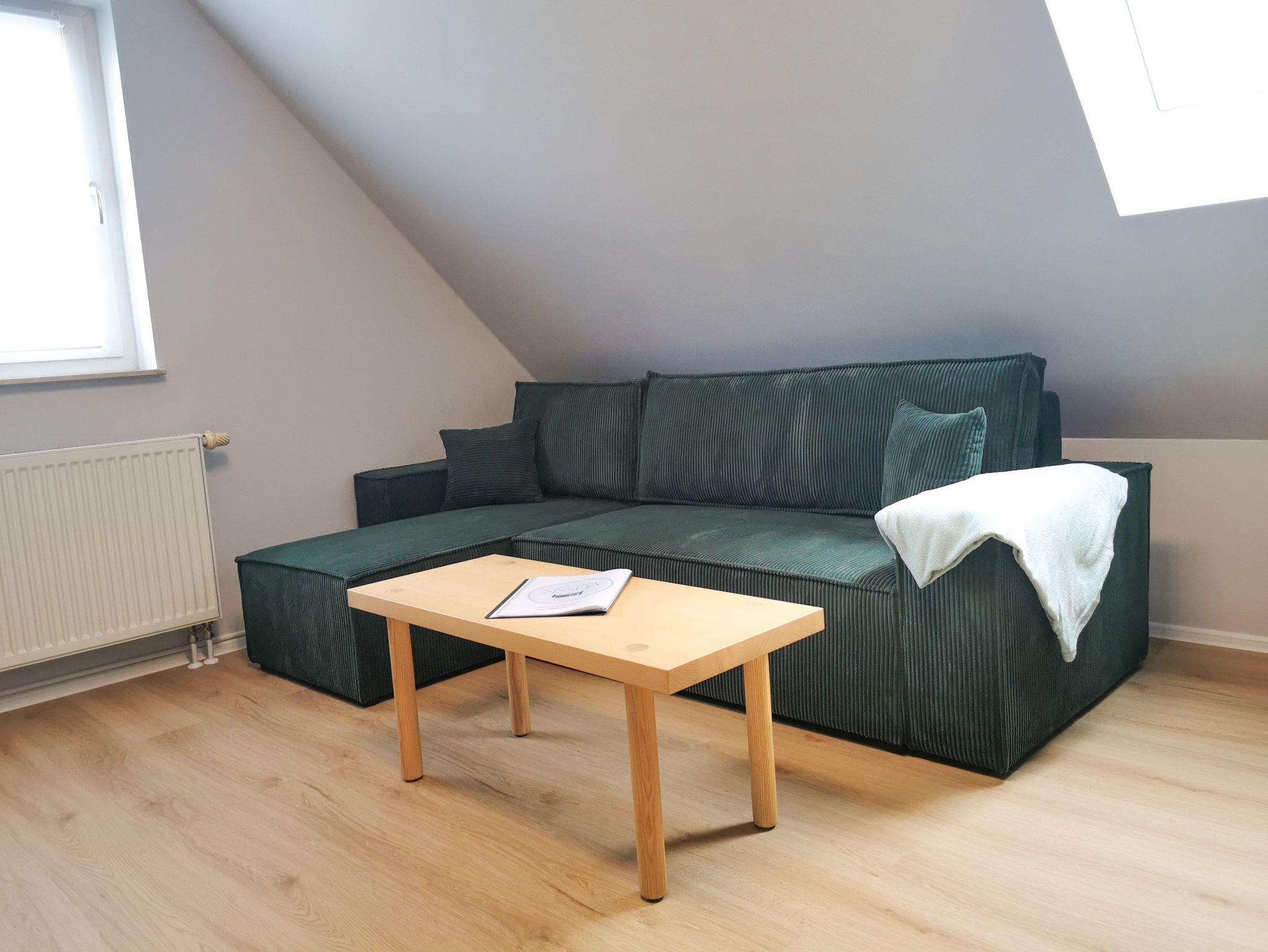 Wohnbereich: In unserem grünfarbenen Wohnbereich befindet sich eine gemütliche Eckchouch aus Cord mit Schlaffunktion und passenden Möbeln dazu.