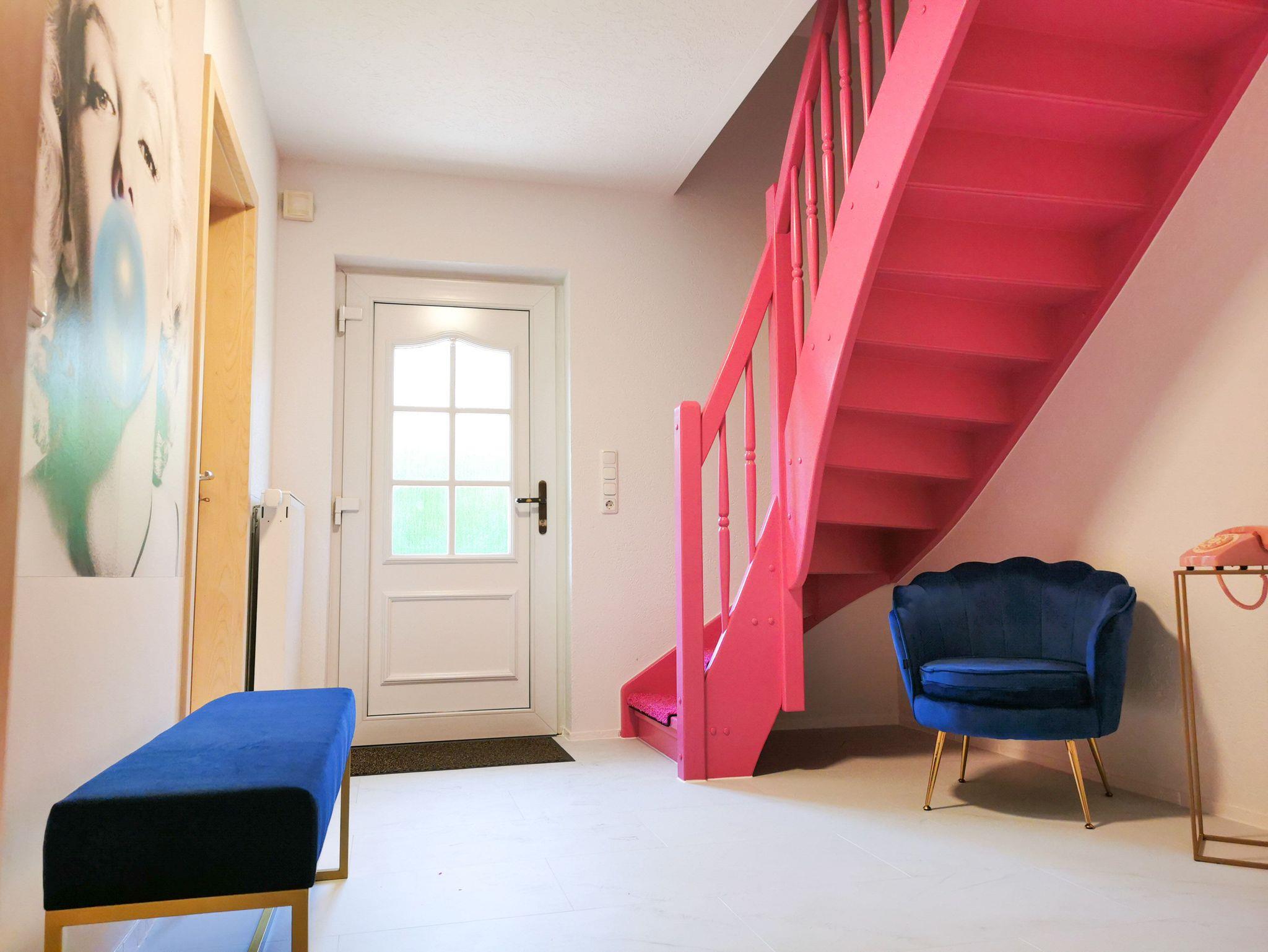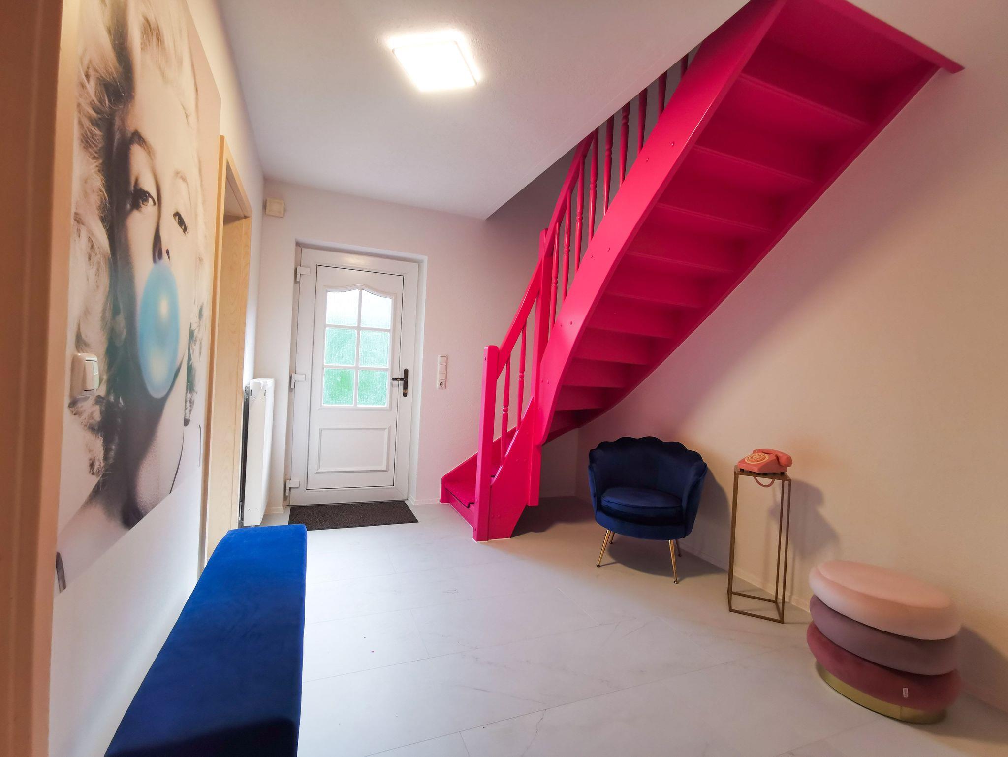 Flur unten: Die außergewöhnliche Treppe begleitet Sie in die schöne Ferienwohnung mit einer kleinen Selfie-/Fotosission im Eingangsbereich.
