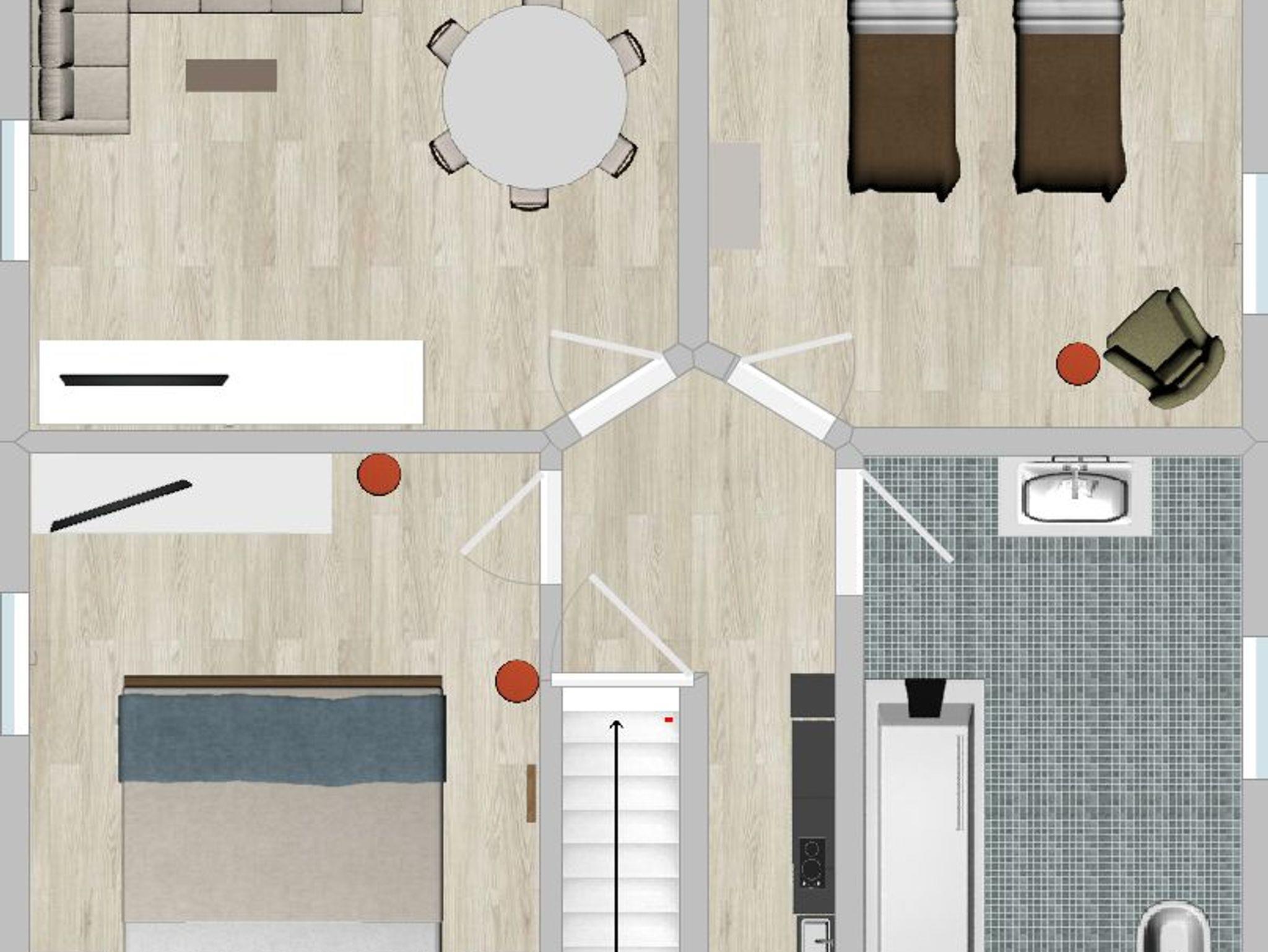 Der gesamte Fußbodenbereich ist mit einem Vinyl ausgestattet, das Badezimmer ist gefließt. Auch die Wände sind bis ins kleinste Detail modern tapeziert.