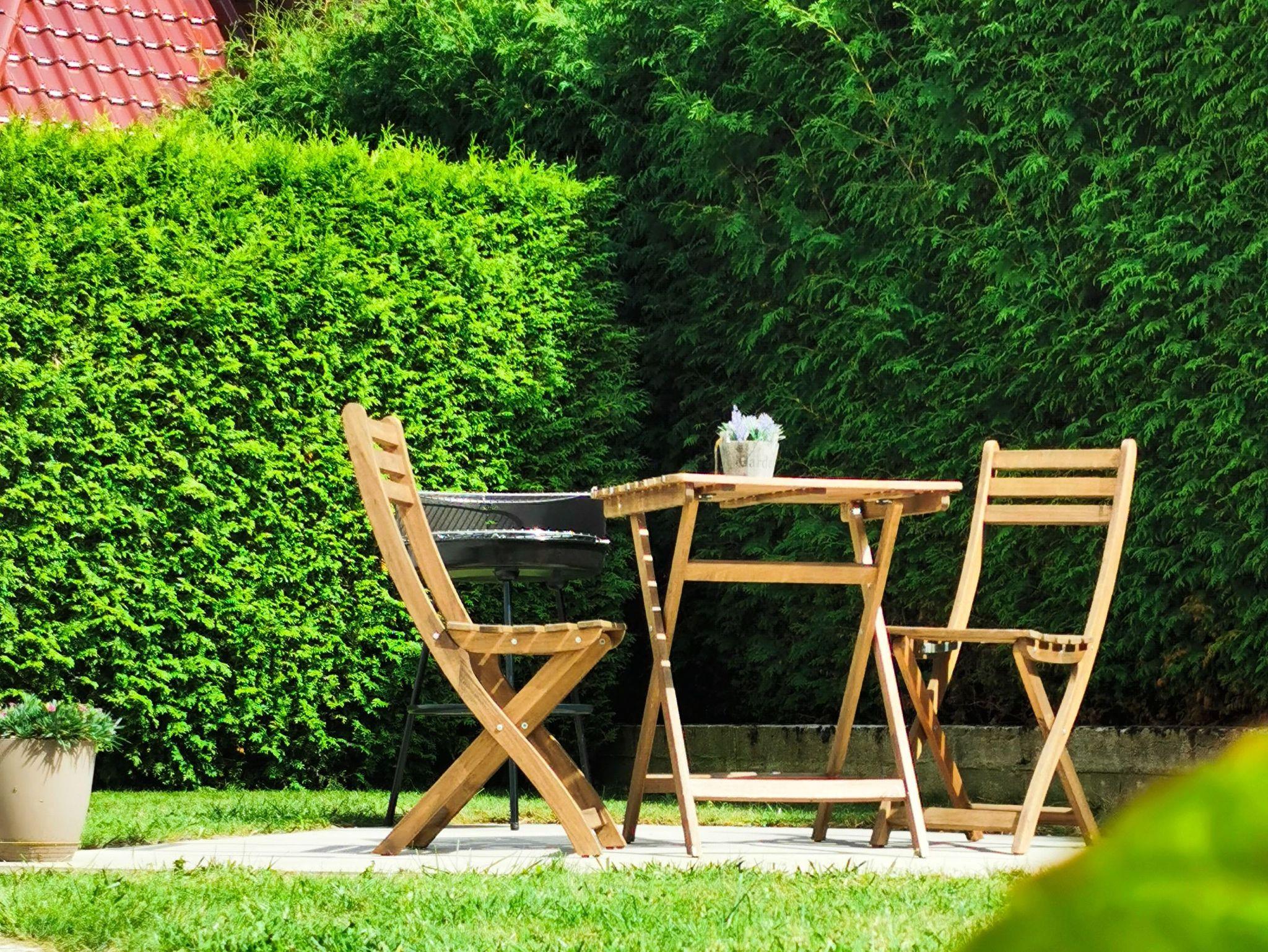Außen: Privatparkplatz (Carport), 2 Pkw-Stellplätze insgesamt, Garten vorhanden, Terrasse mit Sitzgruppe und Grill.