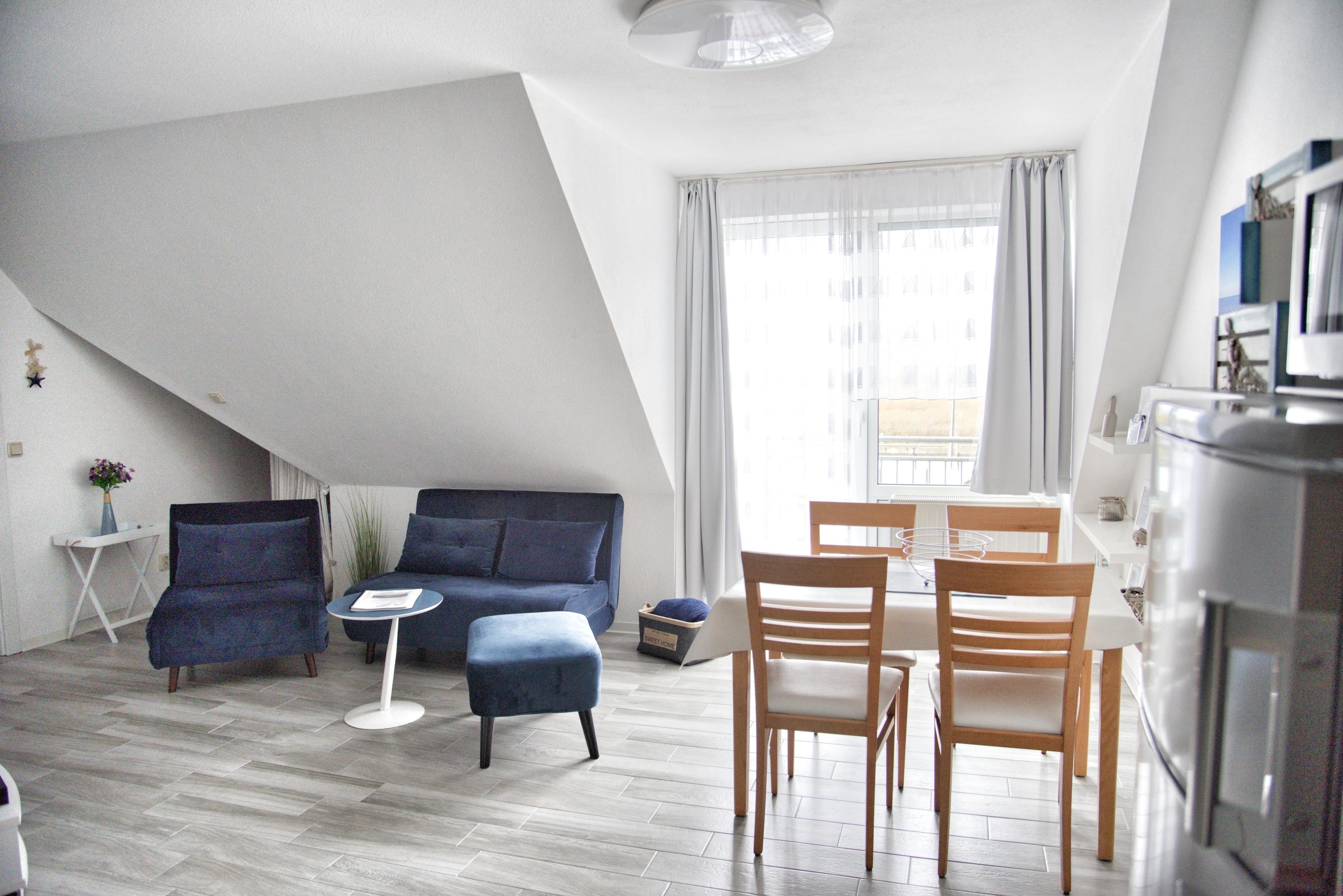 zweiten Obergeschoß des Hauses Regatta, im Eingang 2. In unmittelbarer Nähe dieses Appartements befinden sich weiter Ferienwohnungen unserer Gesellschaft. Eine gemeinsame Anmietung ist hier sehr gut möglich.