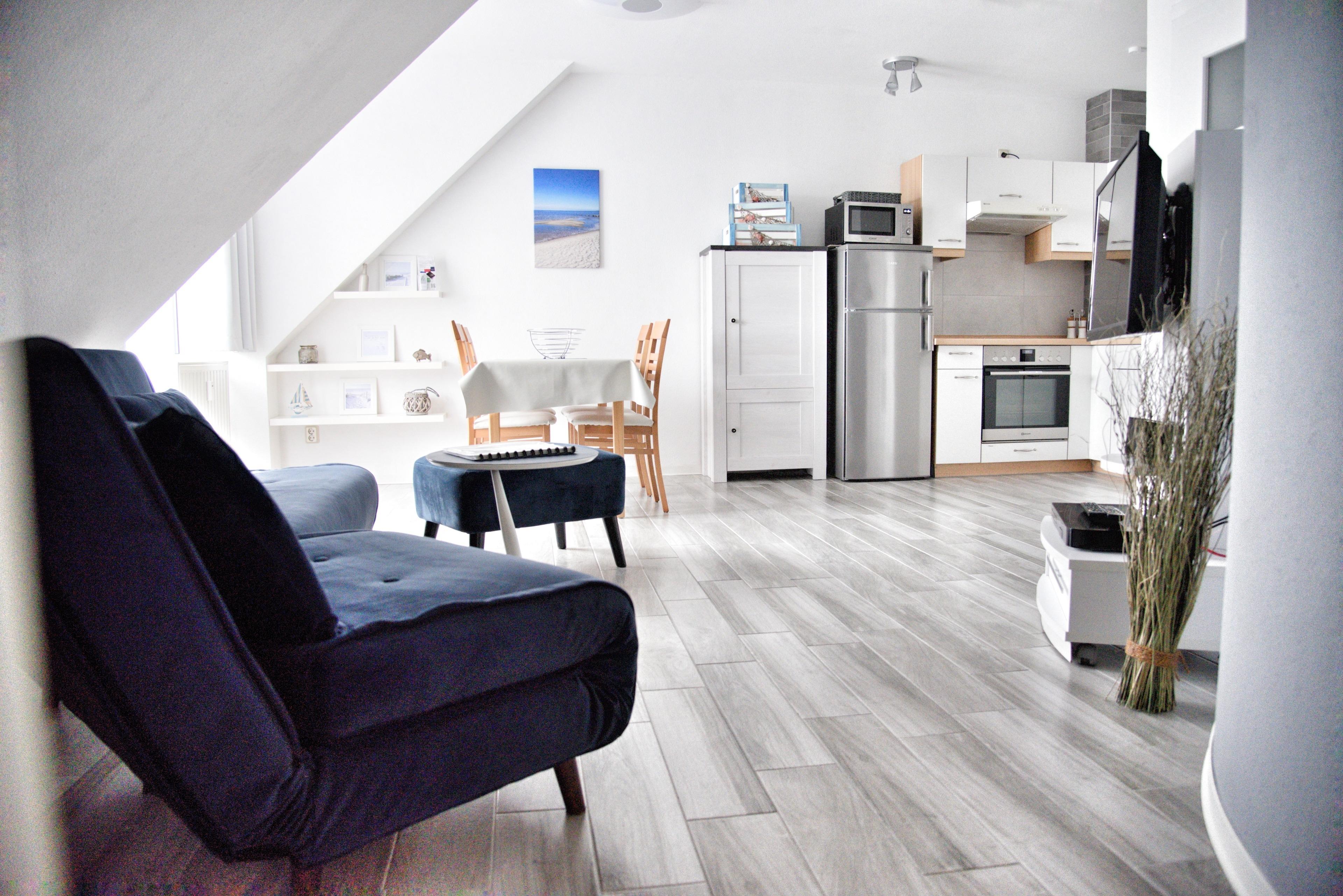Ihr Wohnzimmer verfügt über ein ausziehbares Schlafsofa mit einem Schlafplatz für zwei Personen und einen Sessel. Multimedial stehen Ihnen hier ein Flachbildfernseher mit Kabelanschluss zur Verfügung. Auch einige Gesellschaftsspiele dürfen nicht im Bestand fehlen. In Ihrem Schlafzimmer finden Sie ein Doppelbett sowie einen großen Kleiderschrank, ein Sideboard und Ablagemöglichkeiten vor. Hier können Sie Ihre Koffer bequem auspacken. Ihre Küchenzeile ist zum Wohnzimmer hin offen, was den Raum großzügiger erscheinen lässt. In Ihrem offenen Wohn- und Essbereich steht Ihnen ein Esstisch mit vier Stühlen zur Verfügung. Die Küchenzeile ist gut ausgestattet. Bestandteile sind unter anderem ein Kochfeld, ein Backofen, eine Mikrowelle, ein Geschirrspüler, eine Kaffeemaschine, viel Geschirr sowie eine große Kühl- und Gefrierkombination. Das Badezimmer hat eine Dusche mit Duschkabine und natürlich haben Sie auch hier viele Ablageflächen. Eine eigene Waschmaschine rundet das Angebot ab. Ihre Diele und der Flur beherbergen eine Flurgarderobe und einen Spiegel. Das Appartement zum Kieker liegt im