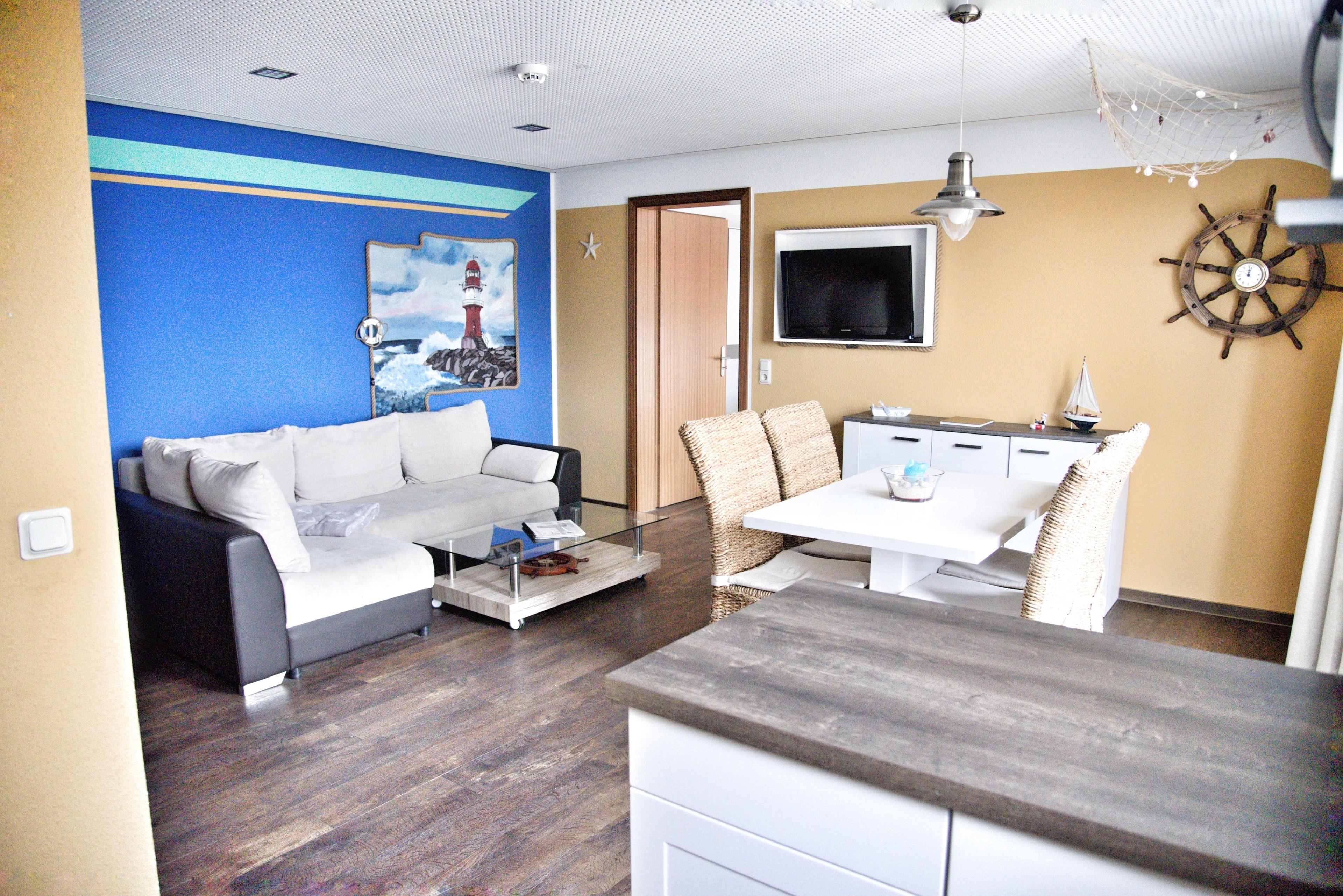 Ihr lichtdurchflutetes Wohnzimmer verfügt über einen Esstisch mit vier Stühlen und ein ausziehbares Schlafsofa mit einem Schlafplatz für zwei Personen. Sollten die Tage doch einmal weniger sonnig ausfallen, versüßt Ihnen die indirekte LED-Beleuchtung den Aufenthalt in der Wohnung. Die neue Wohnküche ist zum Wohnzimmer hin teiloffen, was den Raum noch großzügiger erscheinen lässt. Multimedial steht Ihnen hier ein großer Flachbildfernseher mit Kabelanschluss zur Verfügung. Auch einige Gesellschaftsspiele dürfen hier im Bestand nicht fehlen. Im Schlafzimmer befinden sich ein komfortables Doppelbett mit höhenverstellbaren Lattenrosten sowie ein großzügig bemessener Kleiderschrank. Ihre Koffer können Sie hier bequem auspacken. Ihre Küchenzeile ist voll ausgestattet. Bestandteile sind unter anderem ein Cerankochfeld, eine Kaffeemaschine, ein Backofen, viel Geschirr sowie eine Kühlschrank mit Gefrierfach. Ihren kulinarischen Ideen sind hier keine Grenzen gesetzt. Ihr Badezimmer verfügt über eine Dusche mit Duschkabine, einen Fön und Ablageflächen. Ihr Flur verfügt über eine Garderobe und einen großen Spiegel. Das Appartement Kehr Wieder! liegt im ersten Obergeschoß des Hauses Silbermöwe, im Eingang 2. In unmittelbarer Nähe dieses Appartements befinden sich weiter Ferienwohnungen unserer Gesellschaft. Eine gemeinsame Anmietung ist hier sehr gut möglich.