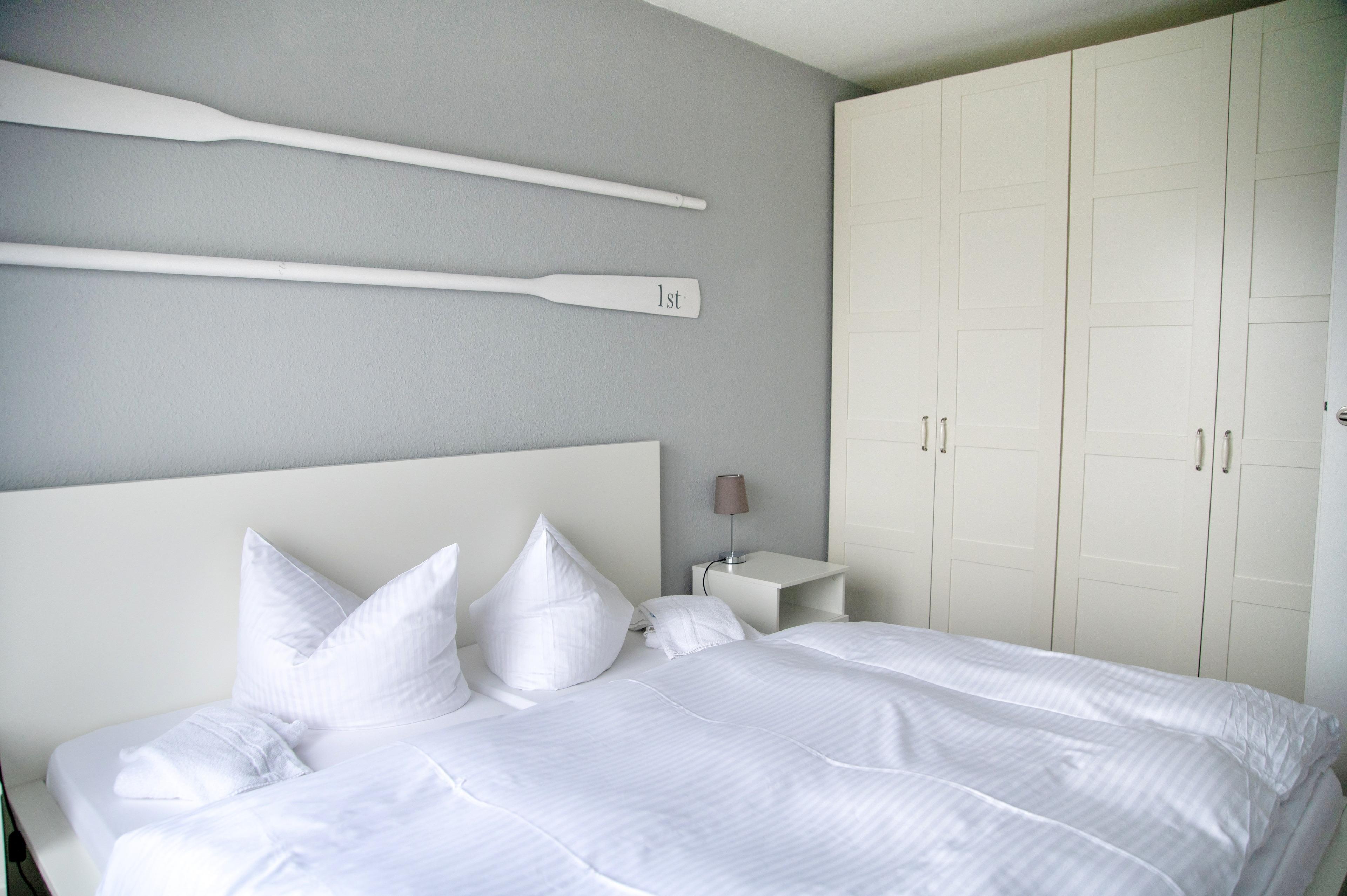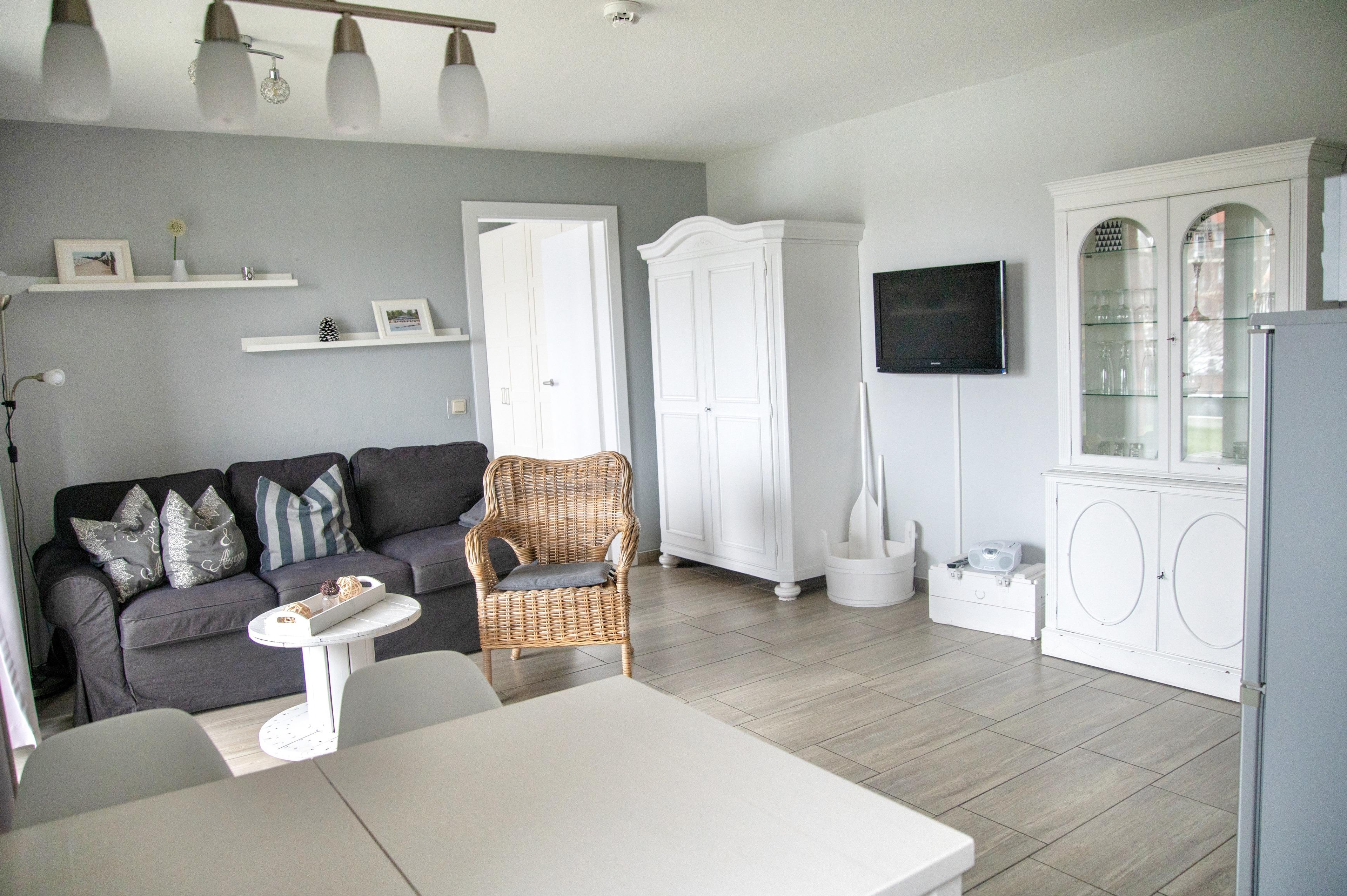 Das lichtdurchflutete Wohnzimmer verfügt über einen Esstisch mit vier Stühlen, ein ausziehbares Schlafsofa mit einem Schlafplatz für zwei Personen und einen Sessel. Für die Übernachtungsgäste des Wohnzimmers steht Ihnen ein separater Kleiderschrank zur Verfügung. Multimedial können Sie auf einen großen Flachbildfernseher zurückgreifen. Ihre Ferienwohnung hat einen Kabelanschluss. Auch einige Gesellschaftsspiele warten hier schon auf Sie. In Ihrem Schlafzimmer befindet sich ein Doppelbett mit höhenverstellbaren Lattenrosten. Nachtische, Leselampen und Garderoben möchten hier von Ihnen genutzt werden. Der große Schrank wird Ihnen gute Dienste leisten und genügend Stauraum für Ihr Gepäck bieten.
