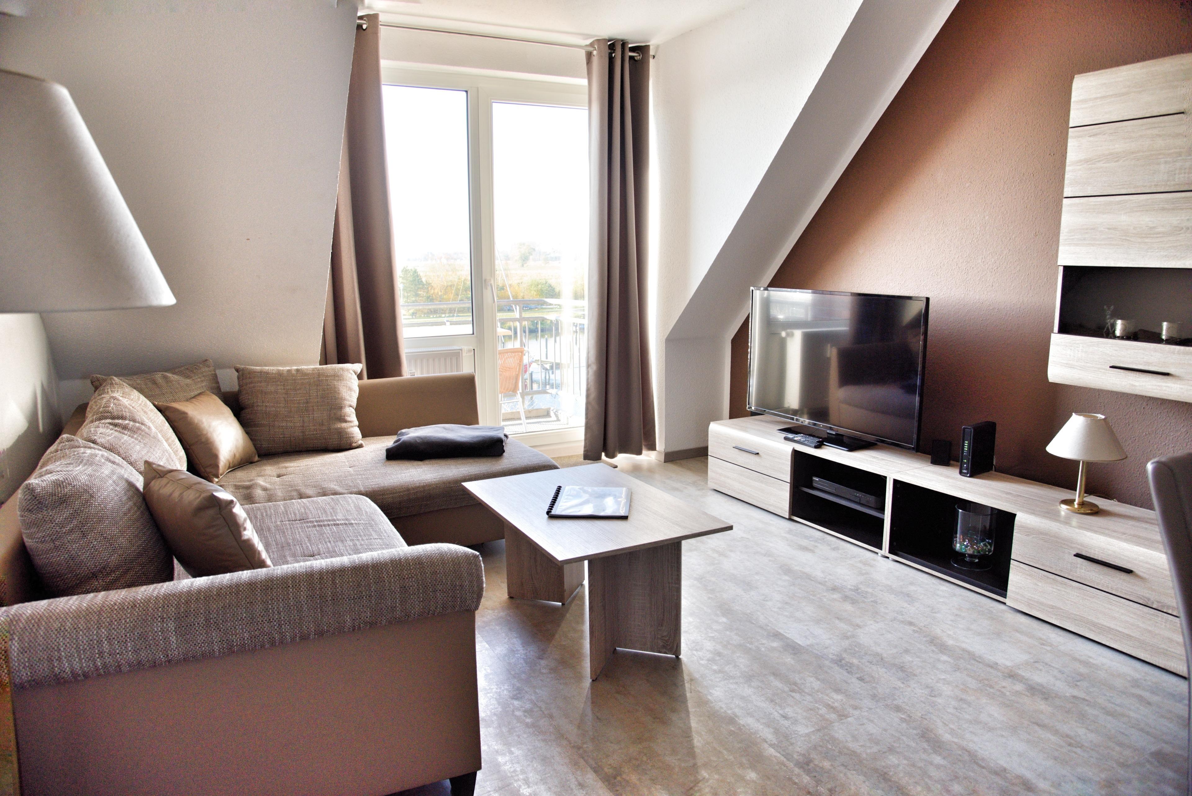 Bei der Ferienwohnung Baas handelt es sich um eine hochwertig eingerichtete, maritim geprägte Nichtraucherwohnung, die sich auf 64 Quadratmetern erstreckt. Aus jedem Fenster und auch vom südwestlich ausgerichteten Balkon aus blicken Sie direkt auf die Hafenanlagen der Marina. Auf dem Balkon stehen Ihnen Gartenstühle, ein Tisch und ein Sonnenschirm zur Verfügung. Im Wohnzimmer sind die Fenster bodentief. So können Sie vom Sofa aus die Boote im Hafenbecken fahren sehen.