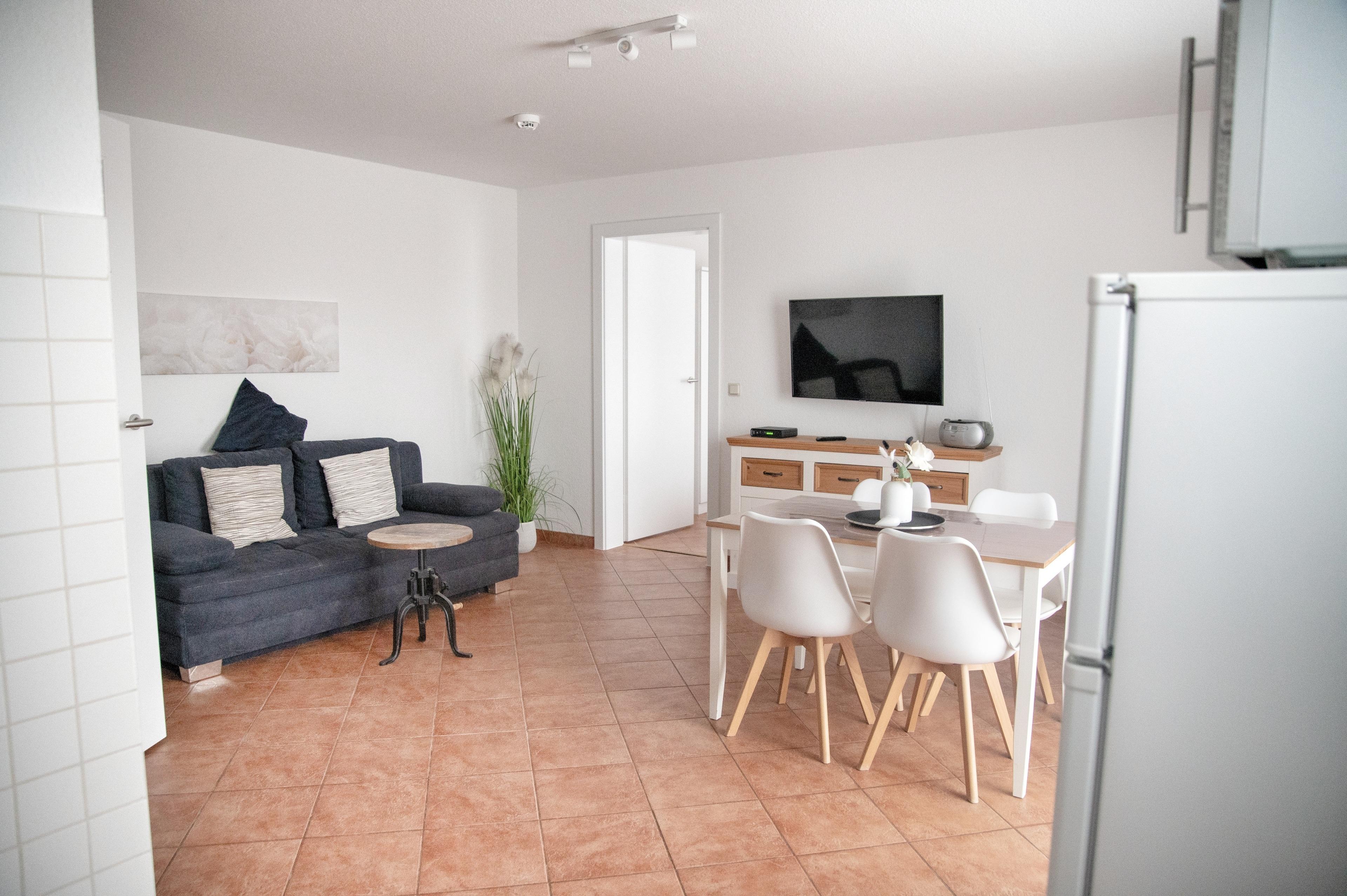 Das Wohnzimmer verfügt über einen Esstisch mit vier Stühlen, ein ausziehbares Schlafsofa mit einem Schlafplatz für zwei Personen und einen Sessel. Multimedial steht Ihnen hier ein Flachbildfernseher zur Verfügung. Ihre Ferienwohnung hat einen Kabelanschluss. Auch einige Gesellschaftsspiele dürfen hier im Bestand nicht fehlen. In Ihrem Schlafzimmer befindet sich ein Doppelbett. Nachtische und Leselampen möchten hier von Ihnen genutzt werden. Der Schrank wird Ihnen gute Dienste leisten und genügend Stauraum für Ihr Gepäck bieten. Die Küche ist zum Wohnzimmer hin offen, was den Raum noch großzügiger erscheinen lässt. Ihre Küchenzeile ist voll ausgestattet. Bestandteile sind unter anderem ein Kochfeld, eine Kaffeemaschine, viel Geschirr, ein Geschirrspüler, einen Backofen eine Mikrowelle sowie eine Kühl- und Gefrierkombination. Kulinarisch sind hier also keine Grenzen gesetzt. Ihr Badezimmer ist mit einer ebenerdigen Duschkabine und ausreichend Ablageflächen ausgestattet. Ihr Flur beherbergt eine Garderobe und einen großen Spiegel für Sie. Das Appartement Kai liegt im Erdgeschoß des Hauses Wikinger, im Eingang 2. In unmittelbarer Nähe dieses Appartements befinden sich weitere Ferienappartements unserer Gesellschaft. Eine gemeinsame Anmietung ist hier sehr gut möglich.