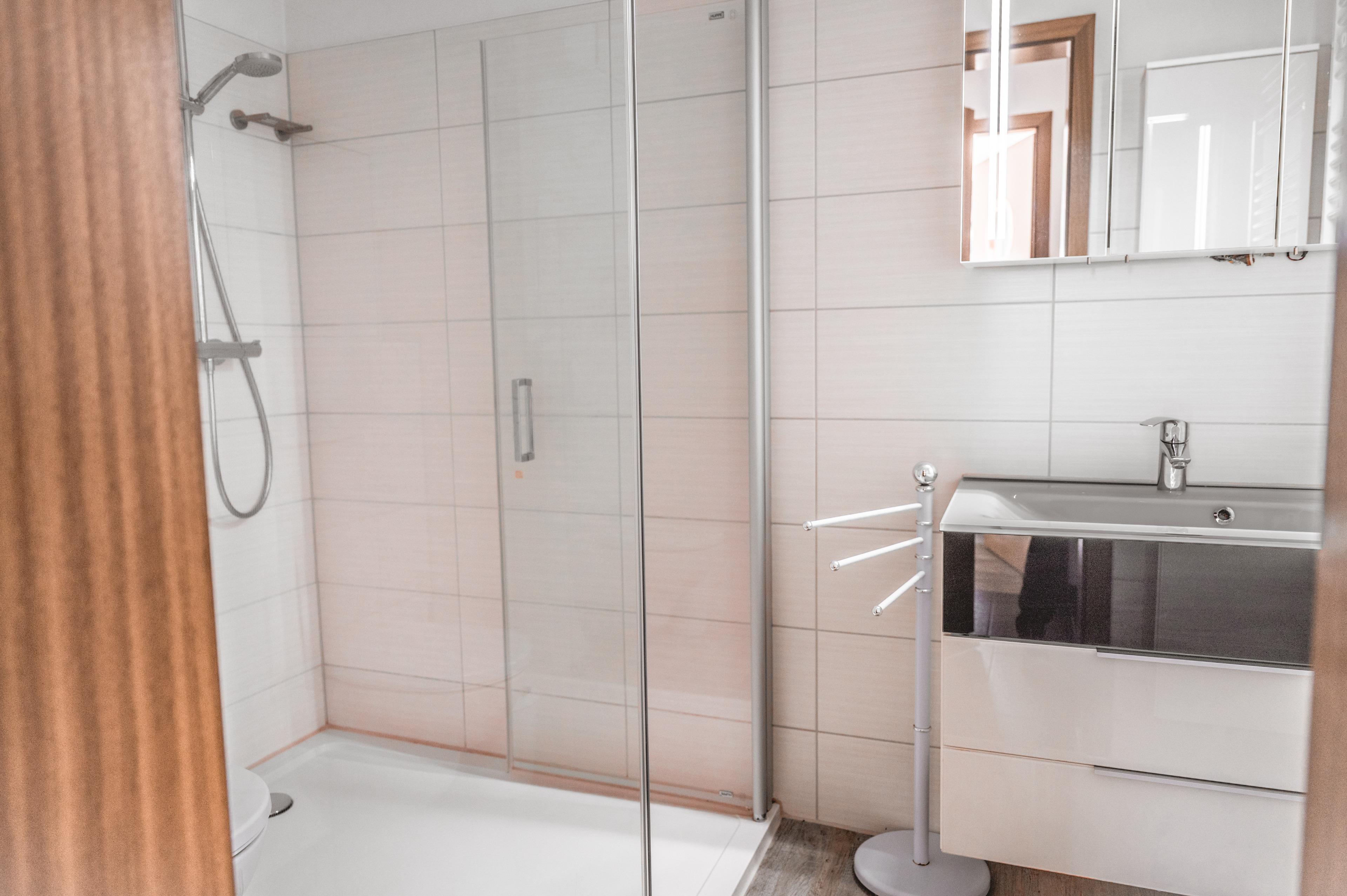 Die moderne Küche verfügt über eine komplett ausgestattete Küchenzeile, mit Cerankochfeld, Backofen, Geschirrspüler, Mikrowelle, viel Geschirr, sowie einem Kühlschrank mit kleinem Gefrierfach. Das neu geflieste Badezimmer hat eine Dusche mit ausreichend Ablageflächen. Ihre mitgebrachten Utensilien werden Sie hier gut verstauen können. Eine Garderobe im Flur ziert Ihren Eingangsbereich.
