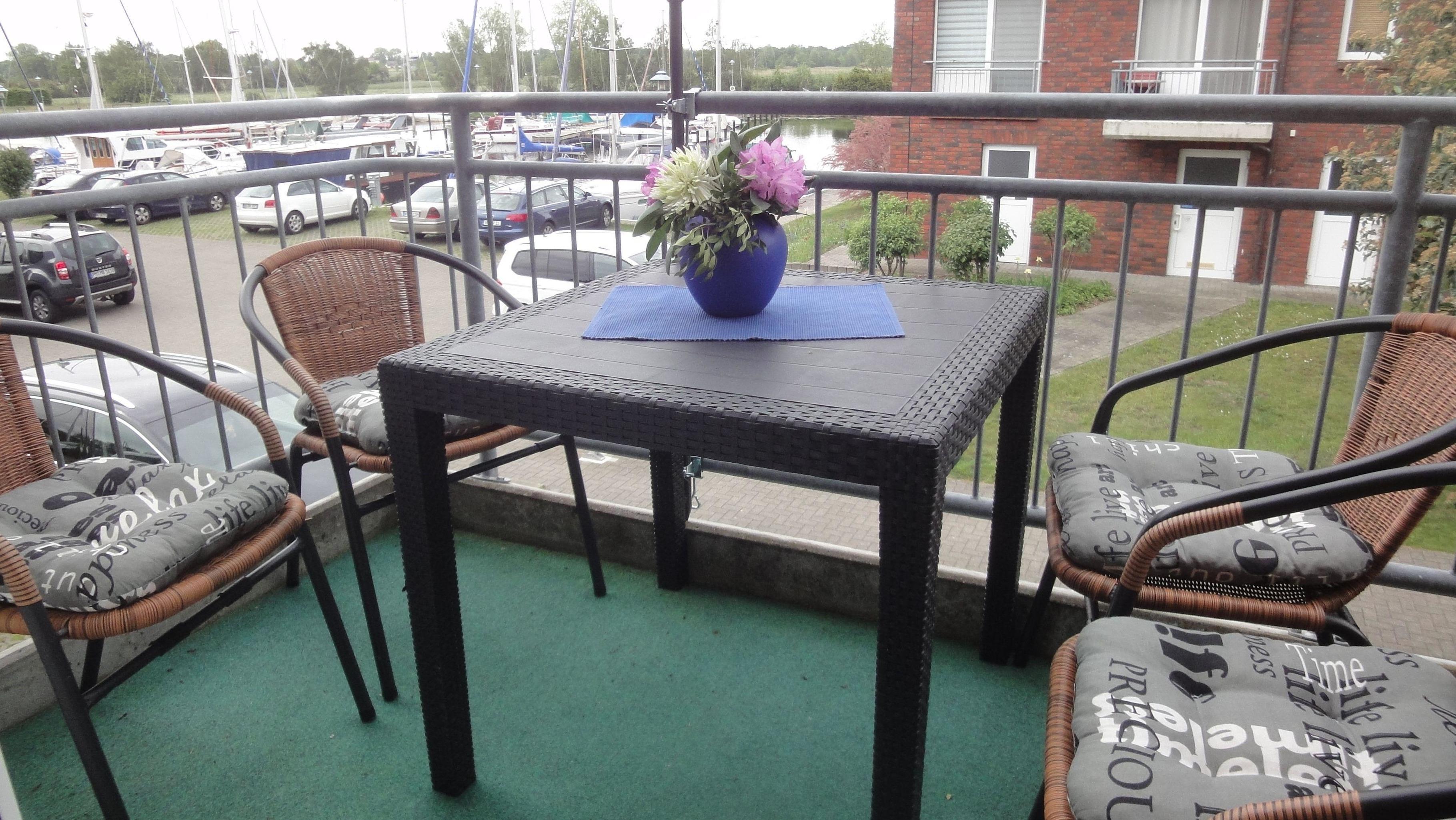 Vom sonnigen Balkon hat man eine tolle Aussicht auf die Schiffe im Hafen.
