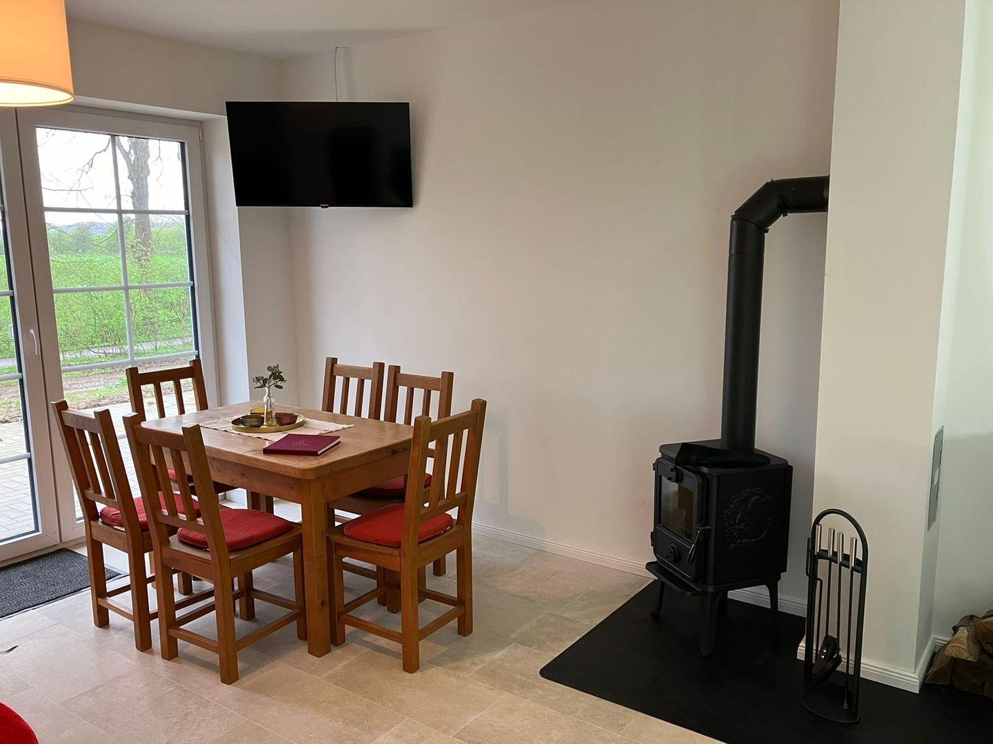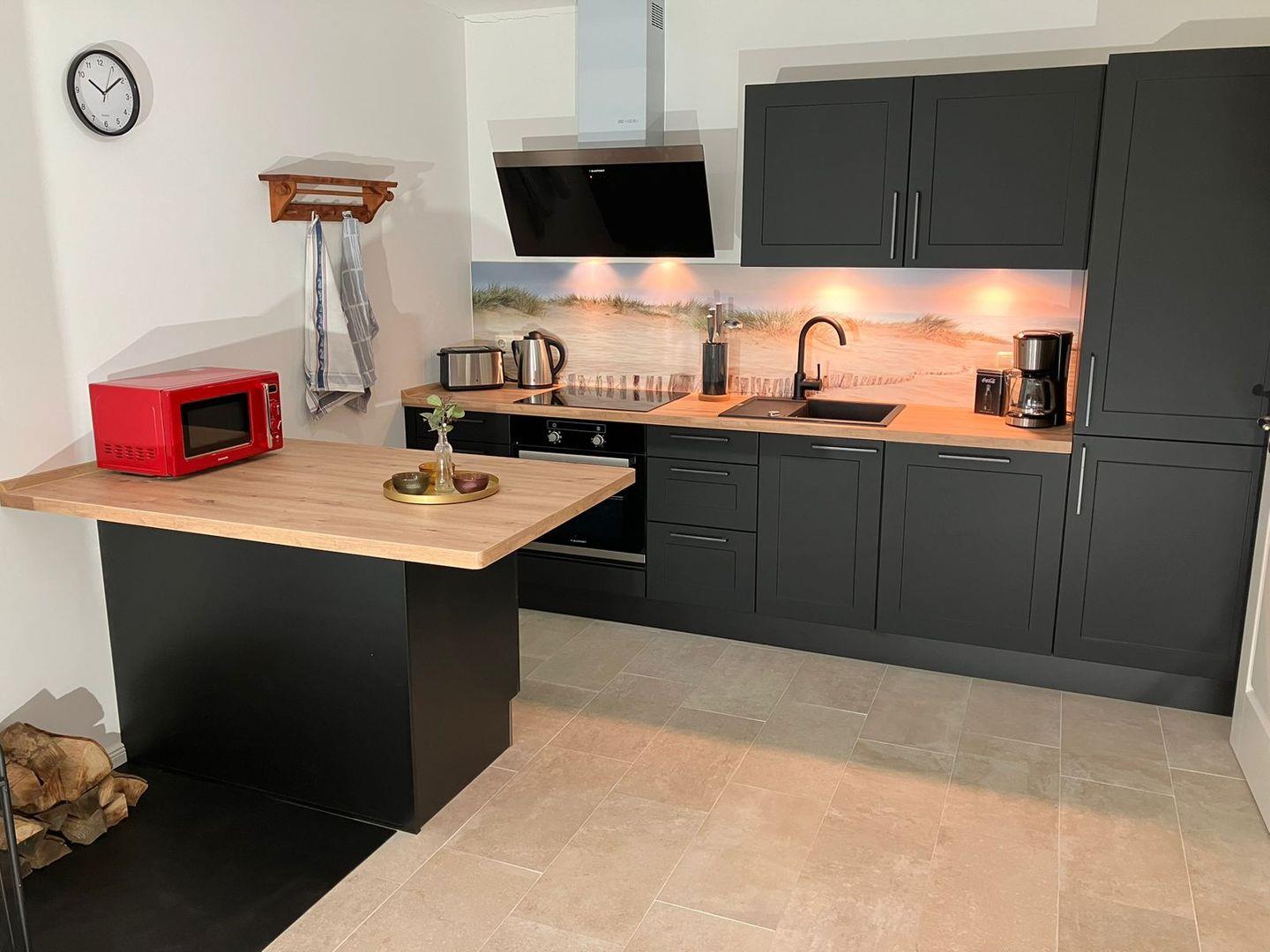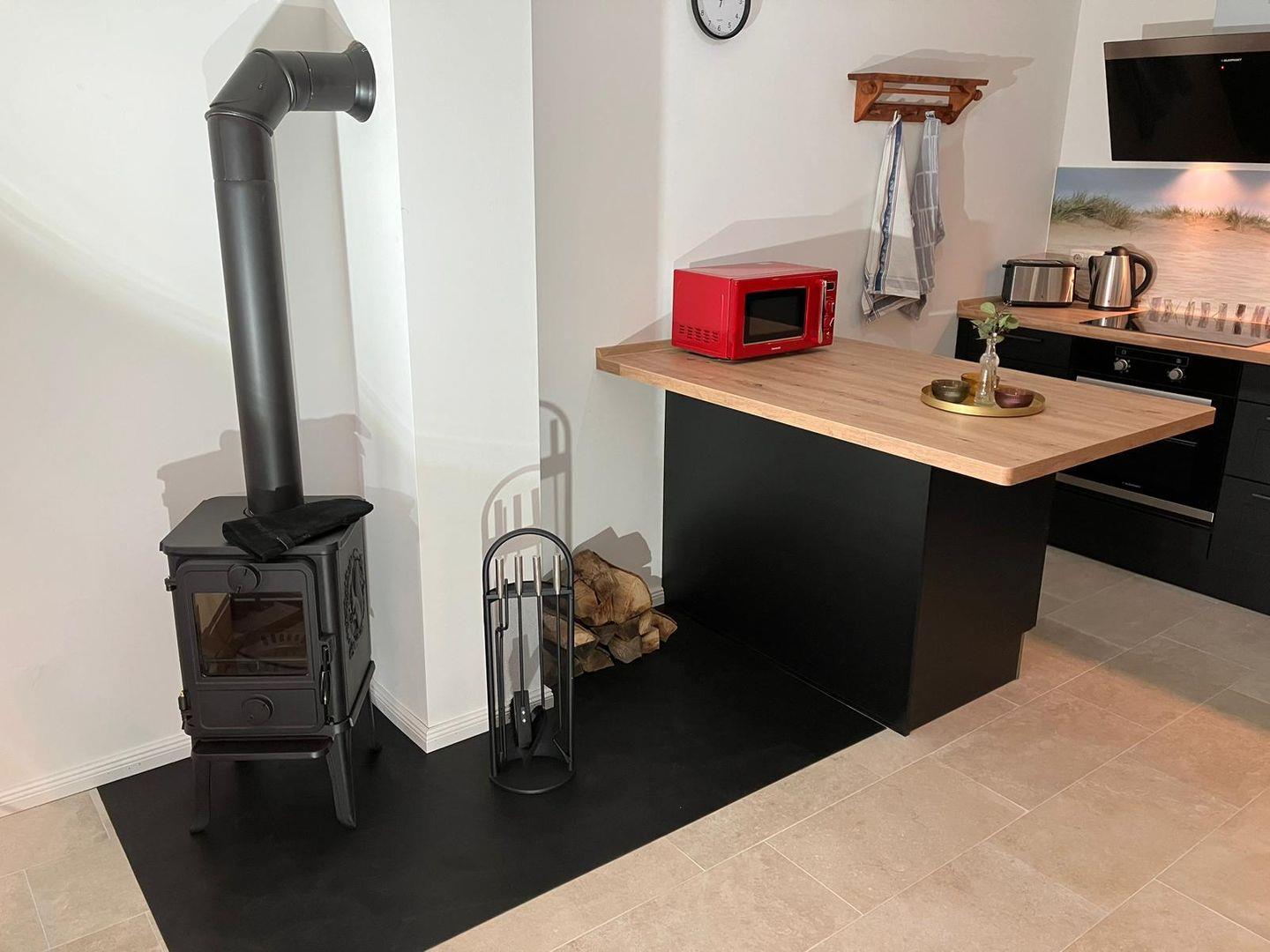 Treten Sie ein in das liebevoll eingerichtete Interieur mit einem großzügigen Wohn- und Essbereich, der mit einer offenen Küche verbunden ist. Hier erwartet Sie ein gemütlicher Kamin, der für wohlige Atmosphäre sorgt. Die voll ausgestattete Küche lässt keine Wünsche offen und verfügt über Mikrowelle, Cerankochfeld, Backofen, Kühlschrank, Spülmaschine, Filterkaffeemaschine, Wasserkocher, Toaster und Mixer.