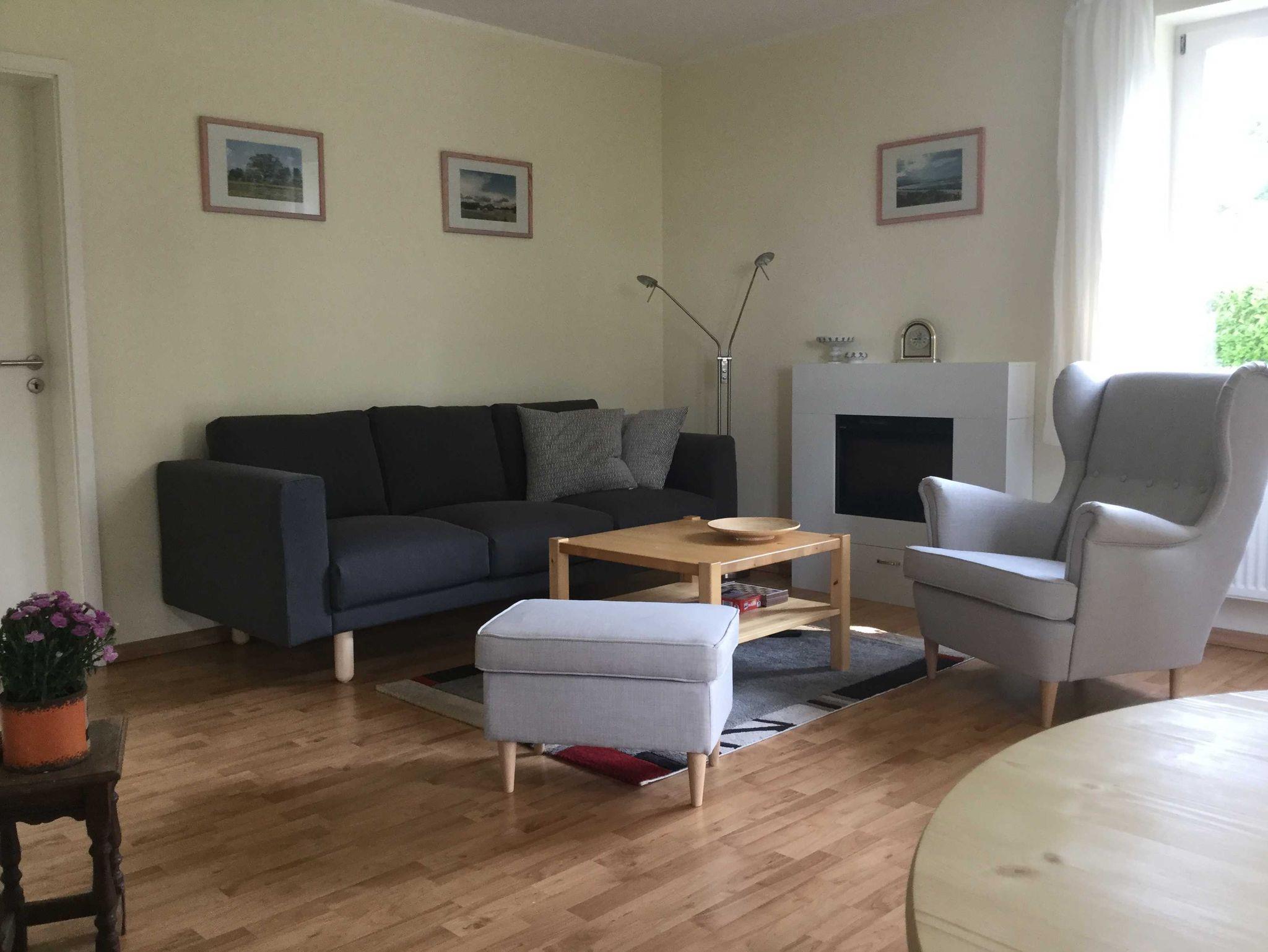 Ausstattung der Fewo: Wohnbereich mit gemütlicher Sitzecke, Esstisch, Sat-TV, Radio, Schlafzimmer mit Doppelbett, Bad mit Dusche, Waschbecken und WC, Küchenzeile im Wohnbereich mit E-Herd, Cerankochfeld, Kühlschrank, Geschirrspüler, Kaffeemaschine/Wasserkocher, Toaster, kompl. Geschirr.