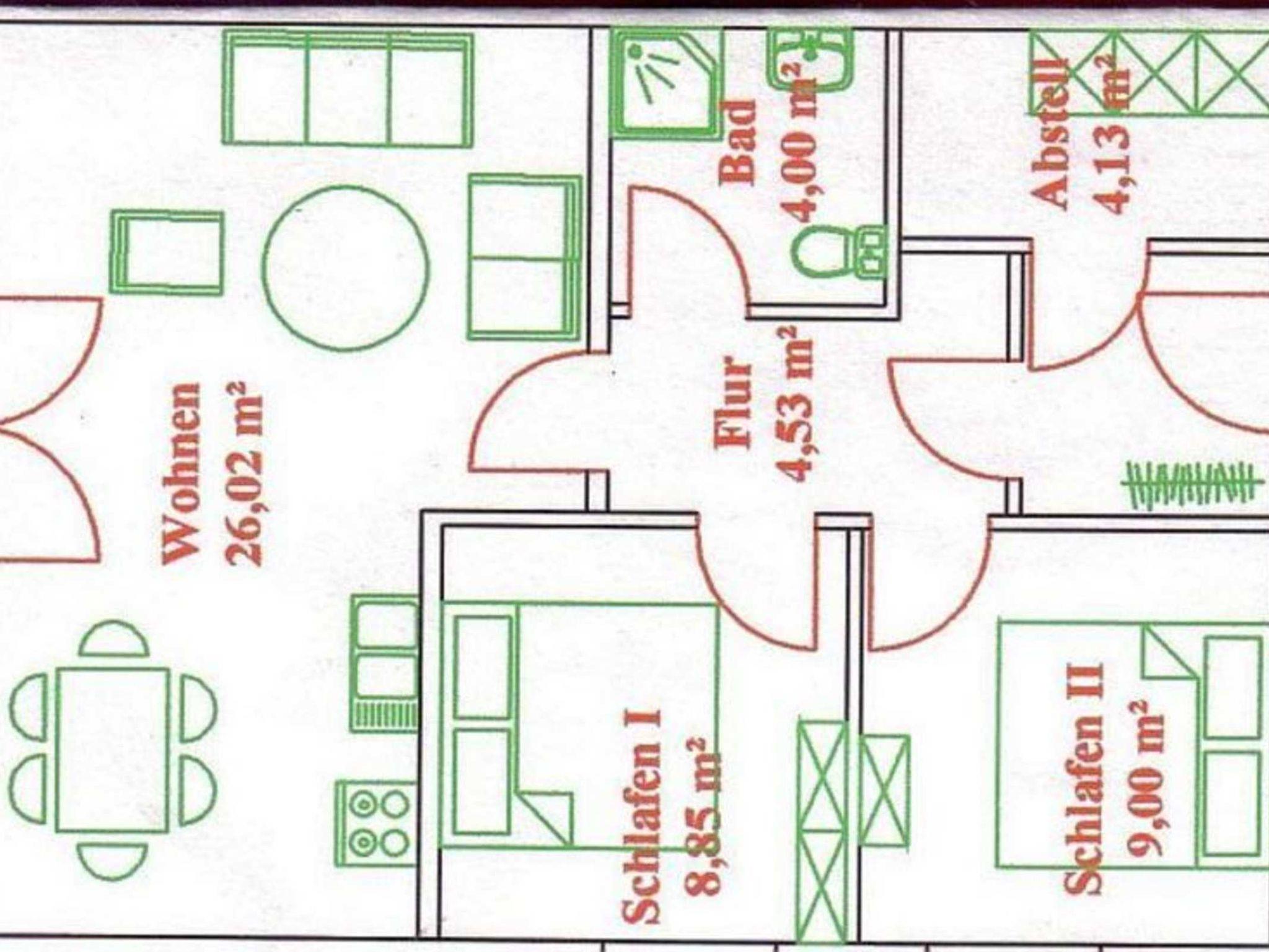 Die Ferienwohnung hat eine Größe von ca. 55 m² und besteht aus zwei Schlafzimmern, Dusche/WC und einem Wohnzimmer.