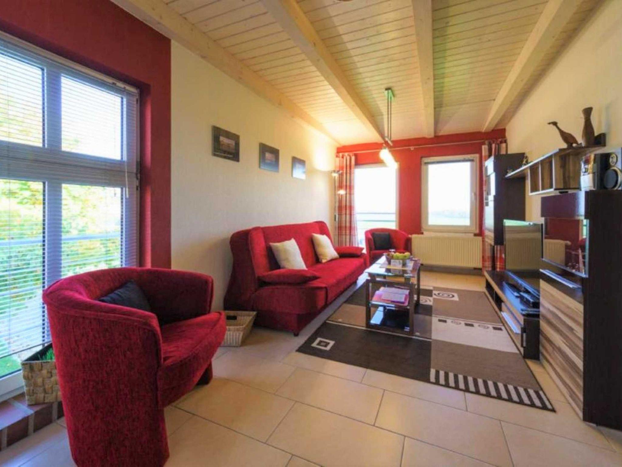 Die Ferienwohnung befindet sich im 1. Obergeschoss (links) des Hauses und ist über eine Außentreppe erreichbar. Genießen Sie vom Balkon aus einen herrlichen Blick über das Haff oder lassen Sie bei einem schönen Sonnenuntergang die Seele baumeln.