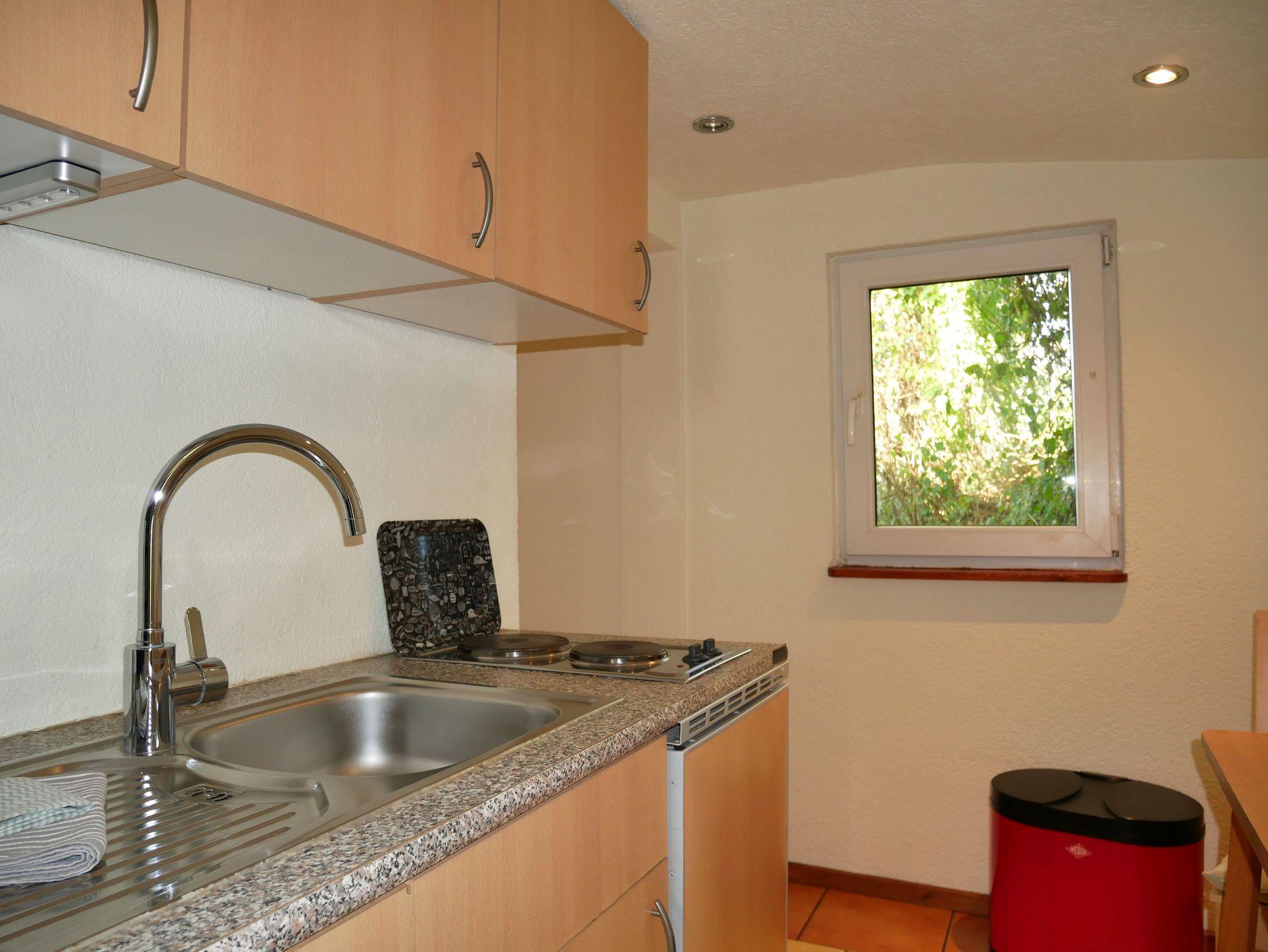 Der einfache, zweckmäßig eingerichtete Nichtraucher-Holzbungalow (ca. 23 qm) verfügt über einen kombinierten Wohn- und Schlafraum mit einem ausziehbarem Tagesbett (Liegefläche ca. 1,60 x 2,00 m), Couchtisch, zwei Stühe, TV und Radio. Die kleine separate Küche ist mit einem Kühlschrank, zwei Elektroherdplatten, Spüle, Wasserkocher, Toaster, Kaffeemaschine und einem Esstisch mit zwei Stühlen eingerichtet. Das Bad verfügt über Dusche & WC. Der Bungalow hat in allen Räumen eine Raumhöhe von 1,98 m und ist mit Laminat bzw. Fliesen ausgestattet. Im Bungalow gibt es keine Türen zwischen den Innenräumen. Die Zimmer sind durch eine Elektroheizung bei Bedarf beheizbar. Die Erstausstattung Bettwäsche ist im Preis enthalten. Handtücher sind bitte mitzubringen. Ein Kinderbett ist auf Anfrage kostenfrei erhältlich. Vor dem Bungalow gibt es eine Sitzgelegenheit im Grünen mit Grillmöglichkeit. Das Rauchen ist im Bungalow nicht gestattet, Sie können aber die überdachte Terrasse nutzen. Es ist KEIN Internet via WLAN vorhanden.