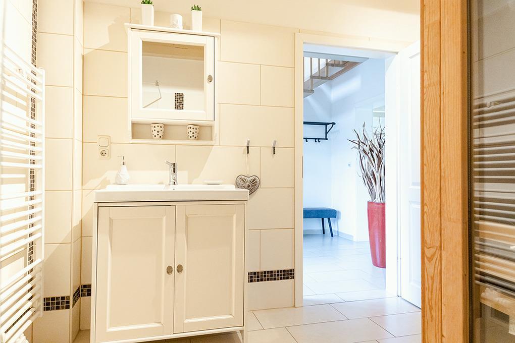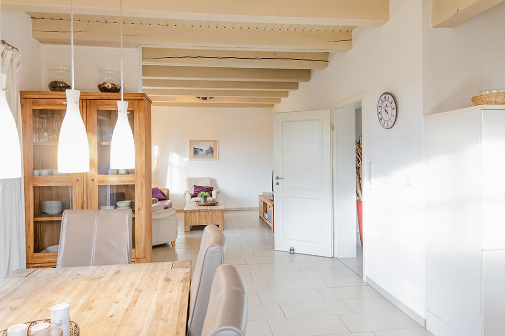 D 29.20 Ferienhaus 1-6 Pers.: Komfortables 4-Zimmerhaus mit 110 qm Wohnfläche über 2 Etagen. Parterre: Gemütlicher Wohn-/Essraum mit Kaminofen, Couchgarnitur, Sat-TV, DVD-Player, Radio-CD, Esstisch, sehr gut ausgestatteter Einbauküche (Backofen, Mikrowelle, Spülmaschine). Schöner Saunaraum mit Dusche und WC. 1. Etage: Drei Doppelzimmer, davon eines mit zwei Einzelbetten. Komfortables Bad mit Eckbadewanne, Dusche, Wb, WC.