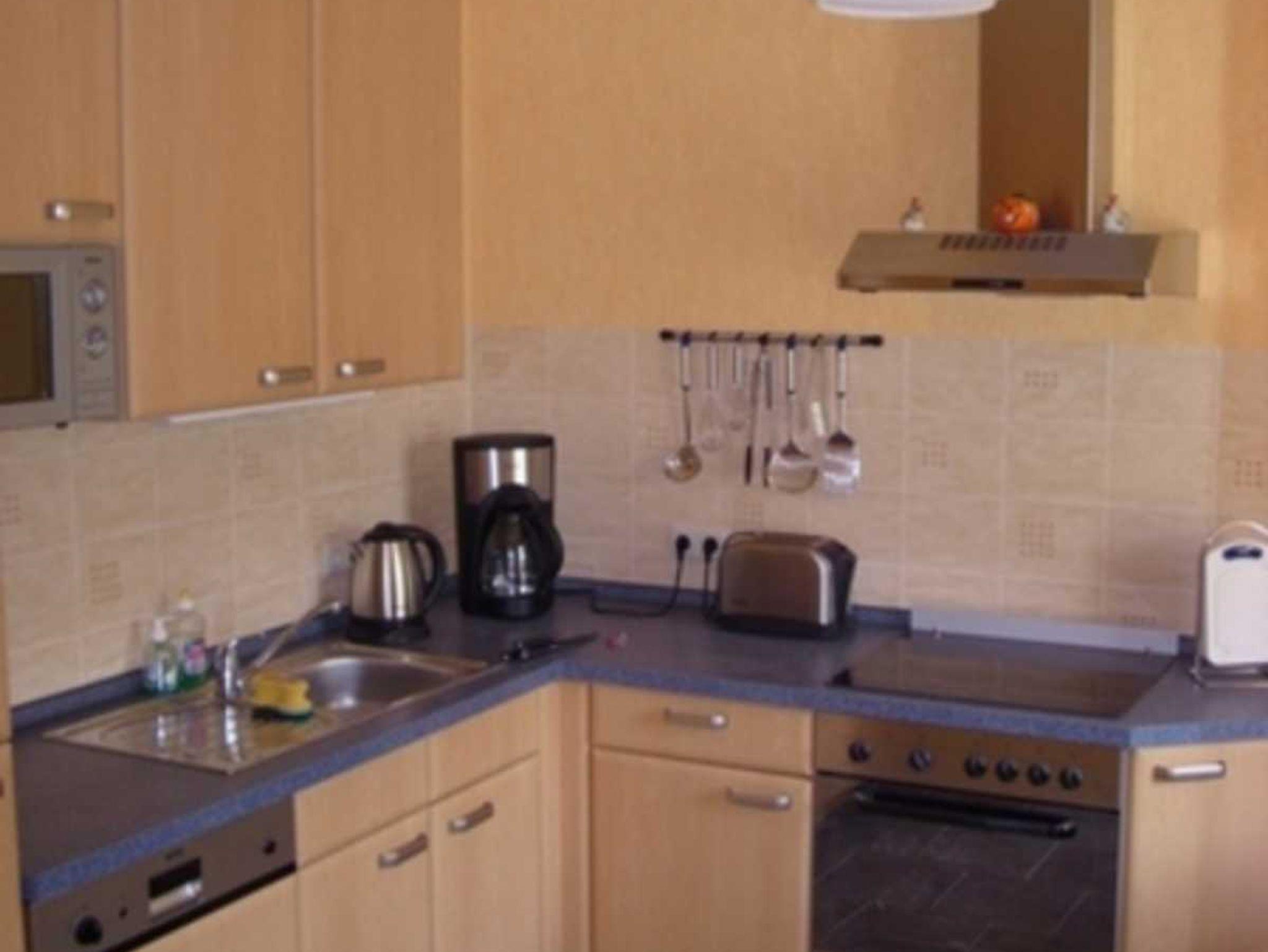 Im Erdgeschoss befindet sich der Eingangsbereich mit Garderobe und Treppe zu den oberen Zimmern. Die Küche ist komplett eingerichtet mit einem Esstisch, E-Herd, Geschirrspüler, Mikrowelle, Kühlschrank mit extra Gefrierfach, Kaffeemaschine, Toaster, Wasserkocher.
