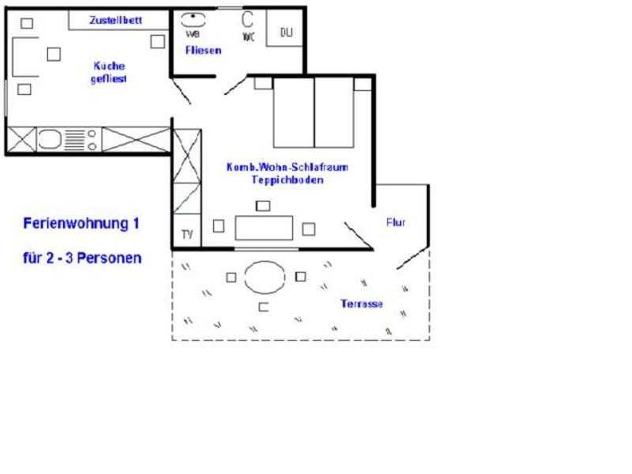 1 komb. Wohn u. Schlafzimmer bis 2 Personen, Küche, Du/WC, Sat/TV/Radio, Garten, Terrasse mit Sitzecke, Grill, Parterre, sep. Eingang, Bettwäsche und Handtücher pro Person 12,00 Euro oder selbst mitbringen, Gaststätten, Einkaufsmöglichkeiten (Aldi, Netto) und Bäcker 2 min., Nichtraucherwohnung, Parkplatz vor dem Haus, Garage mietbar, Strom und Wasser nach Verbrauch bei Abreise (Zähler sind vorhanden)