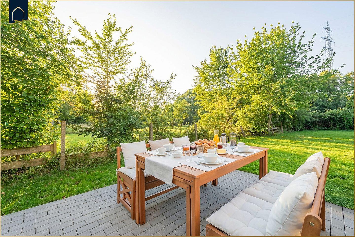 Ein gepflegter Garten mit einladenden Sonnenliegen sowie eine möblierte Terrasse schaffen den perfekten Ort zum Abschalten und Genießen.. Für entspannte Grillabende steht ein Grillplatz zur Verfügung. Der überdachte Balkon eröffnet einen weiten Blick über die ländliche Umgebung und gewährt wunderschöne Ausblicke in die Natur.