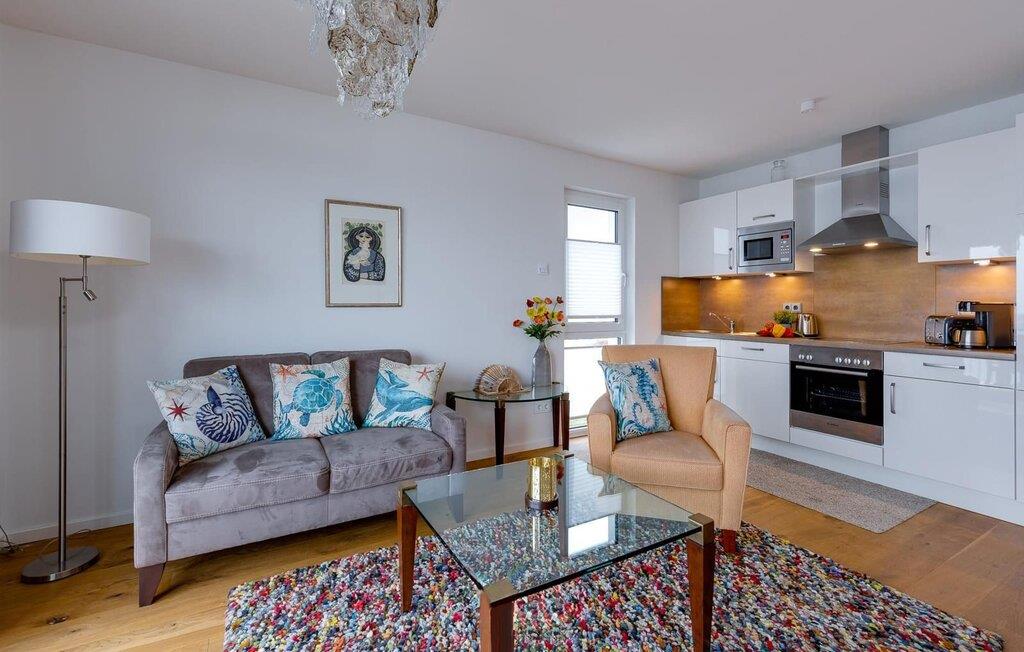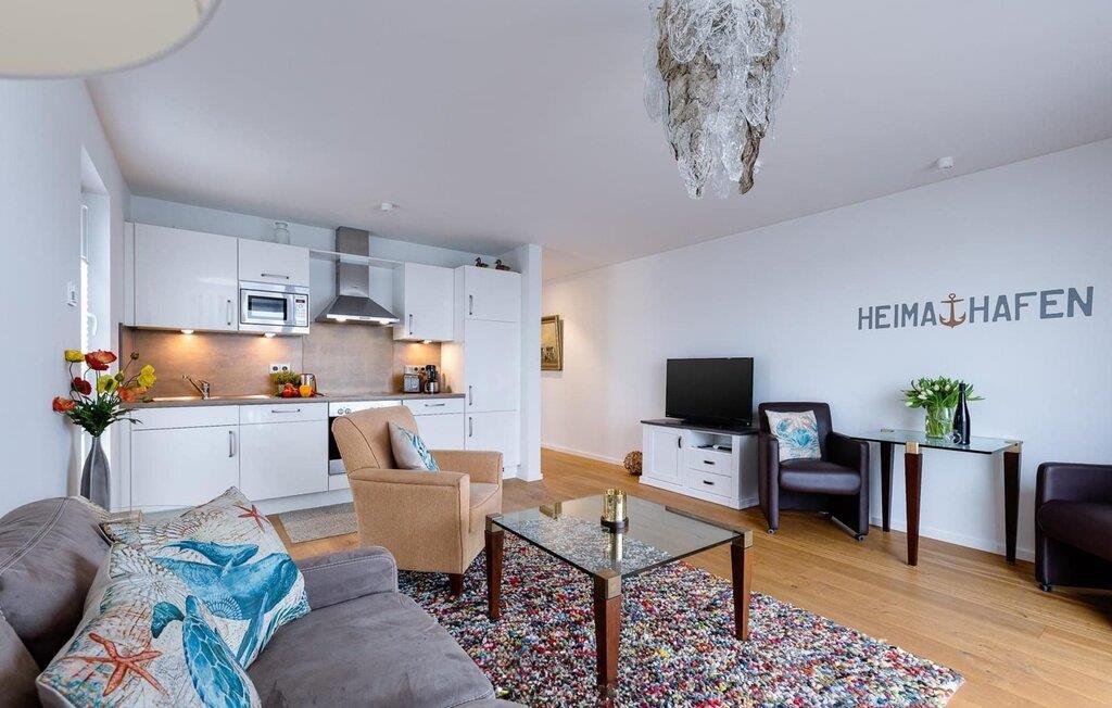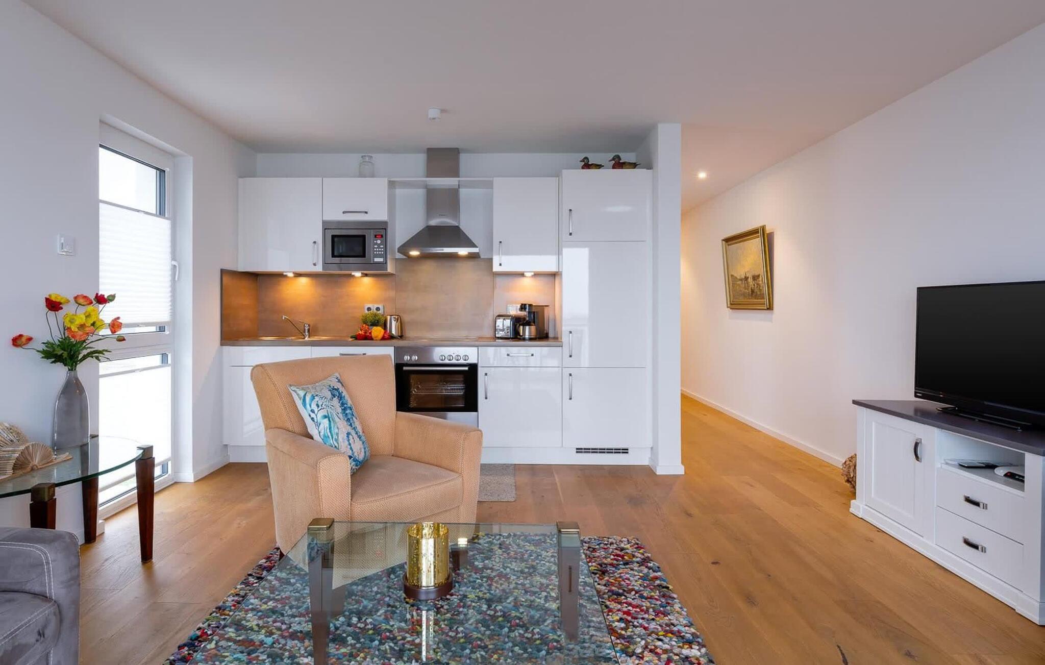 Über den Dingen gelegen lassen sich vorbeifahrende Segelschiffe bei der Ostseeeinfahrt aus dem kompletten Wohn- /Essbereich und dem Balkon aus beobachten. Der Blick fällt auf den Leuchtturm von Schleimünde und die Idylle des Landschaftsschutzgebiets drum herum. Die Hafenpromenade des OstseeResort Olpenitz mit wachsendem Angebot befindet sich direkt unterhalb der Ferienwohnung und lädt zum Flanieren ein. Zusätzliches Entertainment bietet das Telekom Home Entertainment Programm auf dem Flatscreen-TV im Wohnzimmer.