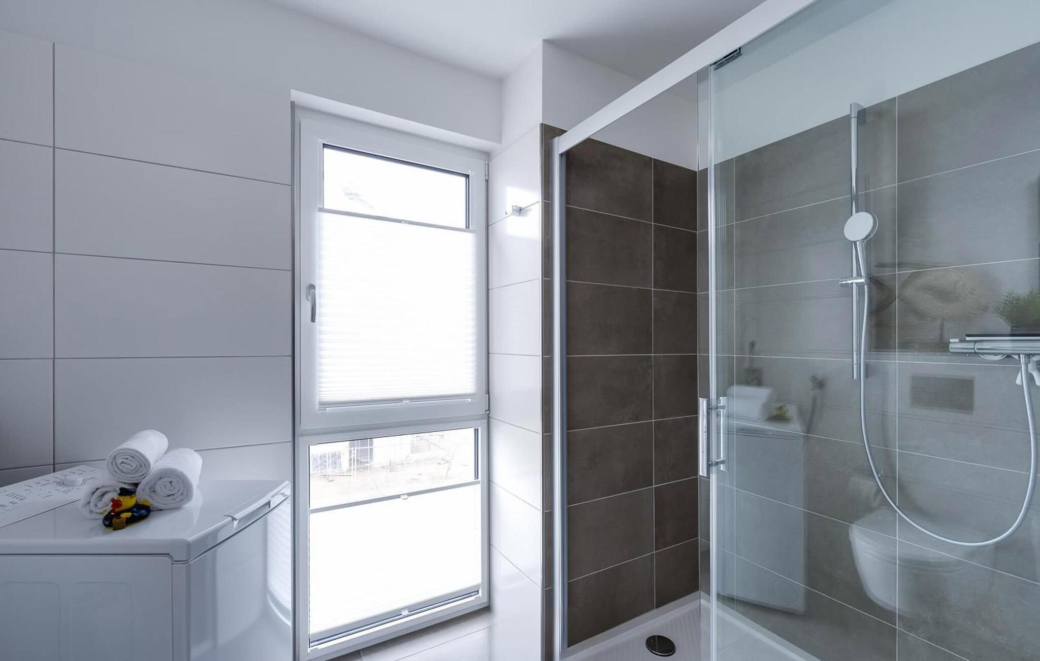Das Duschbad verfügt über eine große bodengleiche Dusche. Die Ecklage der Wohnung bietet auch in diesem Zimmer den Komfort eines Außenfensters mit Blick über die Promenade.
