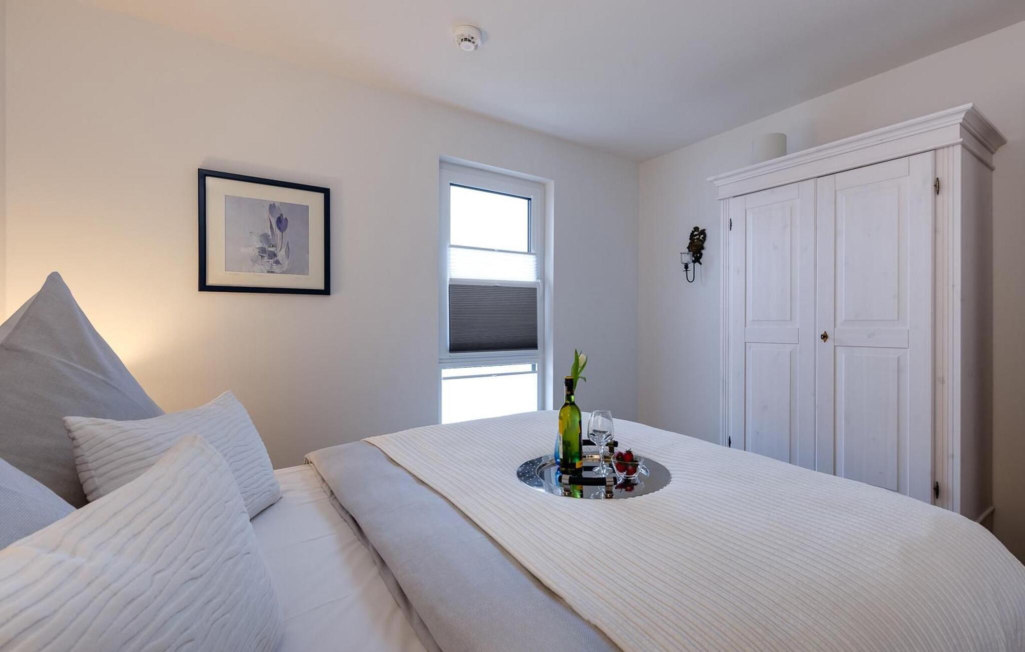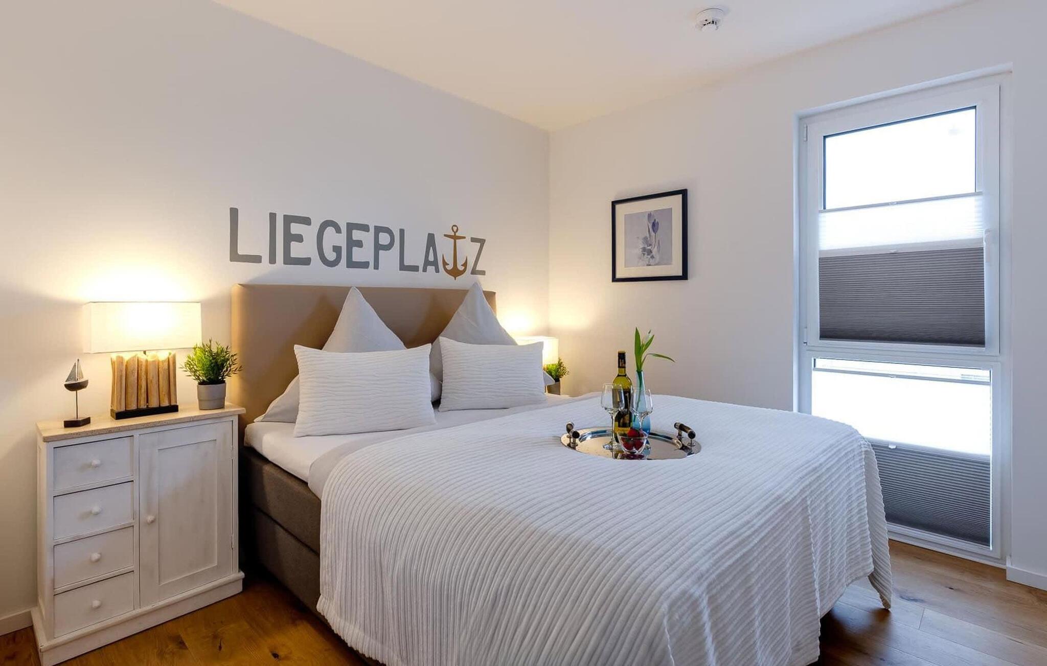 Erholsamen Urlaubsschlaf bietet das gemütliche Schlafzimmer ausgestattet mit einem hohen Boxspring-Doppelbett. Durchs Fenster dürfen Frühaufsteher hier traumhafte Sonnenaufgänge beobachten.