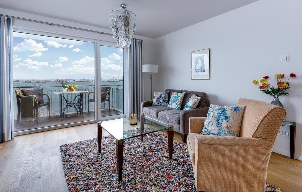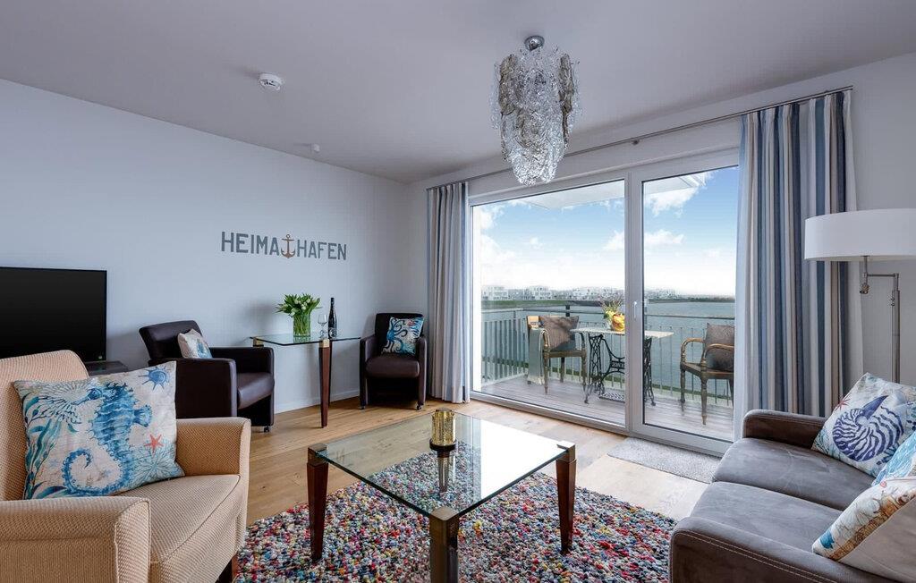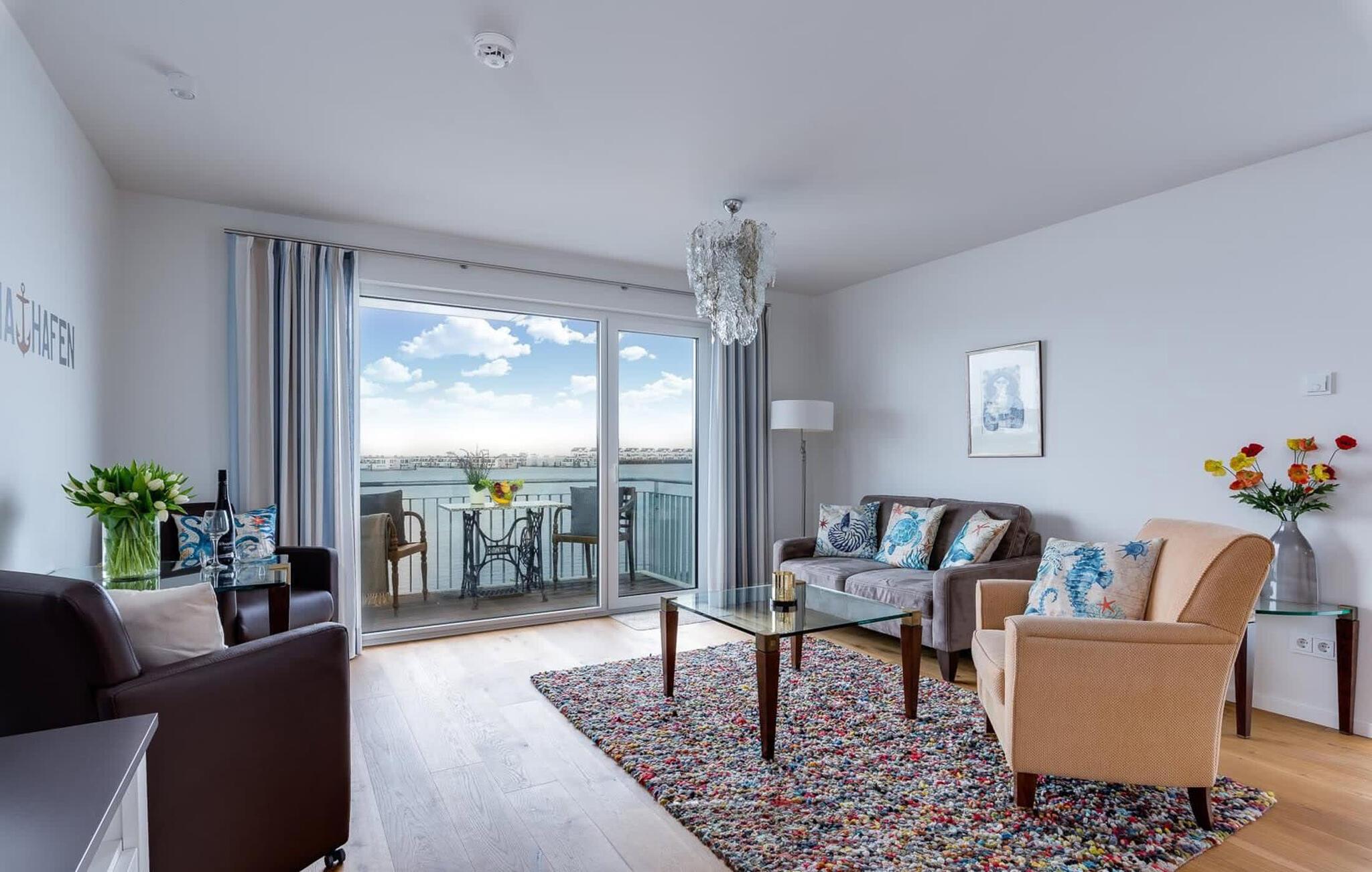 Moderne Ferienwohnung mit Balkon und weitem Blick über den Hafen des OstseeResort Olpenitz.