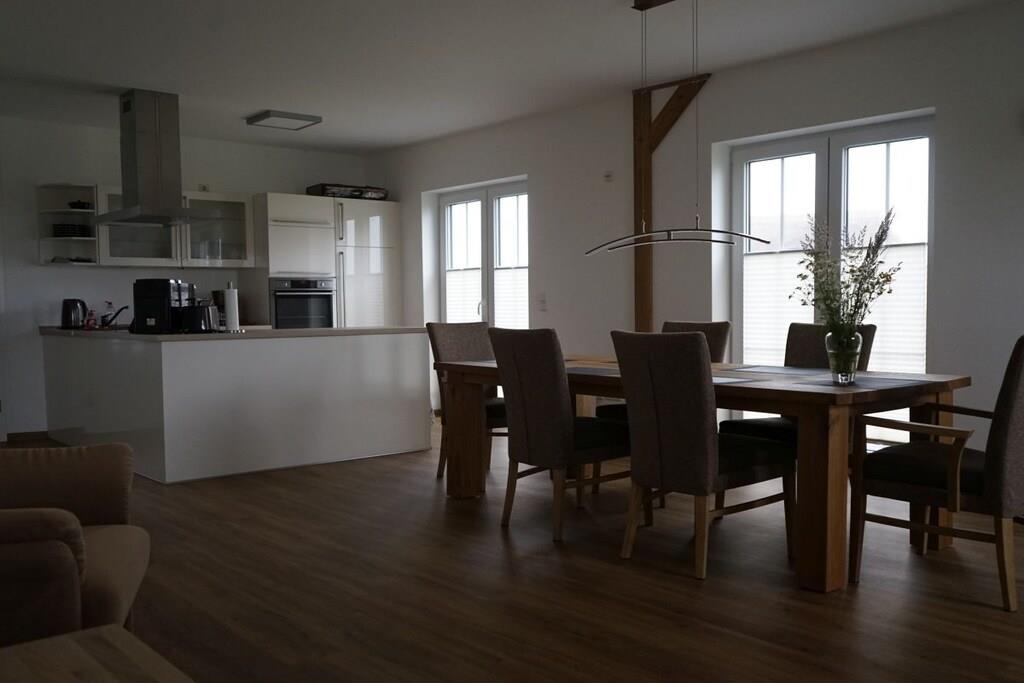 Die Doppelhaushälfte bietet auf drei Etagen einen hohen Ausstattungsstandard. Die Haushälfte ist für die Nutzung durch max. 4 Erwachsene, 1 Kind bis 5 Jahre und 1 Kind bis 2 Jahre konzipiert. Es ist eines unser Anliegen , einen Sitz- und Schlafkomfort von hohem Standard und wellnessbezogene Entspannung zu bieten. Eines der Bäder ist mit einem Whirlpool ausgestattet. Im Dachgeschoss befinden sich eine Sauna für 4 Personen und Ruheliegen. Im Wohnzimmer erhalten Sie per Knofpdruck Wärme und Gemütlichkeit durch einen Gaskamin. Der Ausstattungsgrad der offenen Küche ist hoch. Selbige ist großzügig konzipiert, sodass selbst Zubereitung und Präsentation der Speisen ein Urlaubshöhepunkt darstellen könnte.Das Masterschlafzimmer ist mit einem Boxspringbett ausgestattet. Ein weiteres Highlight in dem Zimmer ist der dauerhaft phosphorierende Sternenhimmel.