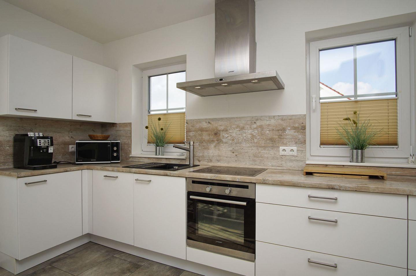 KÜCHE // offene Küche, 4-Platten Induktion, Kühlschrank mit Gefrierfach, Backofen, Mikrowelle, Toaster, Wasserkocher, Kaffeemaschine, reichlich Besteck, Geschirr und Küchenutensilien ++