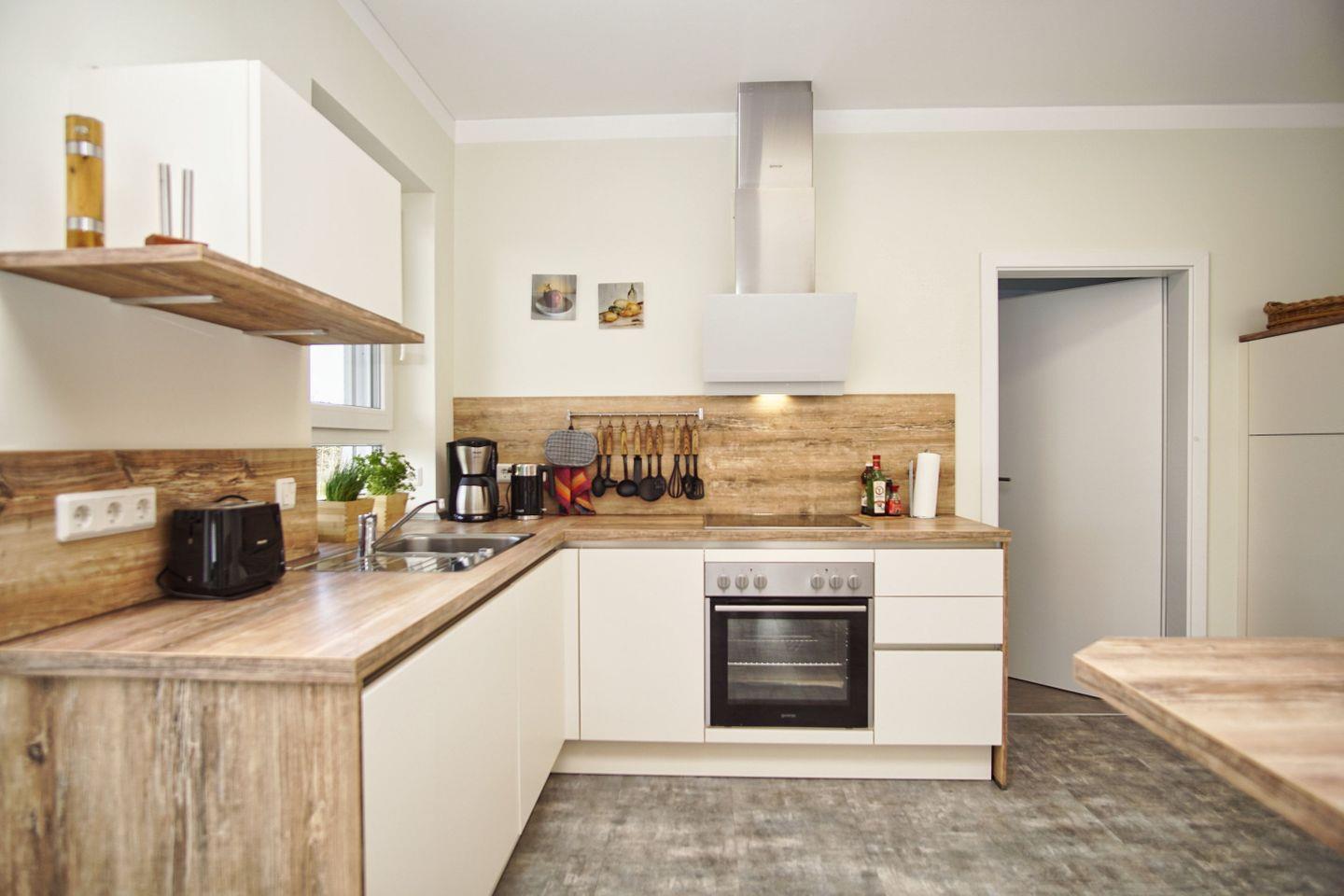 KÜCHE // offene Küche, 4-Platten Ceranfeld, Kühlschrank mit Gefrierfach, Backofen, Mikrowelle, Toaster, Wasserkocher, Kaffeemaschine, reichlich Besteck, Geschirr und Küchenutensilien ++