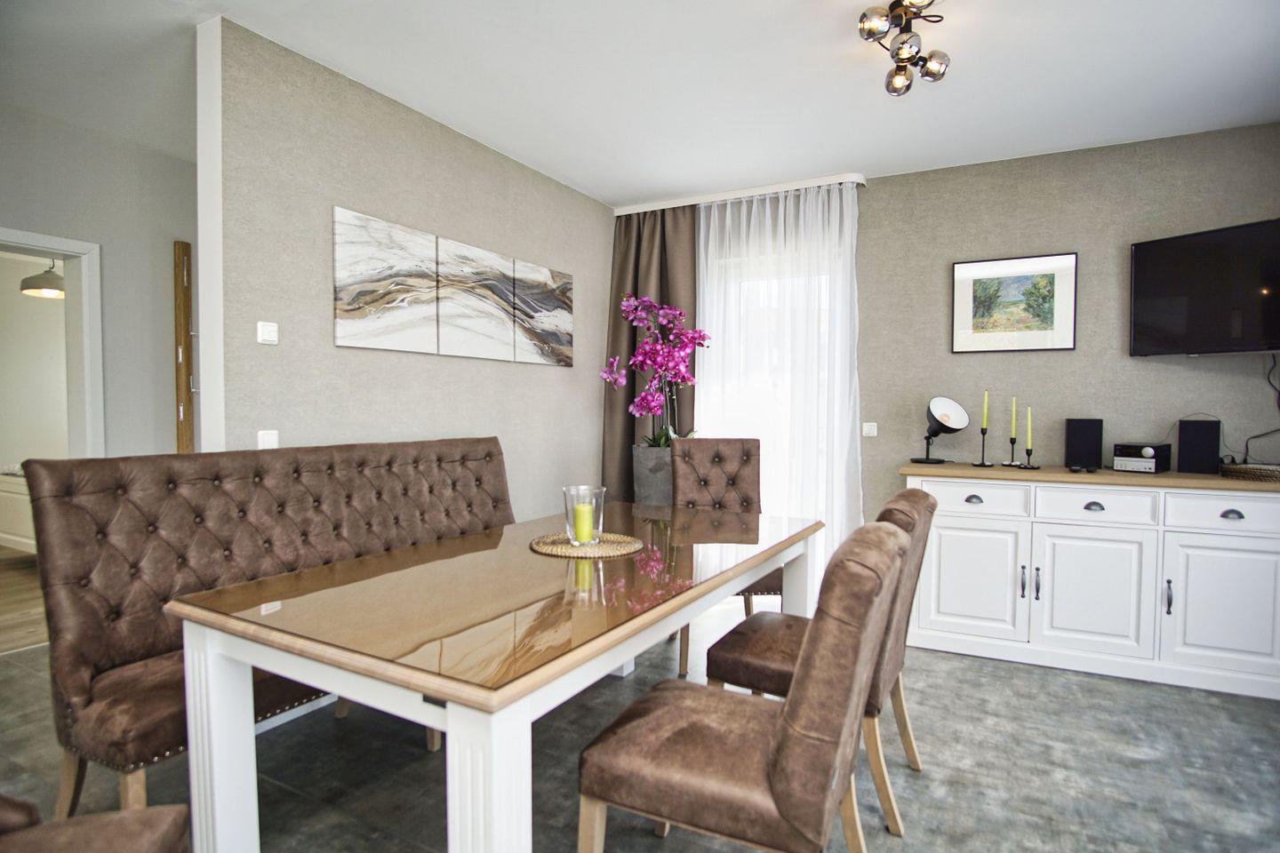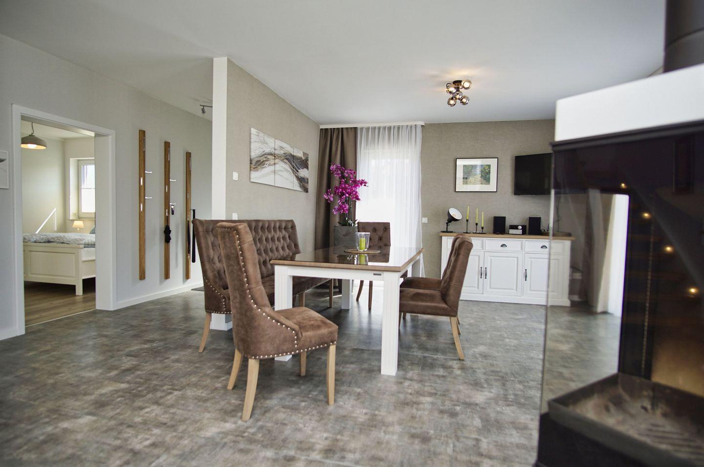 WOHNEN // Wohnraum mit Essbereich, Sitzgarnitur mit bequemer Couch, Kaminofen, Smart-TV ++